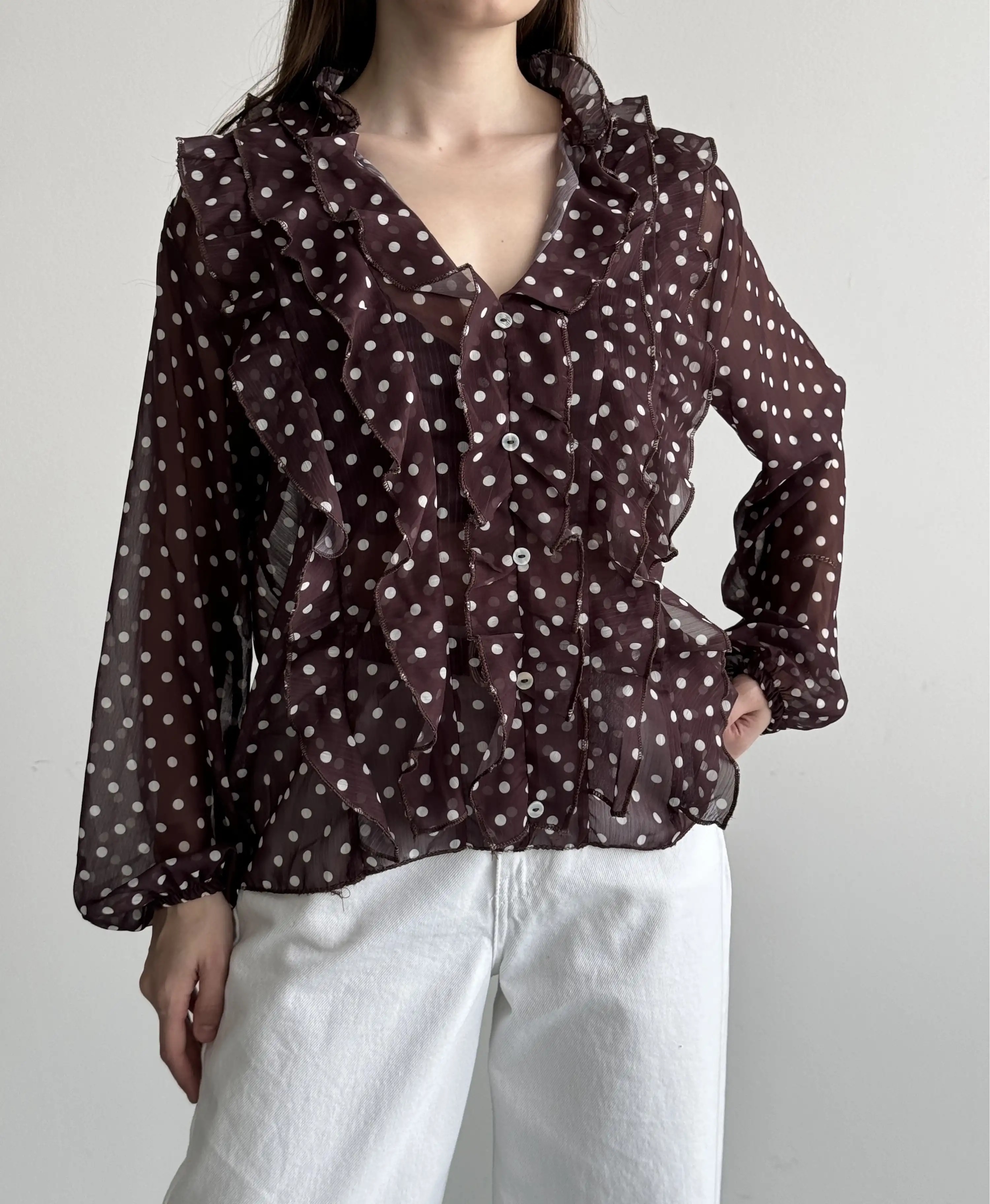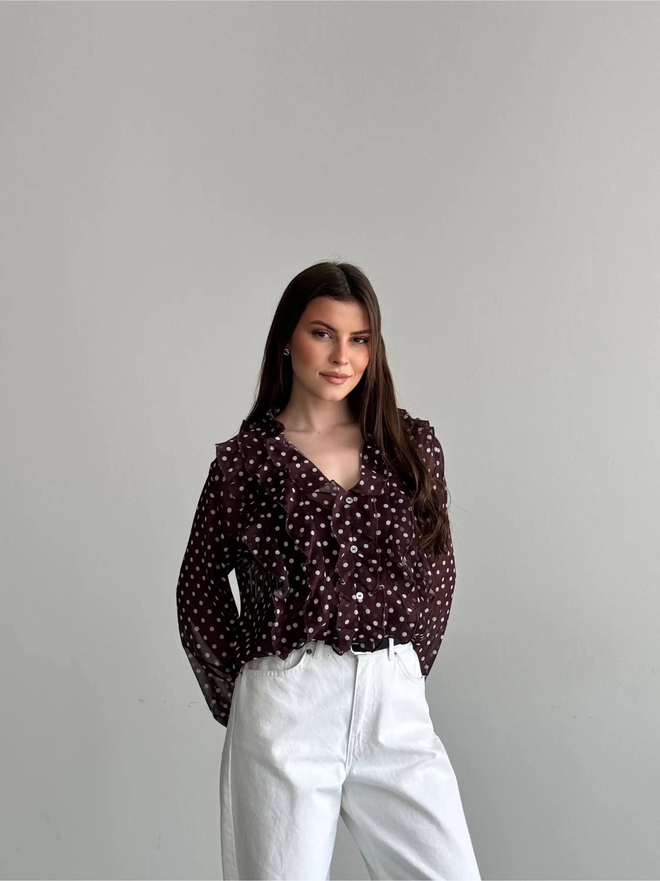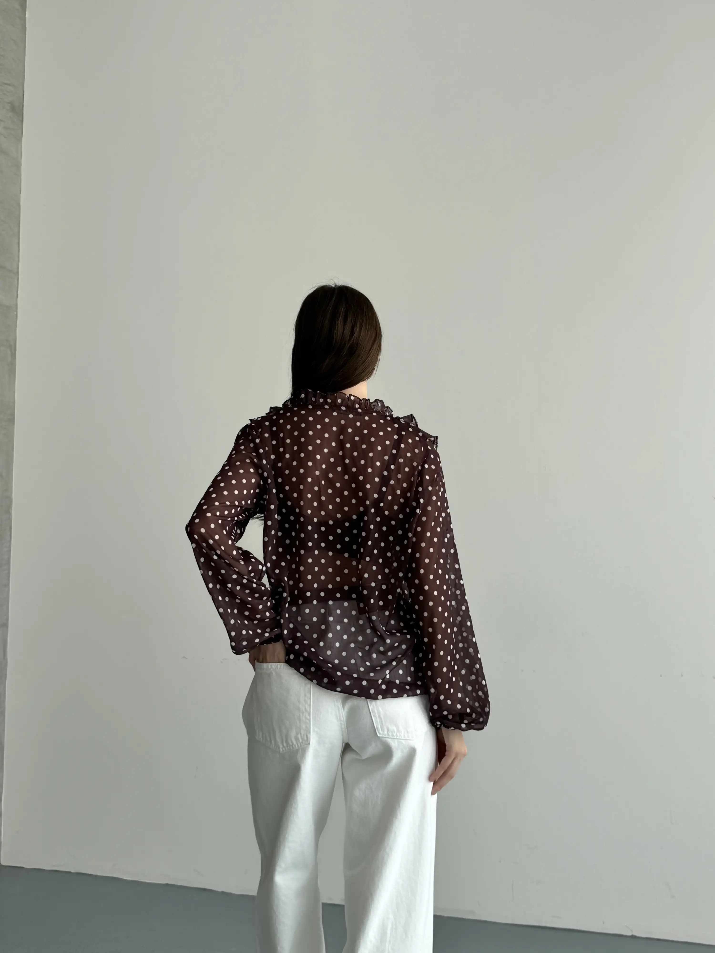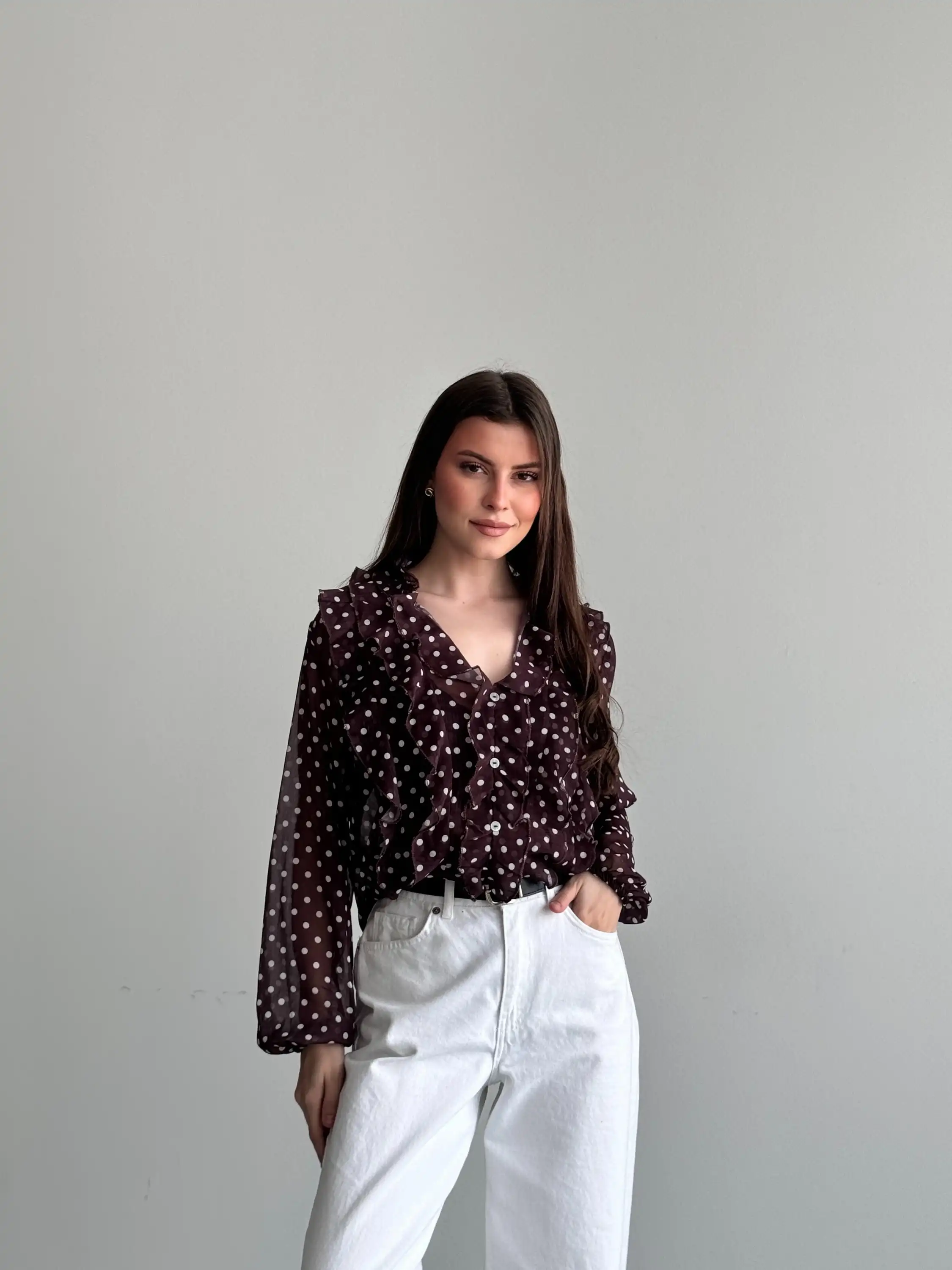 PUANTİYELİ FIRFIR DETAYLI BLUZ-KAHVE