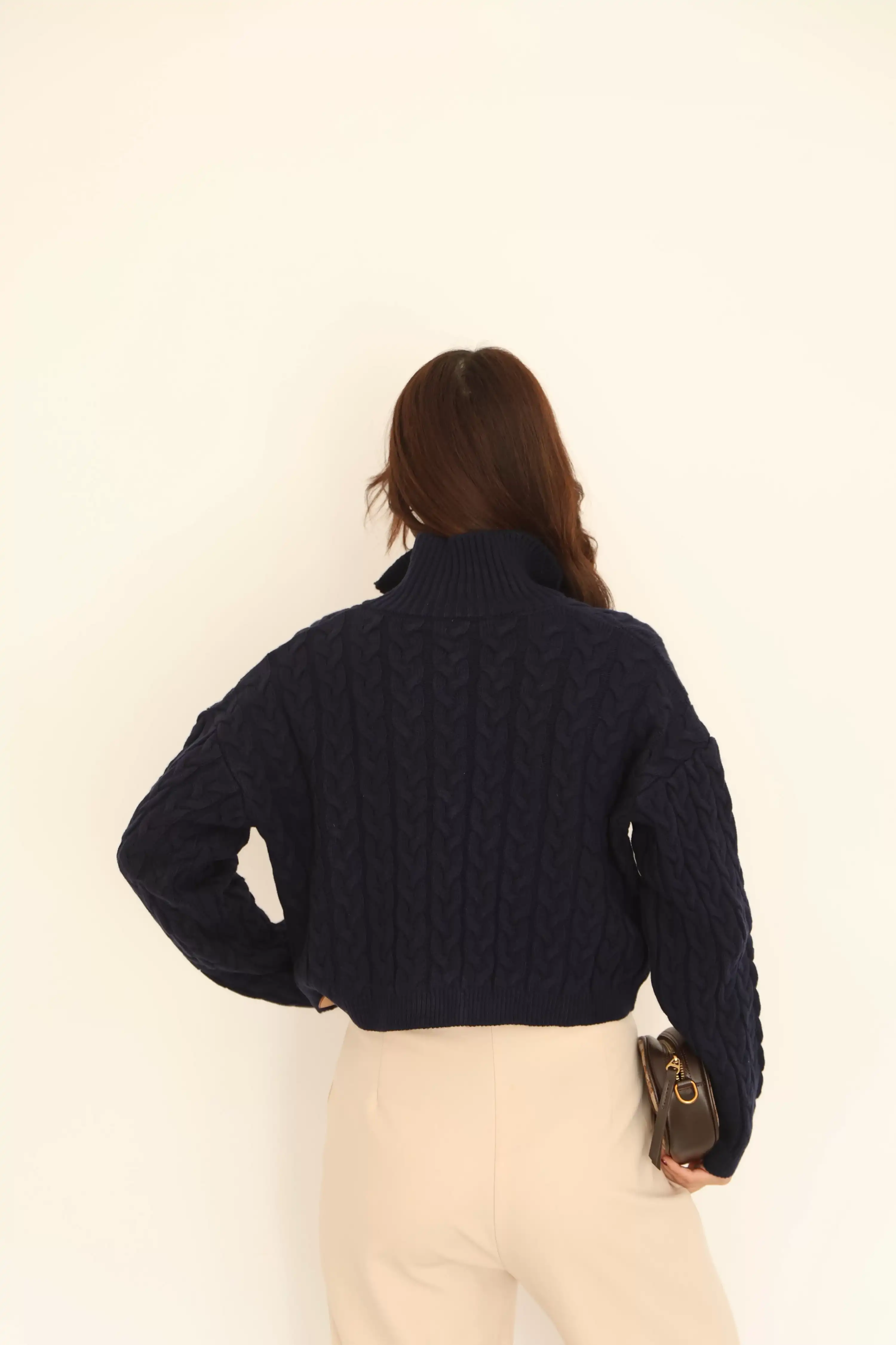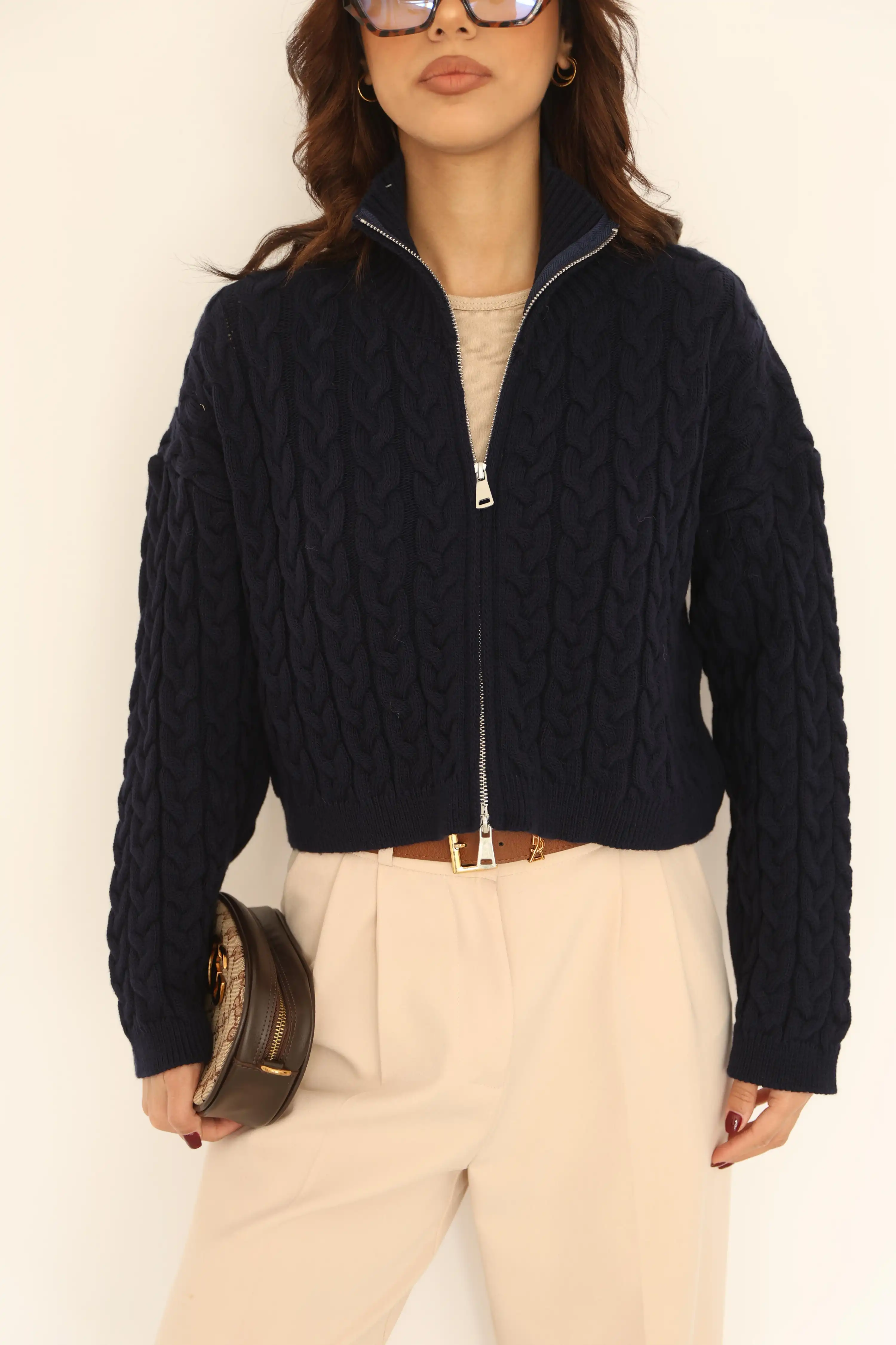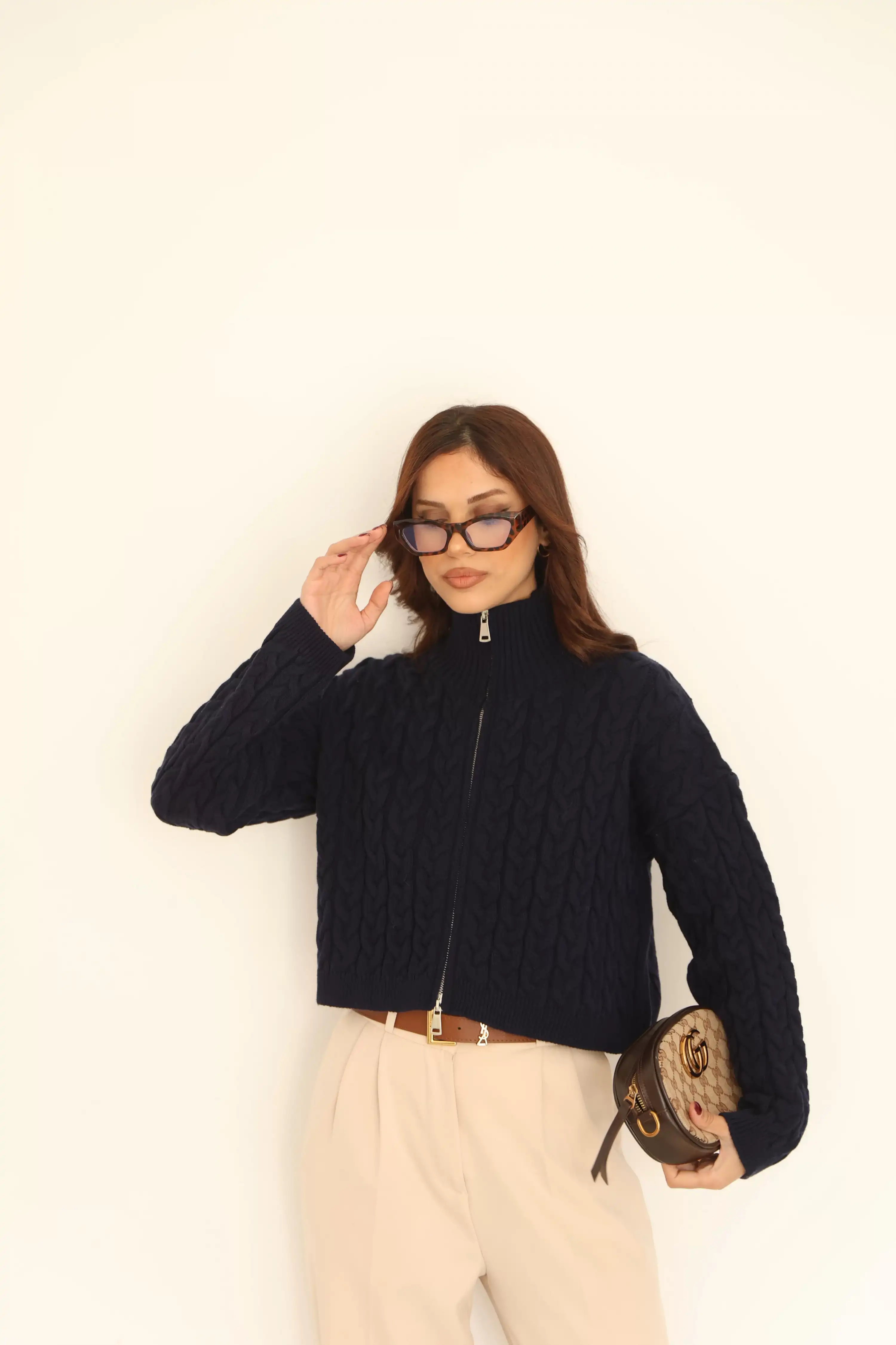 SAÇ ÖRGÜLÜ FERMUARLI TRİKO HIRKA-LACİVERT