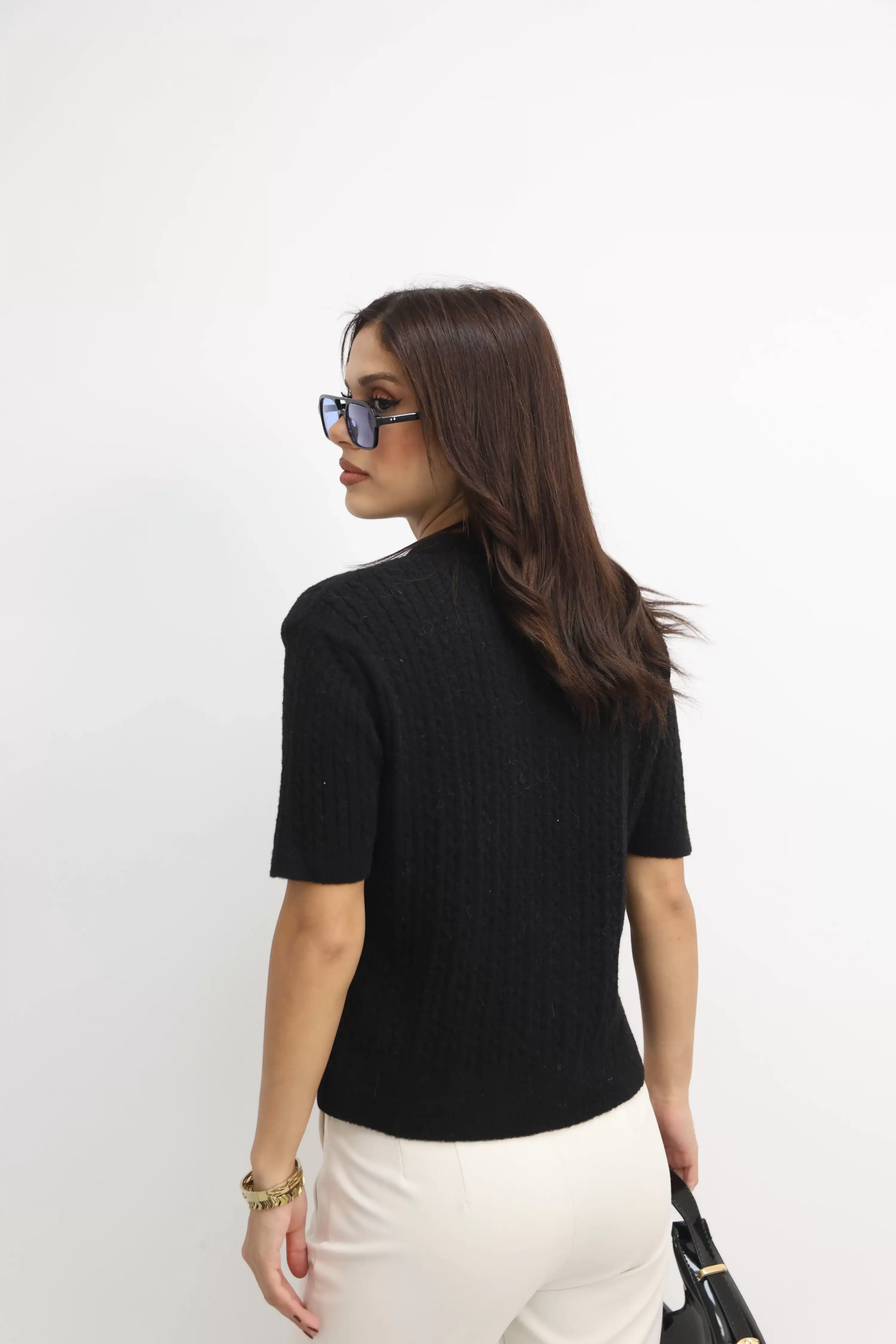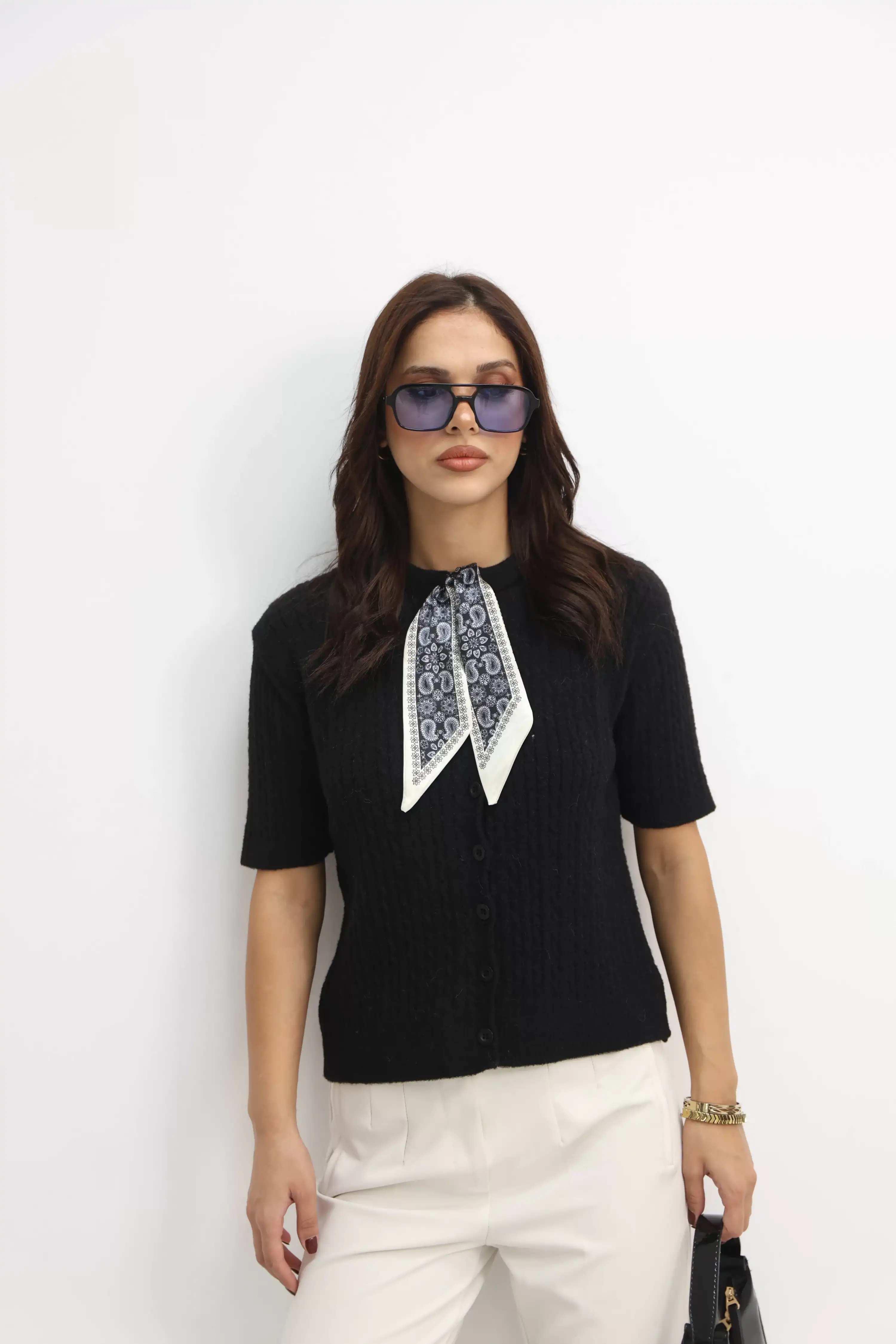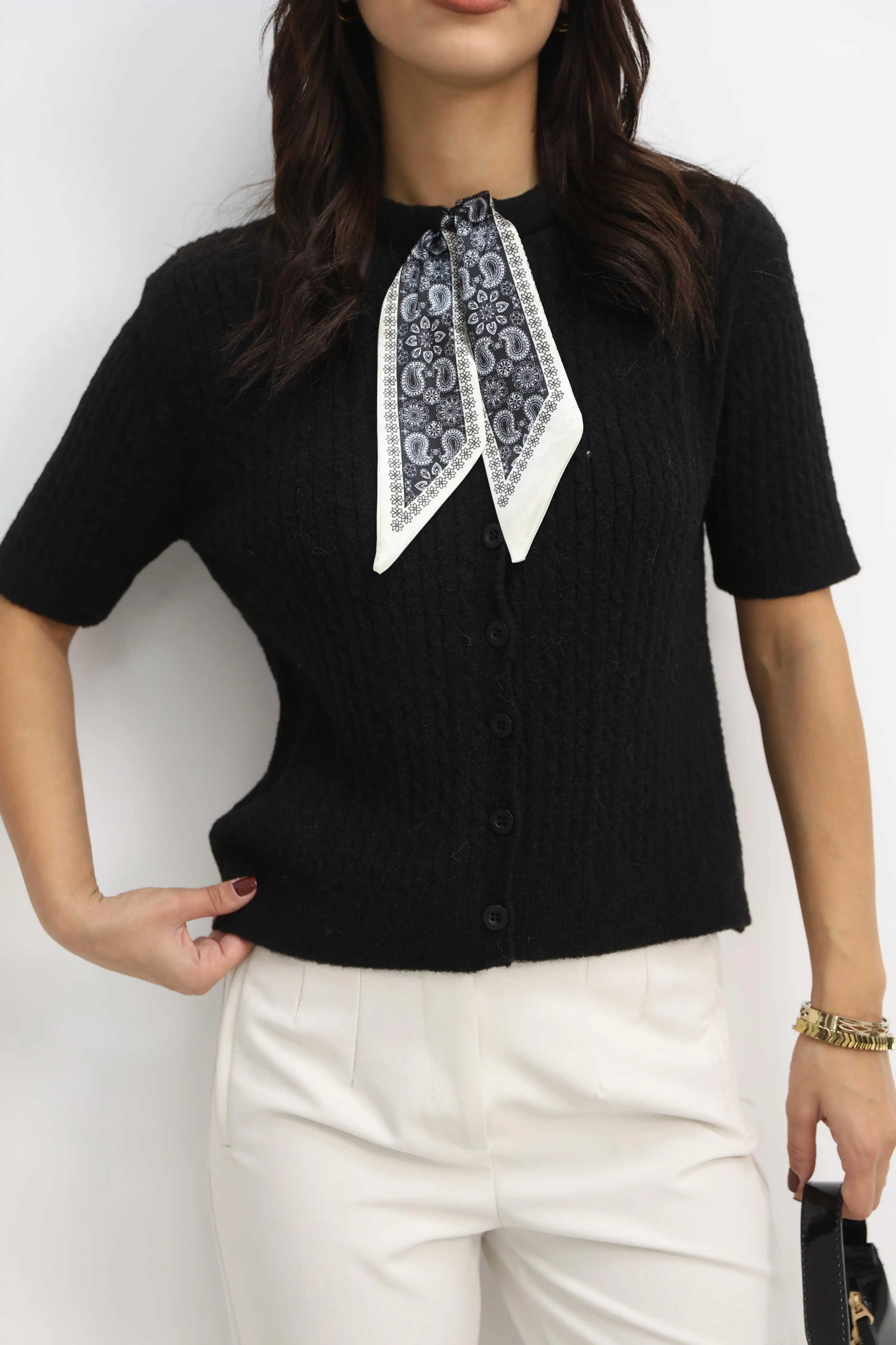 ŞAL DETAYLI KISA KOL TRİKO HIRKA-SİYAH