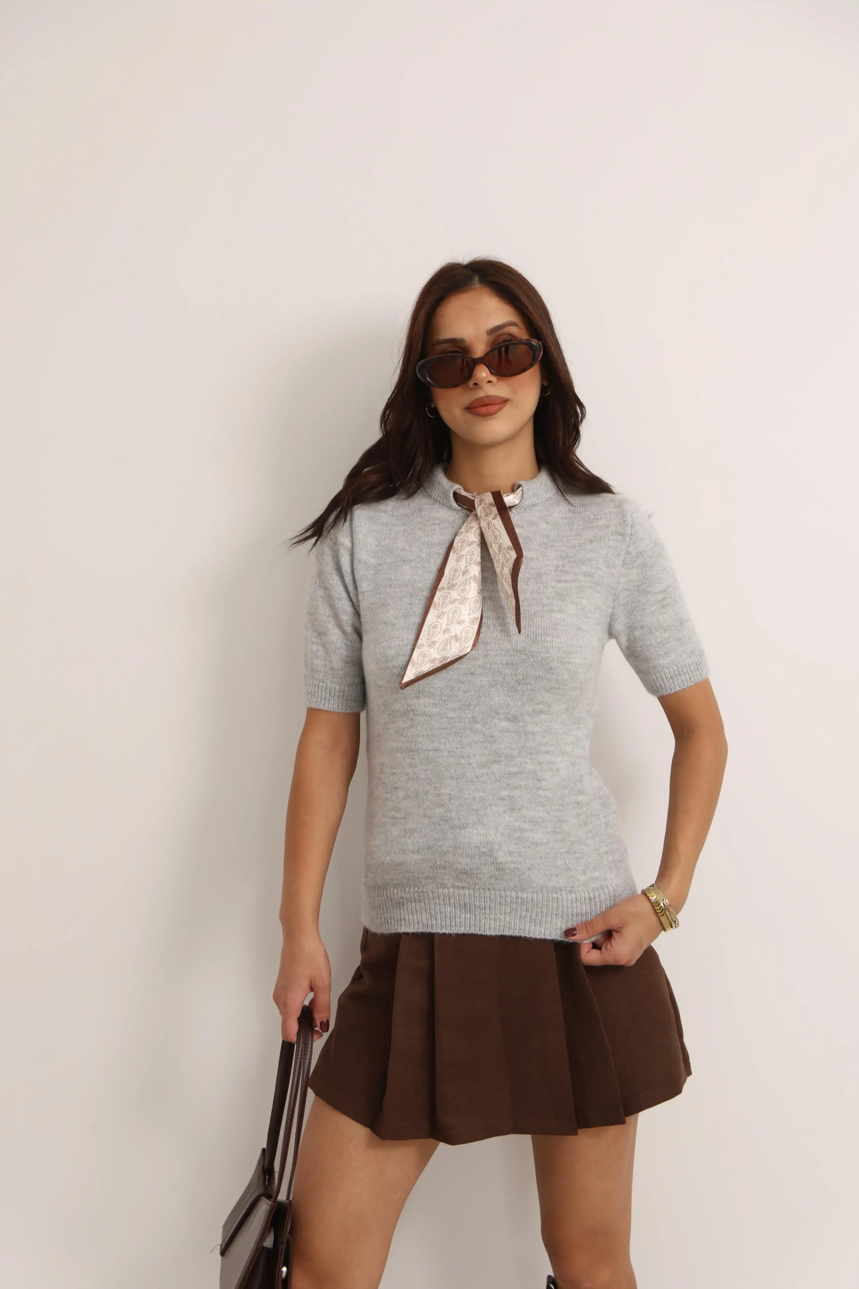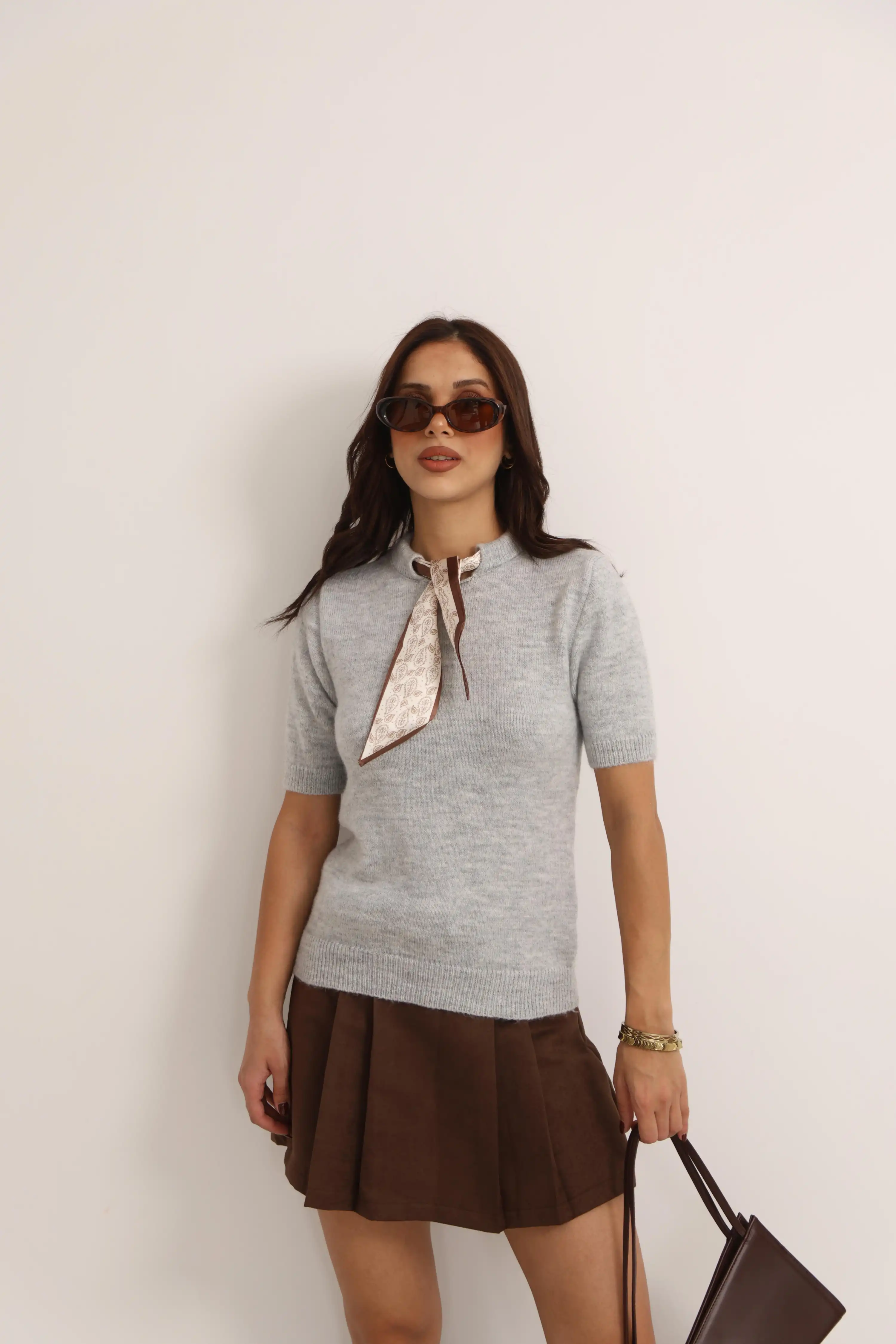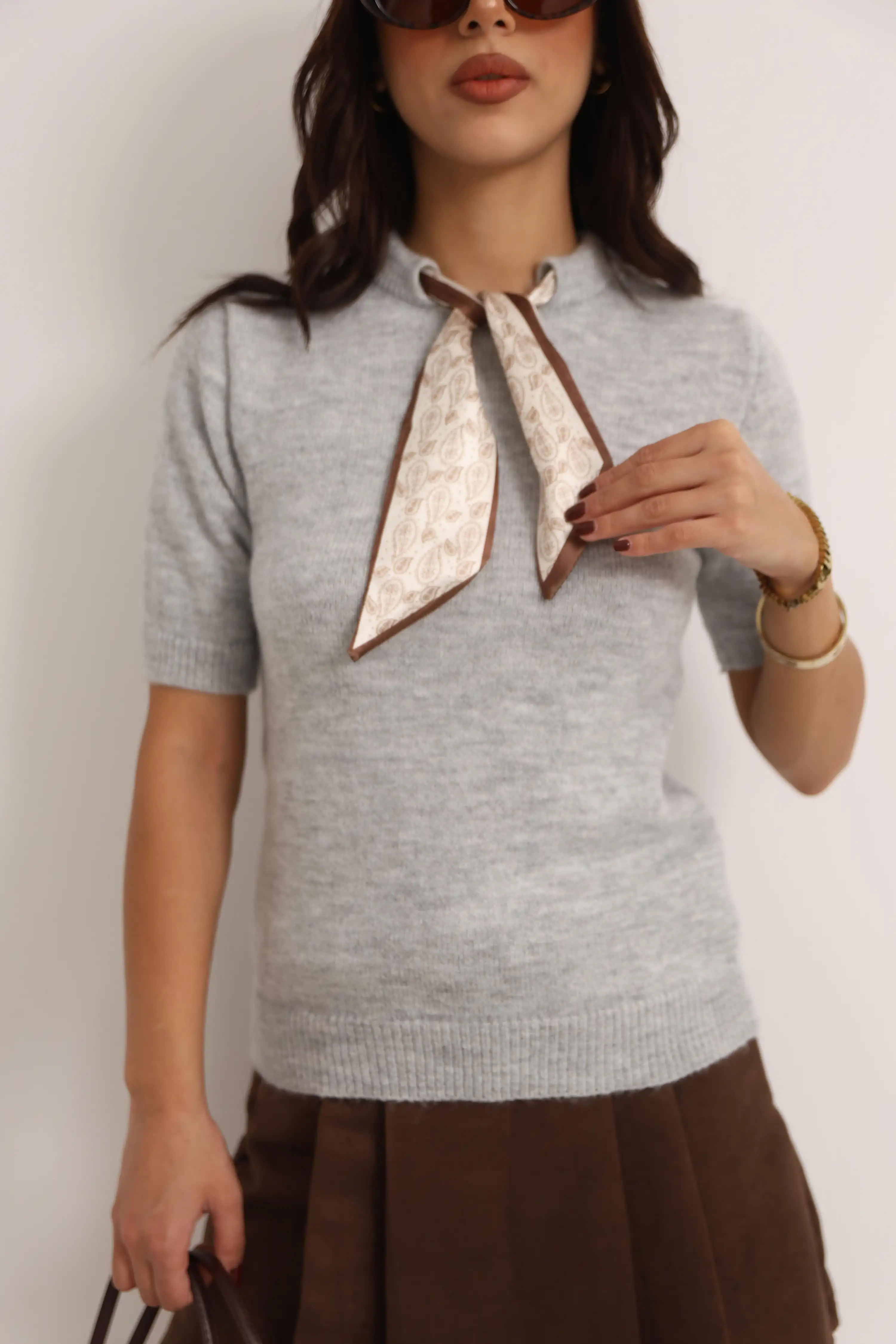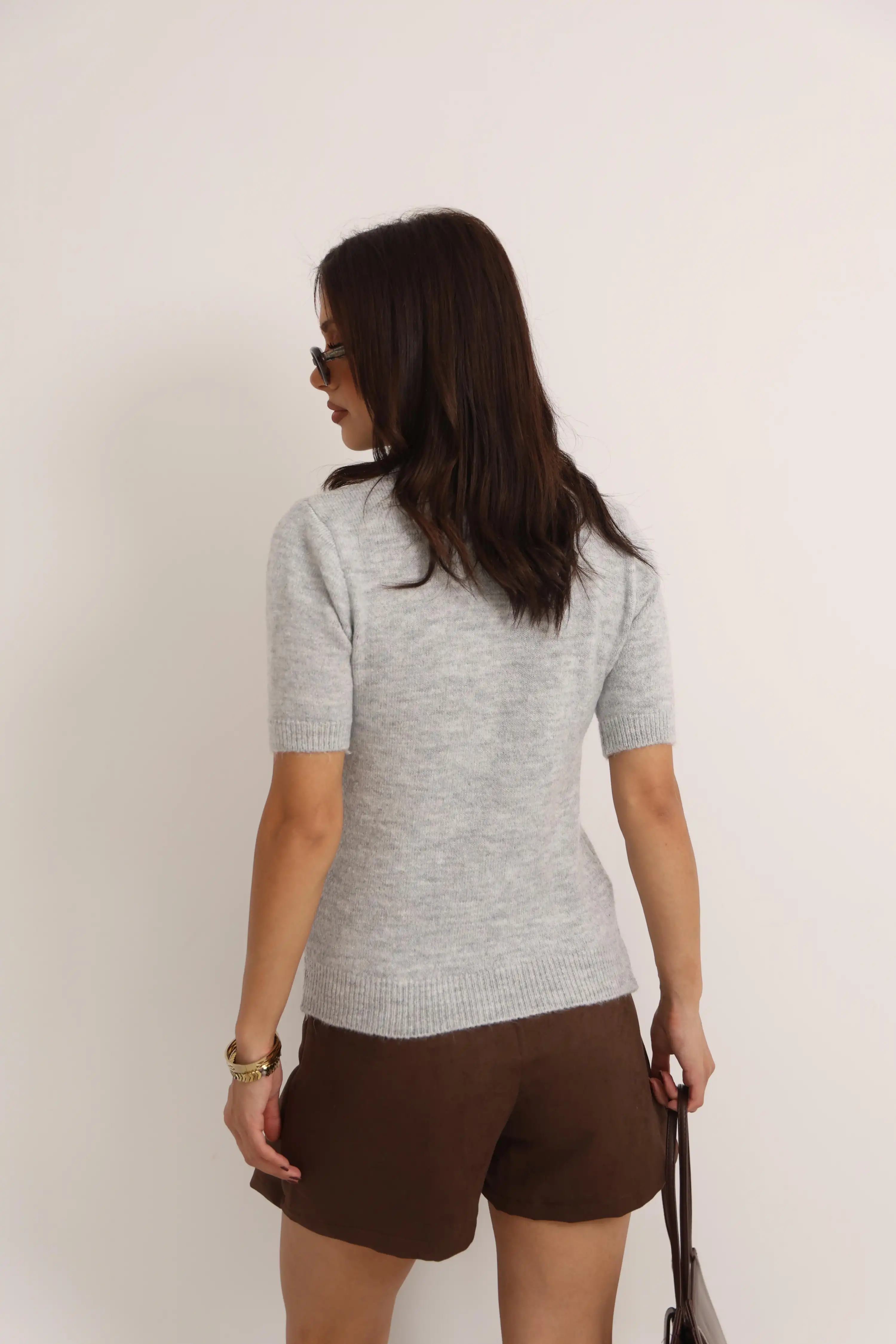 ŞAL DETAYLI KISA KOL TRİKO KAZAK-GRİ