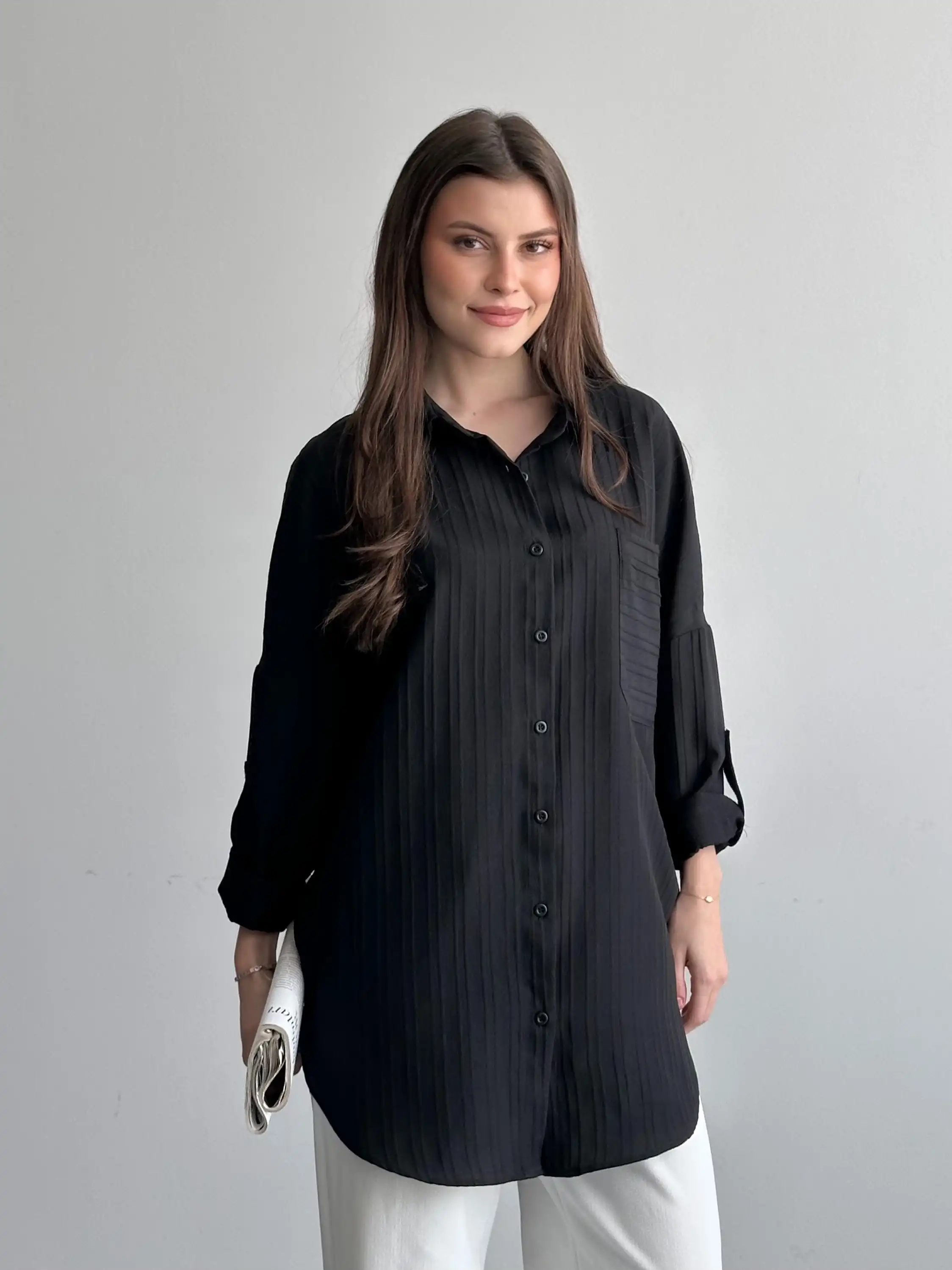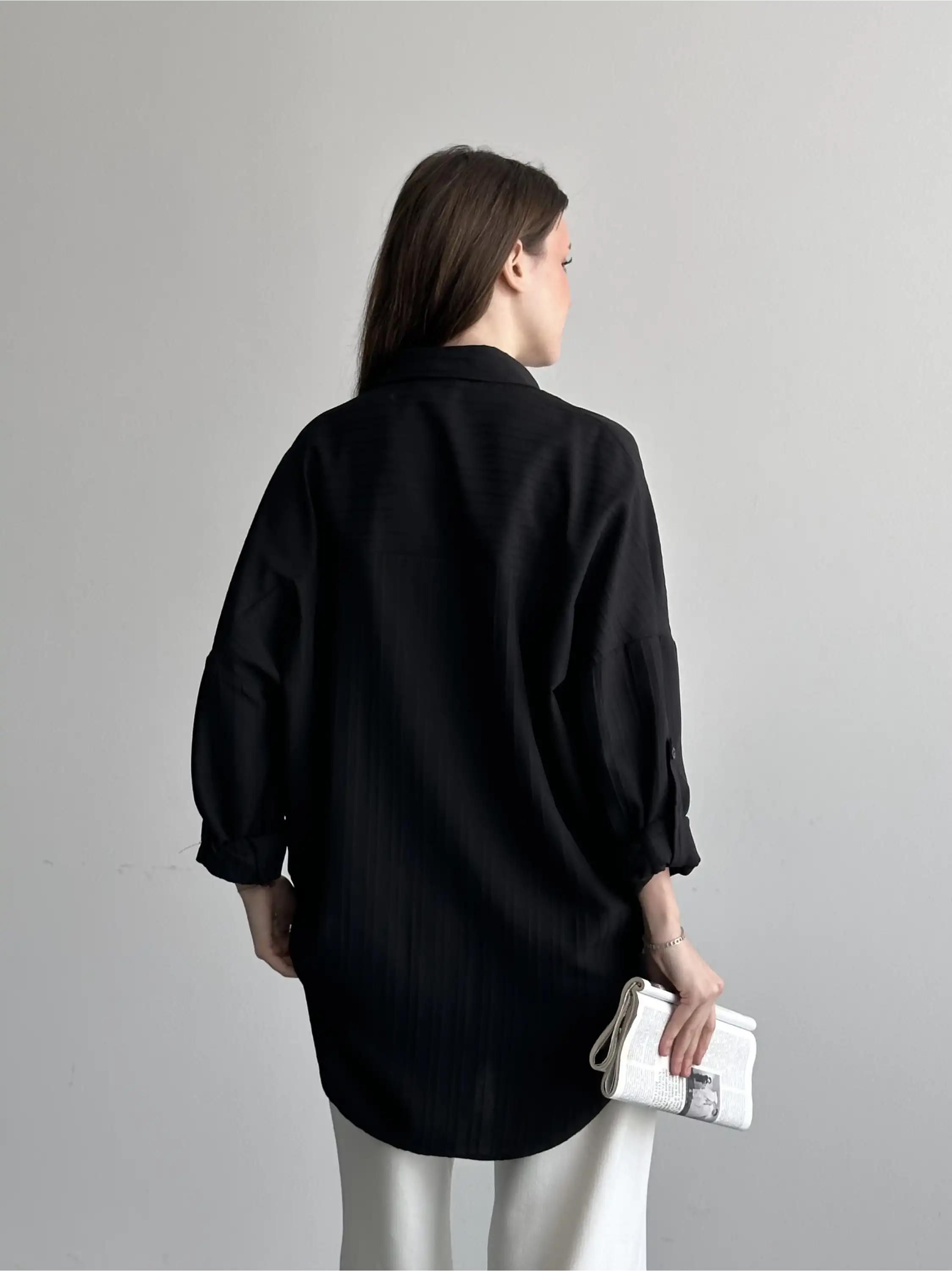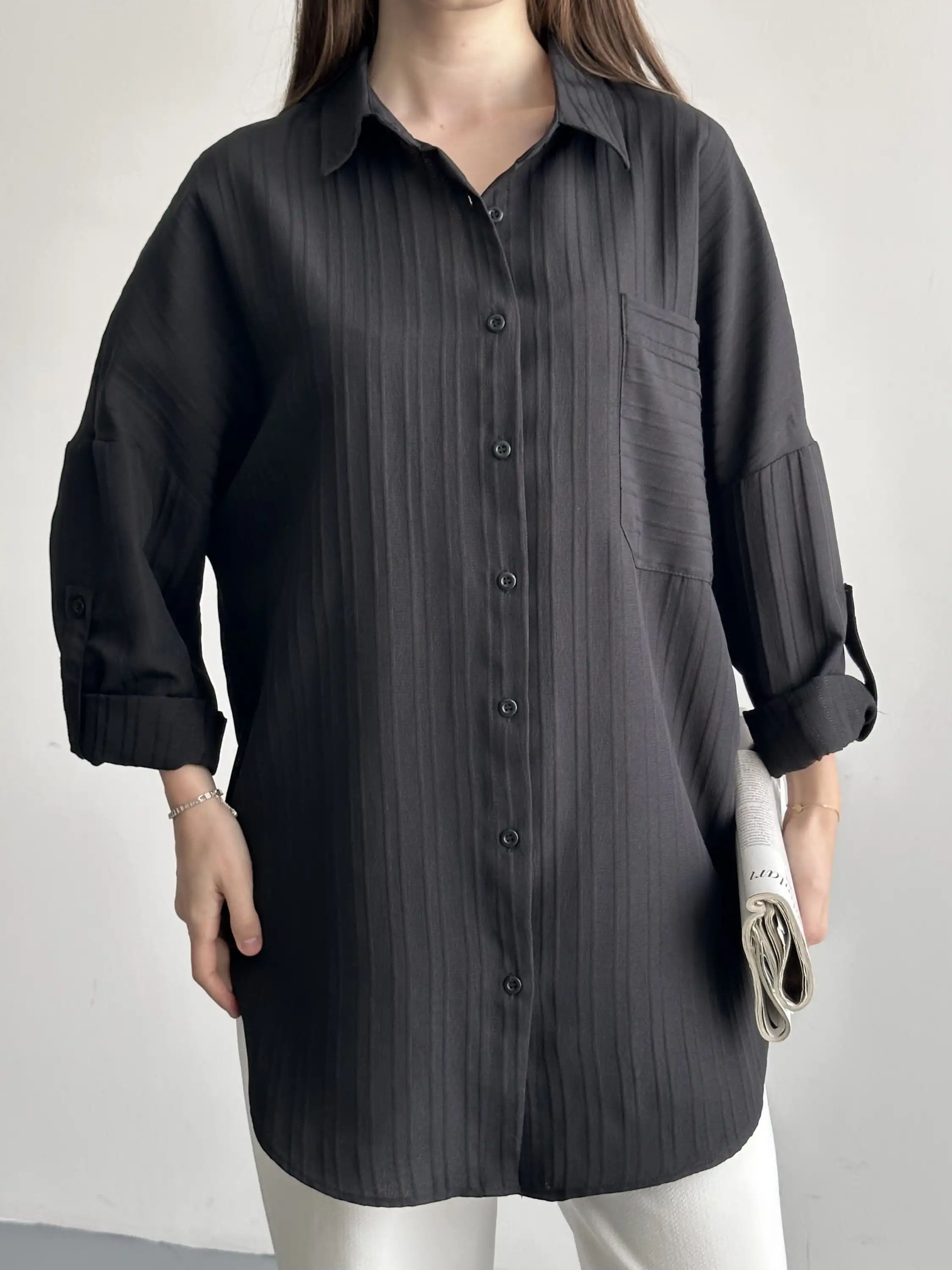ŞERİT DESENLİ OVERSIZE GÖMLEK-SİYAH