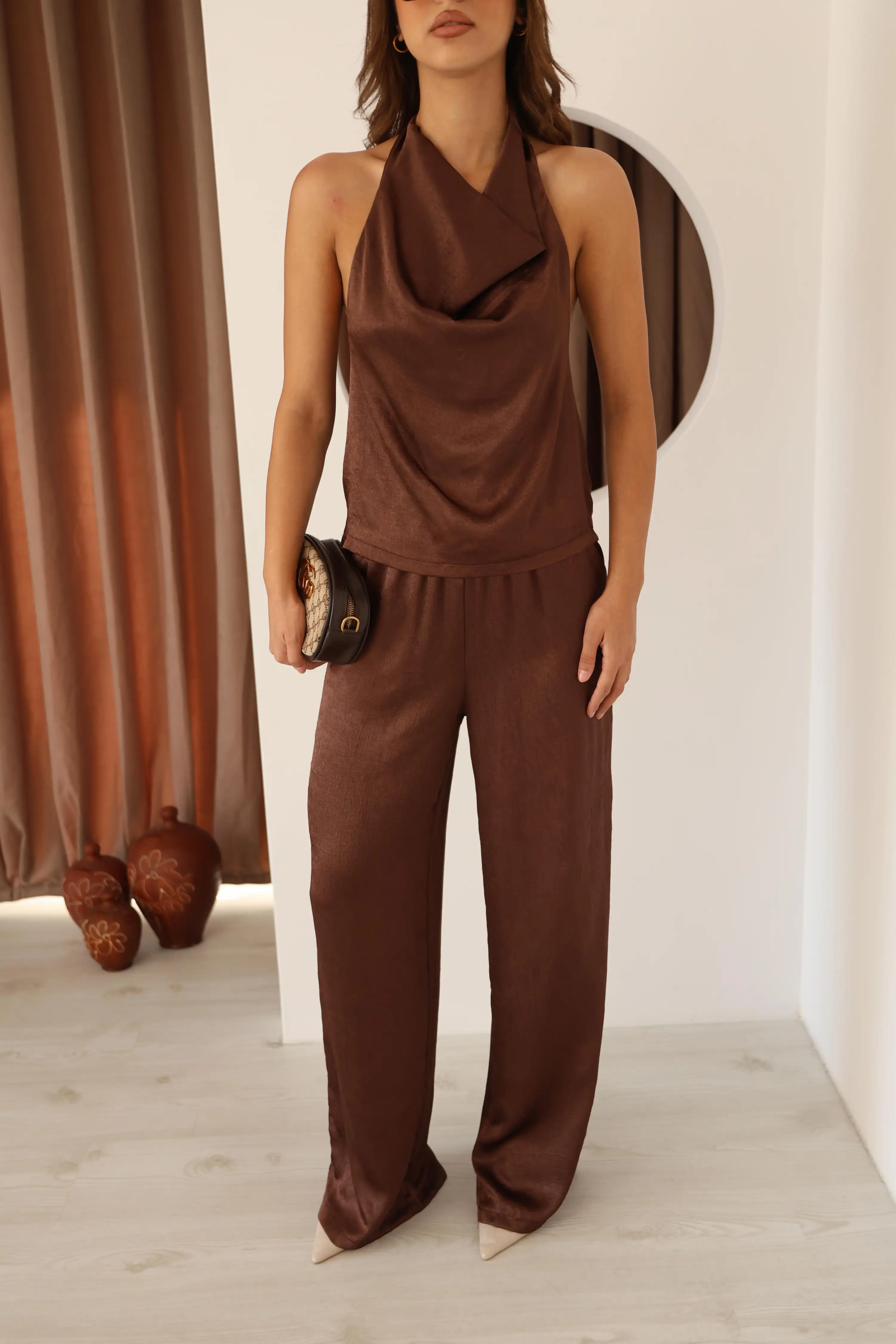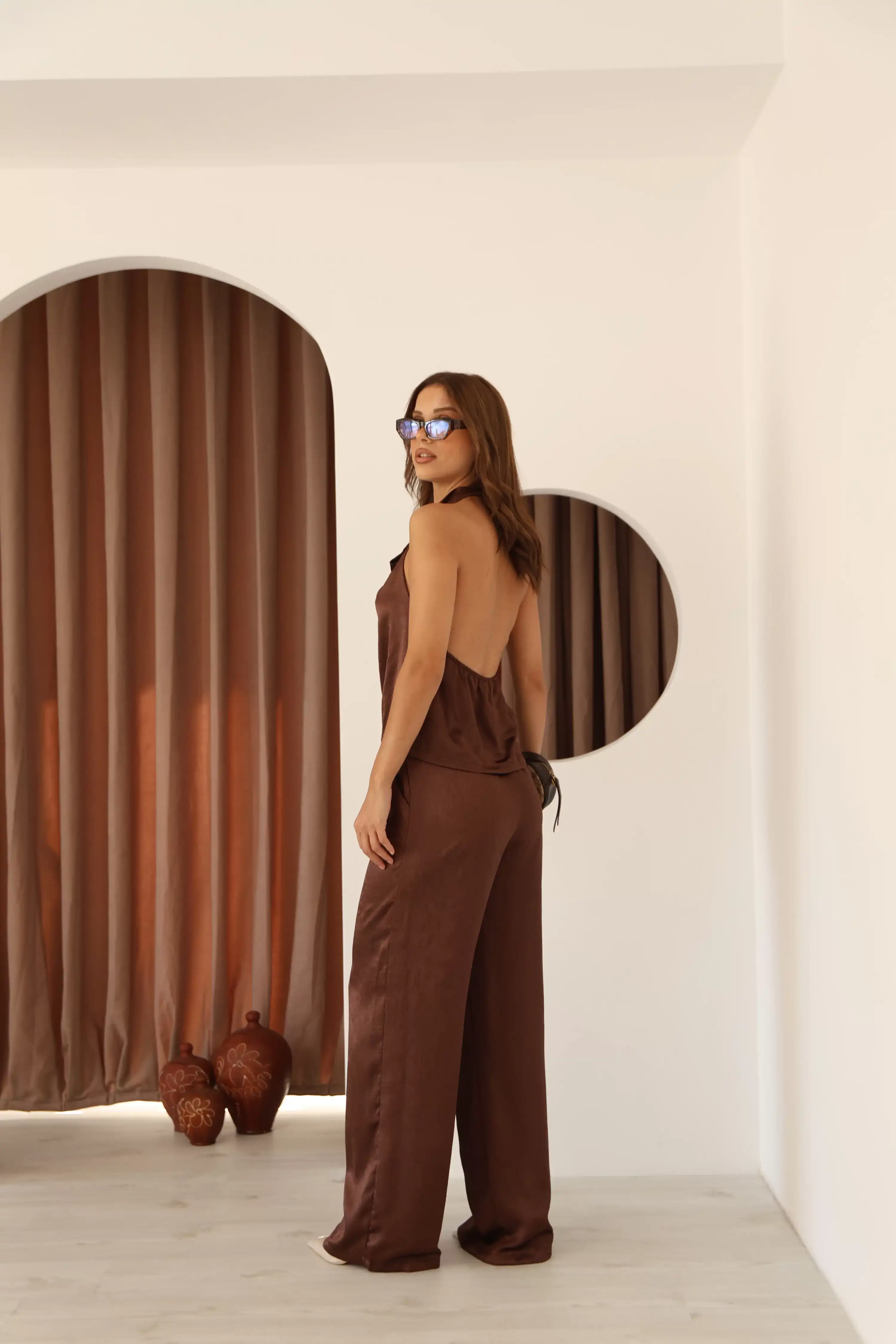 SIRT DEKOLTELİ LÜX SATEN TAKIM-KAHVE