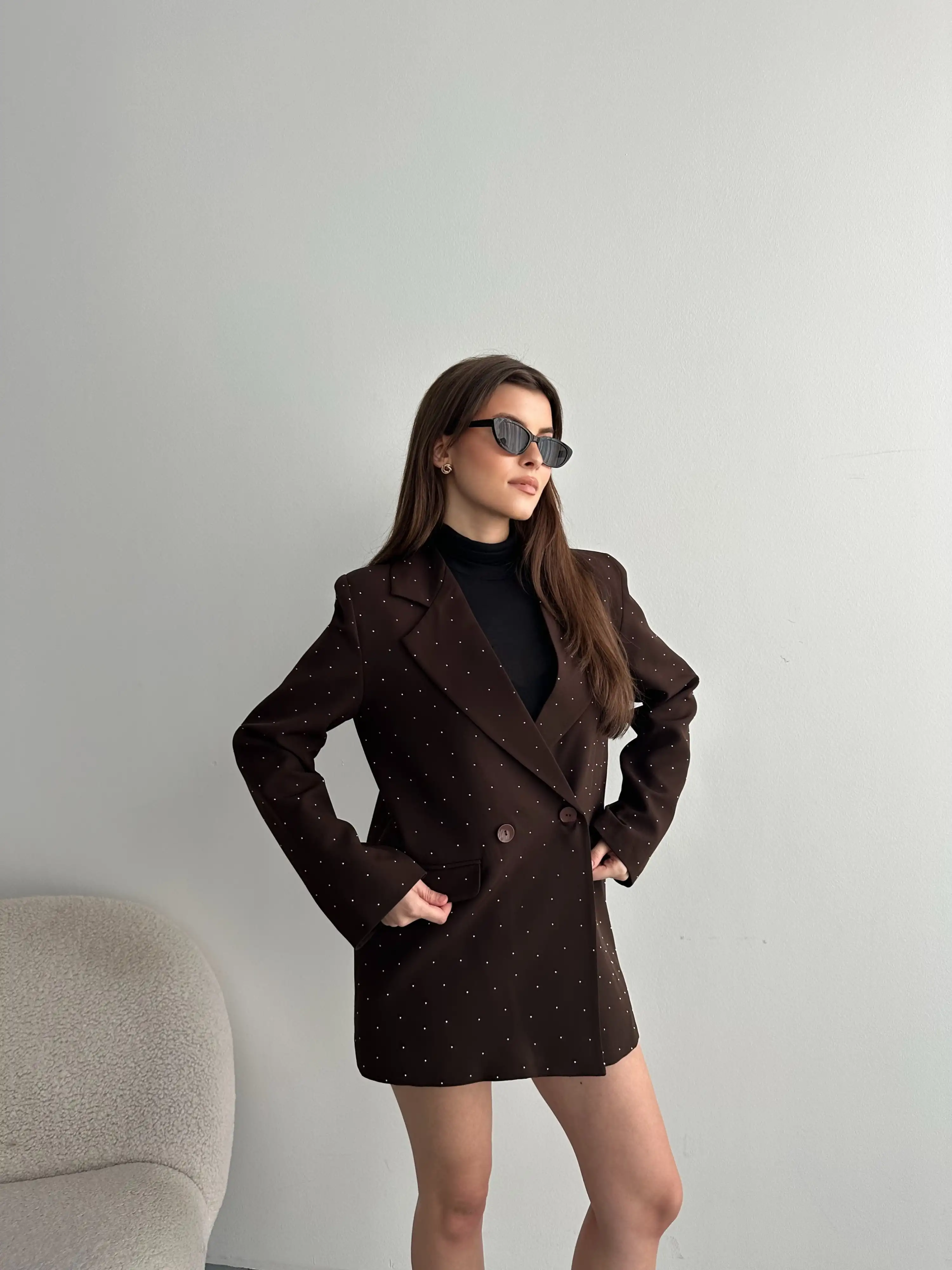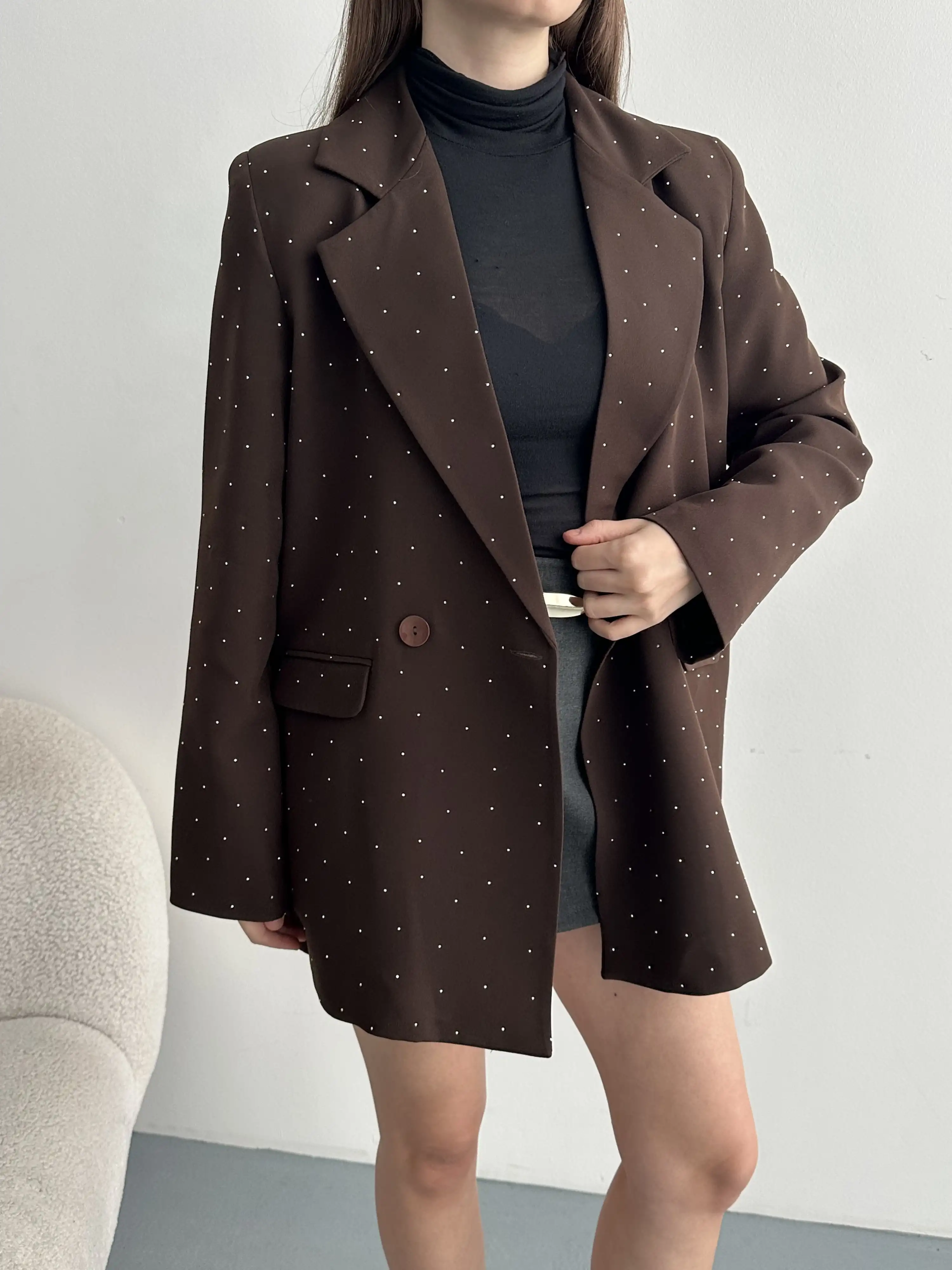 TAŞ İŞLEMELİ ASTARLI BLAZER CEKET-KAHVE
