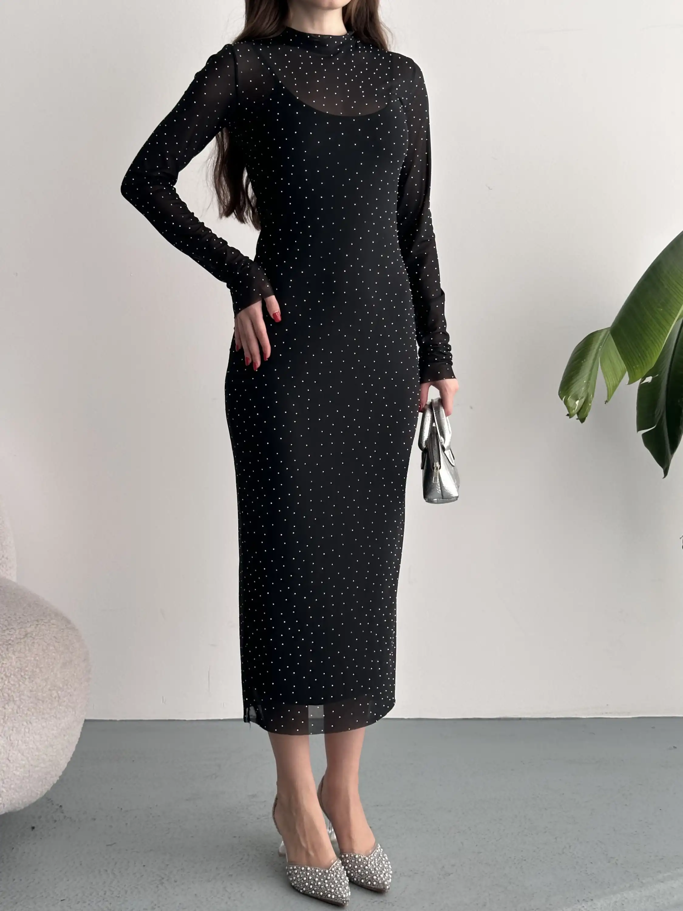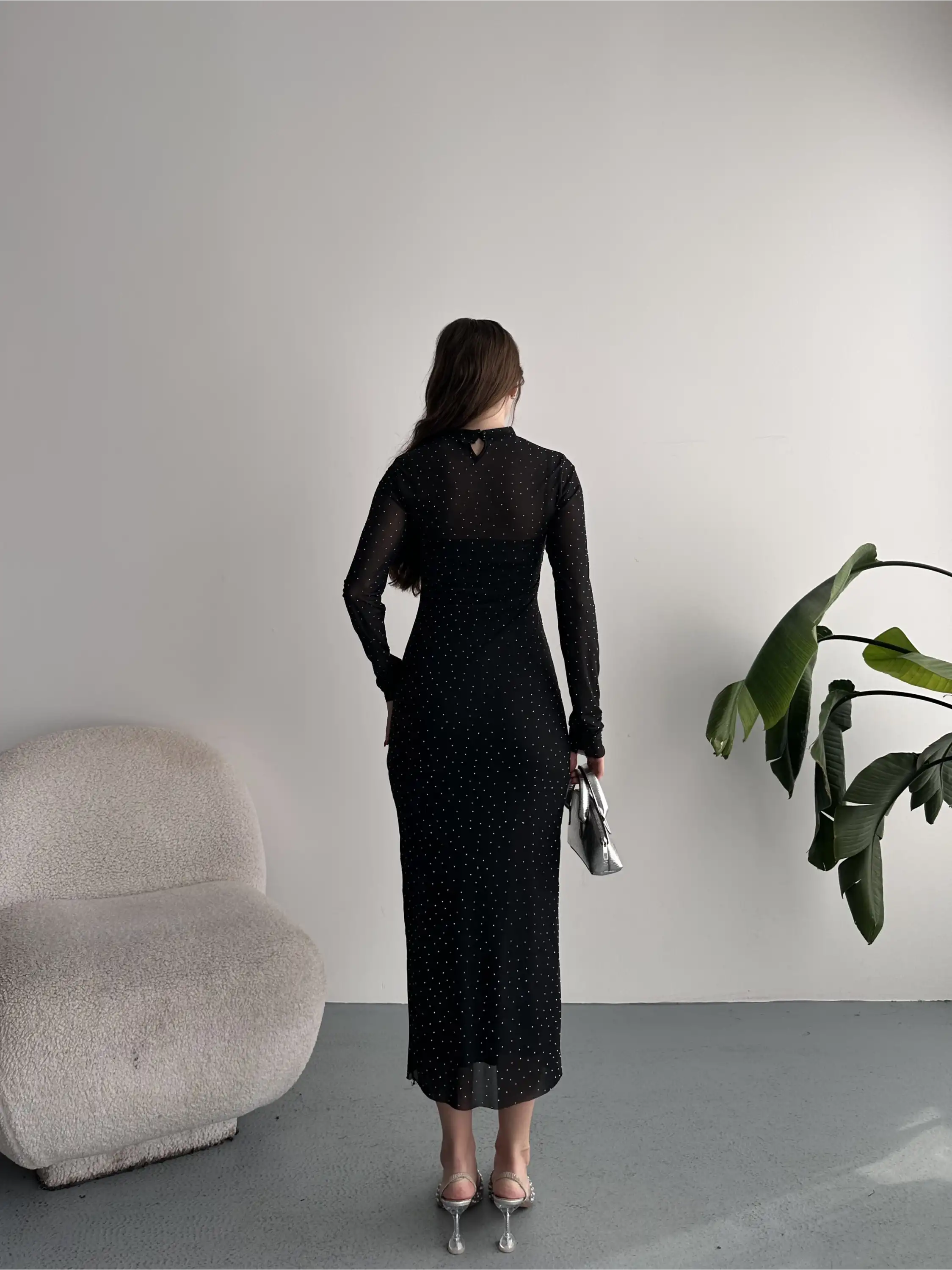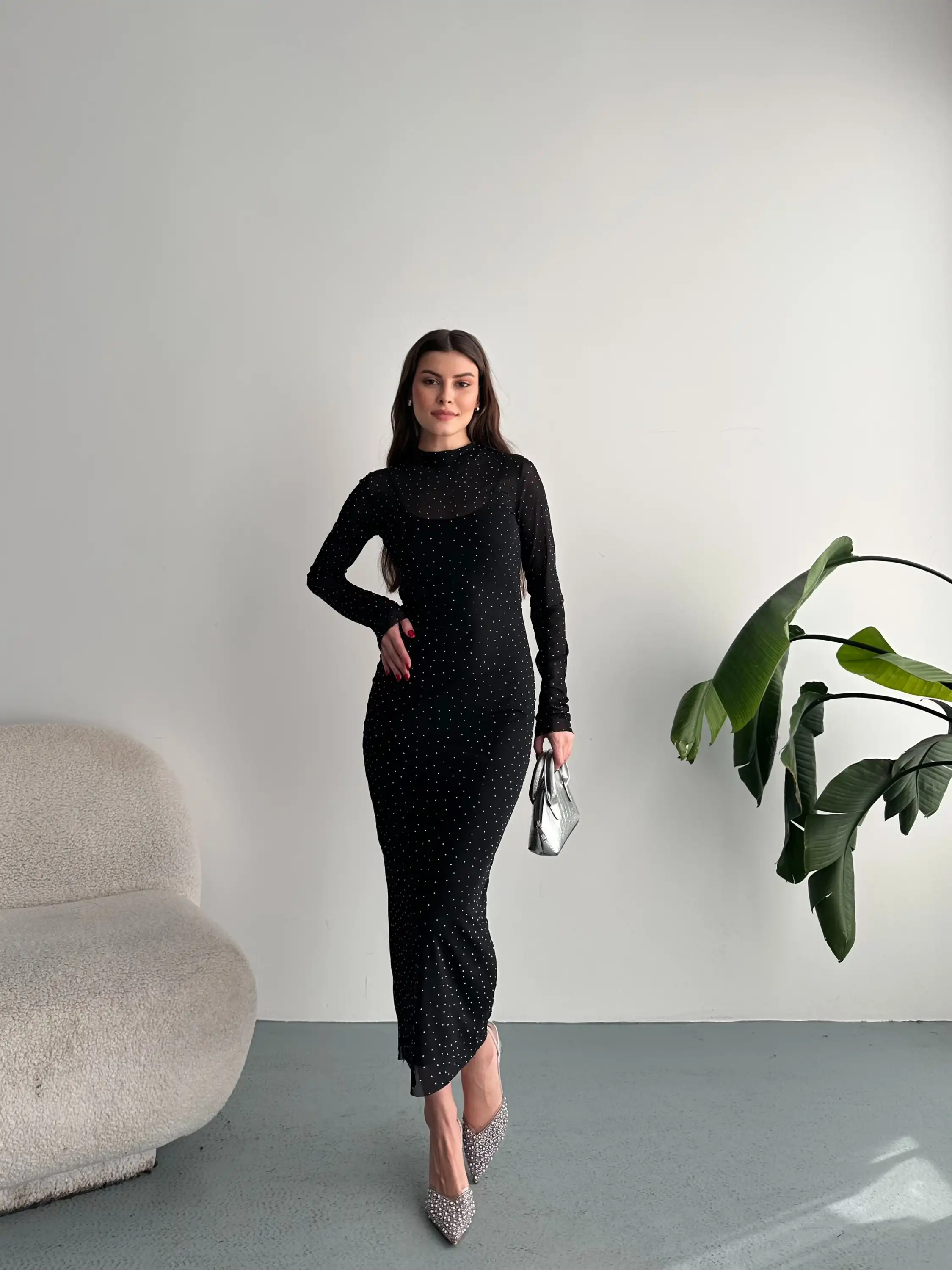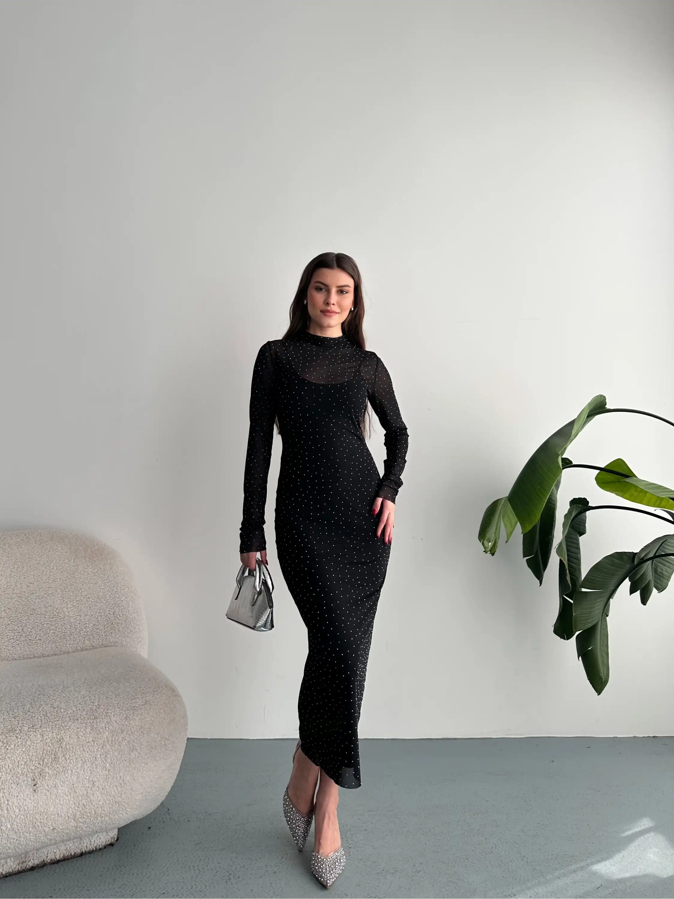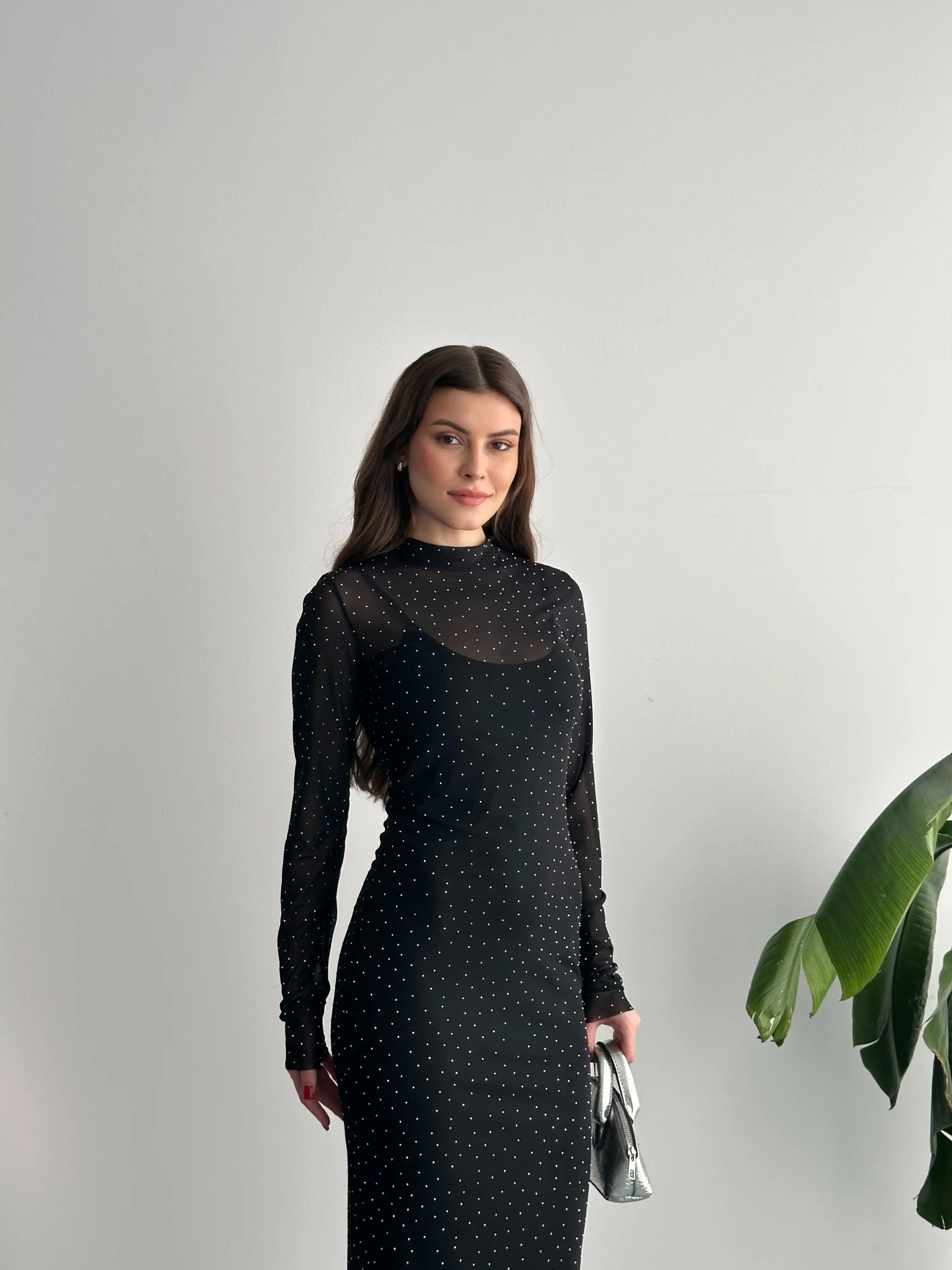 FLOR DESENLİ ASKILI TÜL ELBİSE-SİYAH