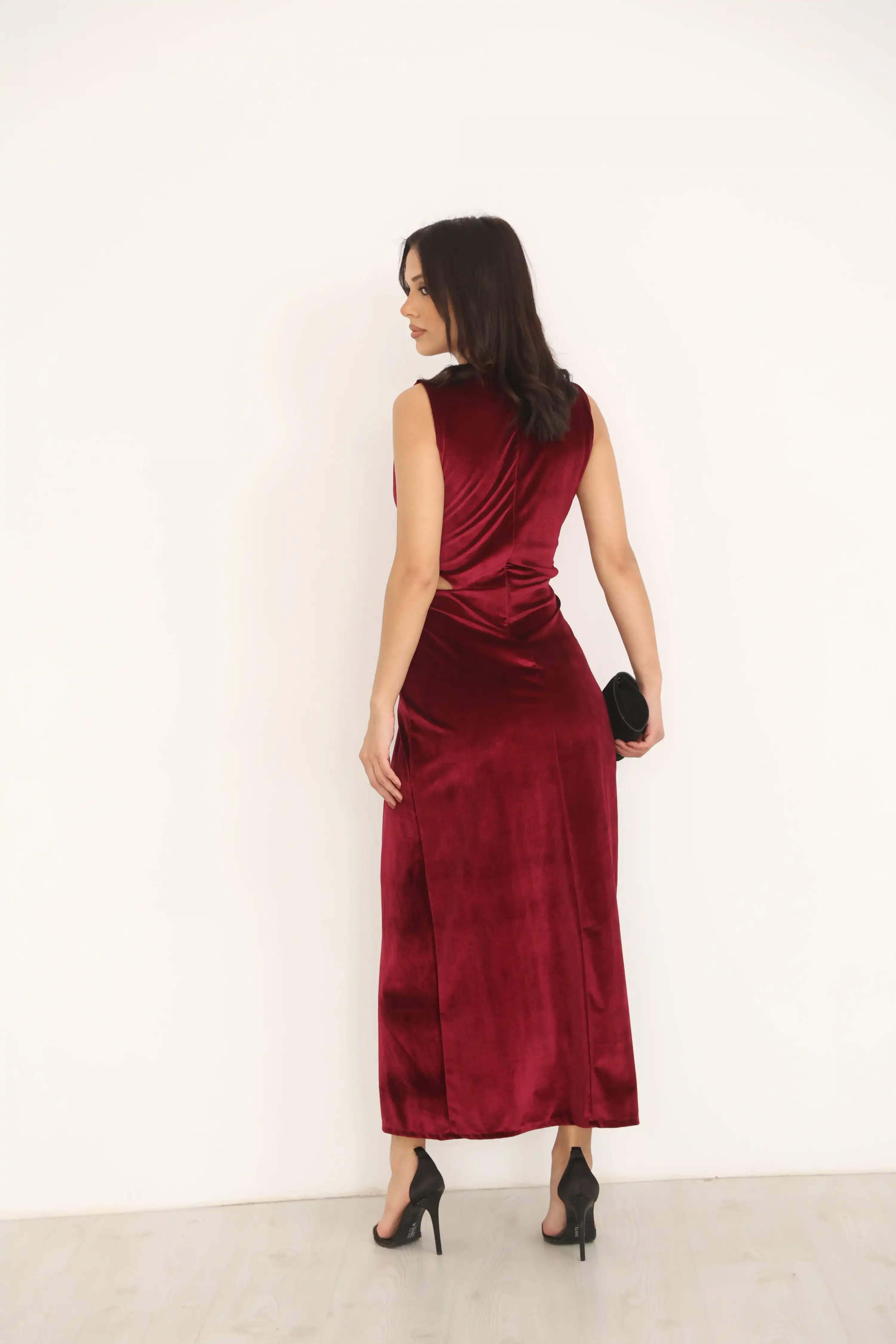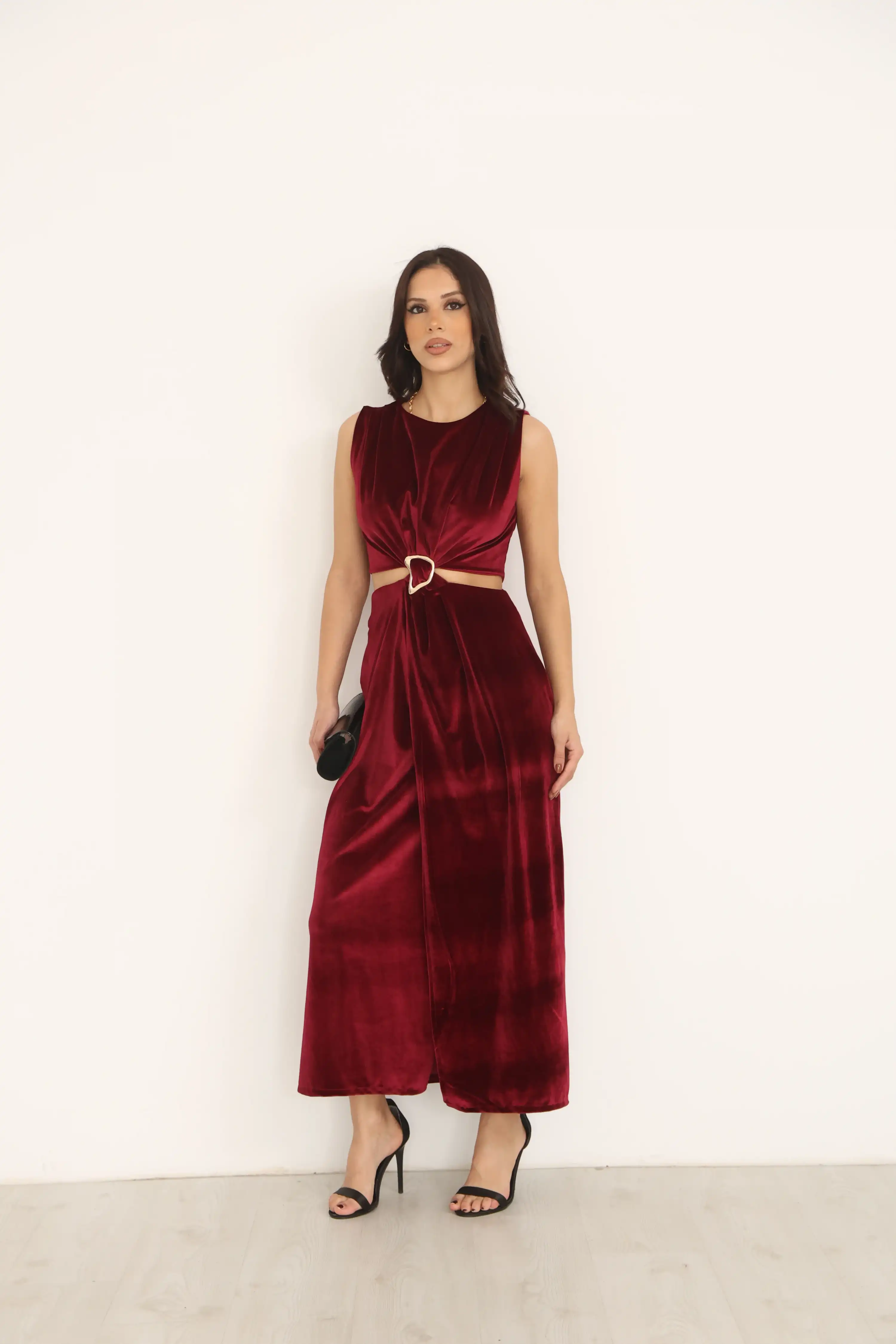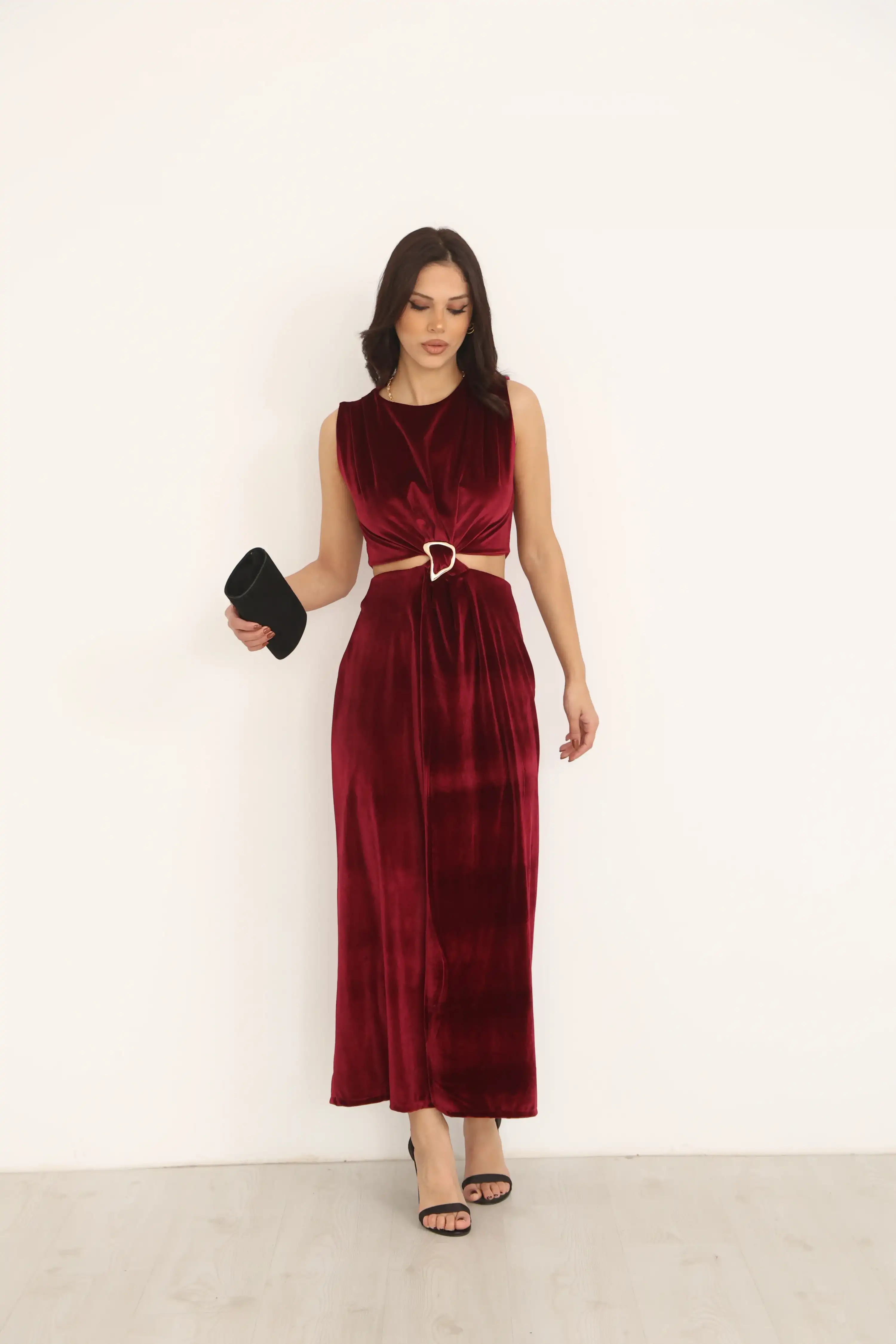 TOKA DETAYLI BORDO KADİFE ELBİSE-BORDO
