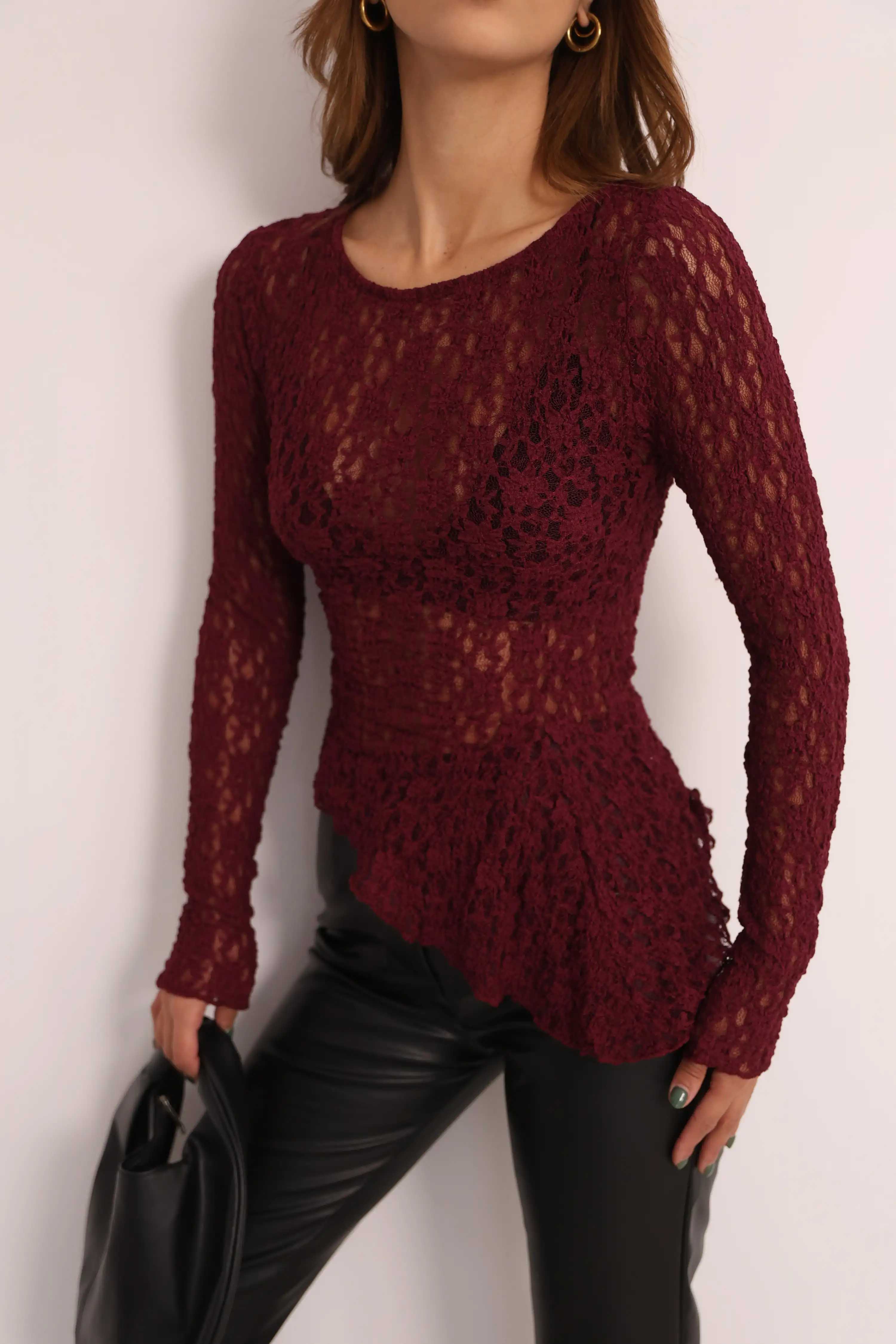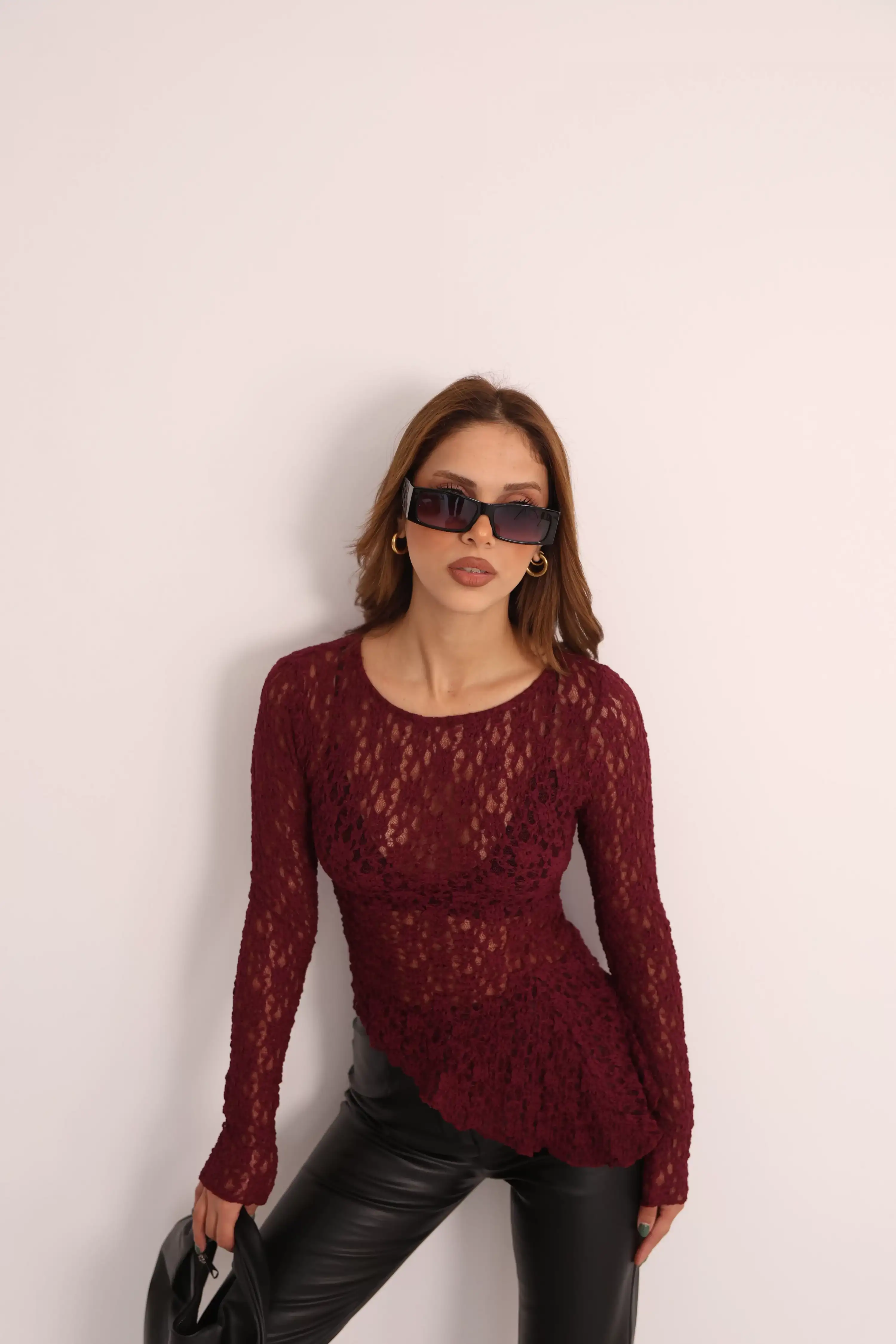 TRANSPARAN GÜPÜRLÜ BLUZ-BORDO