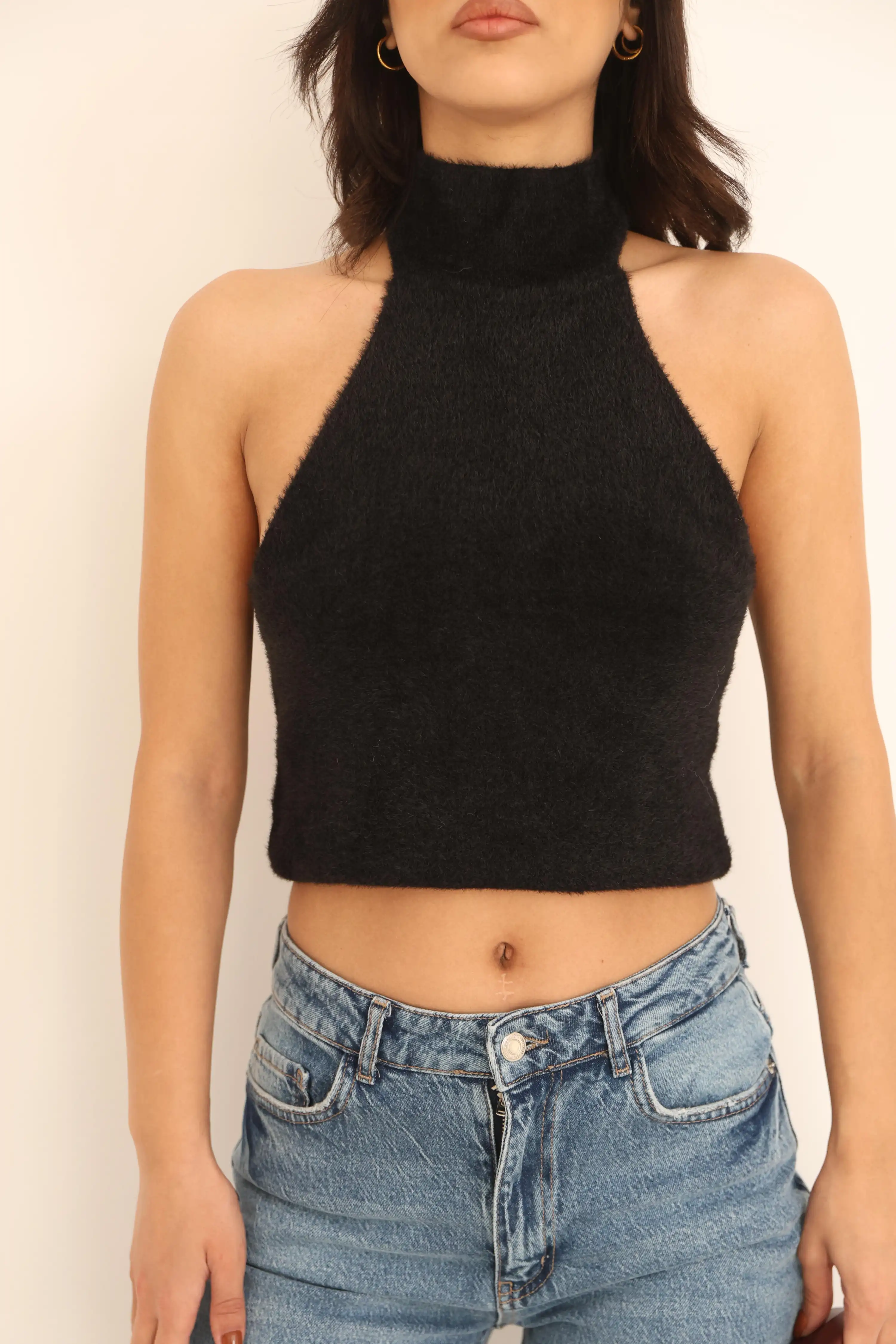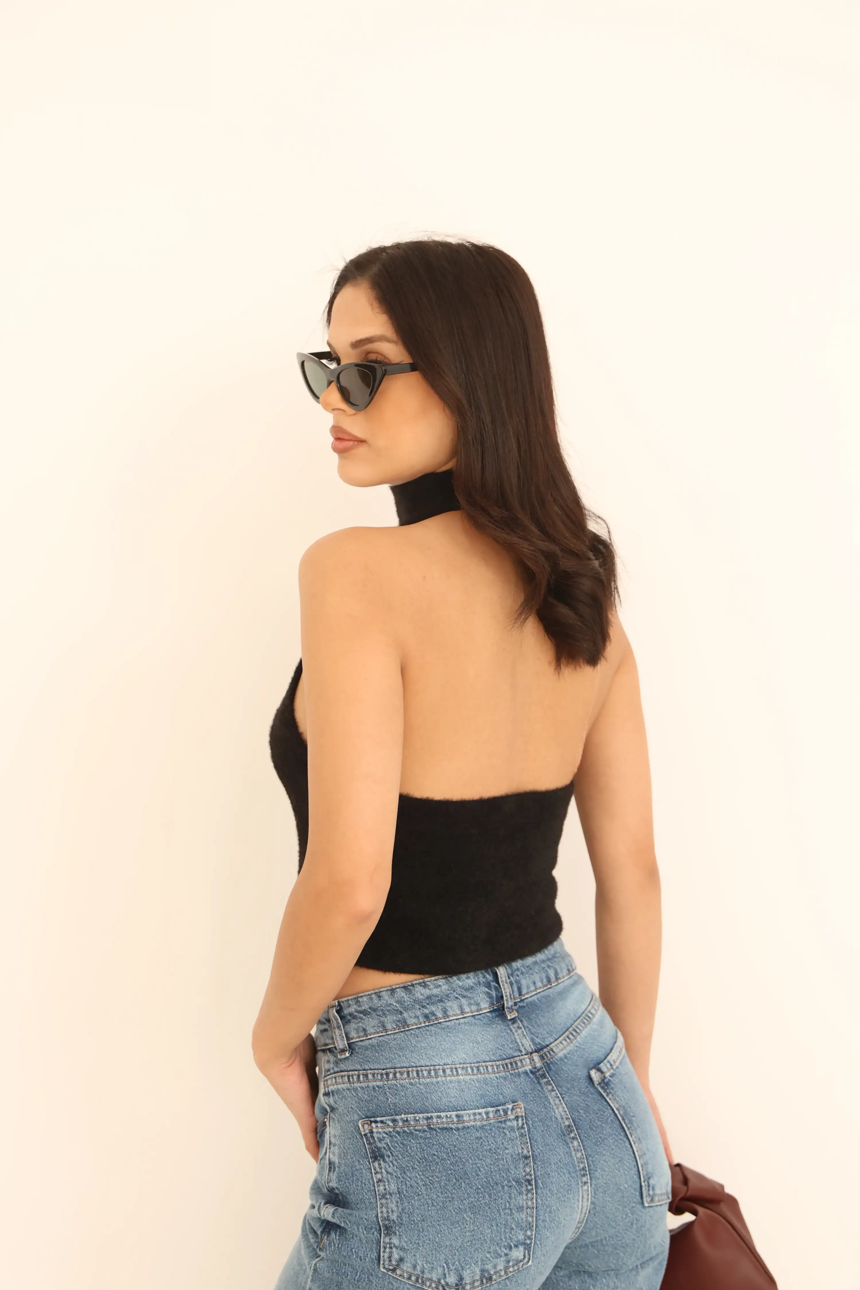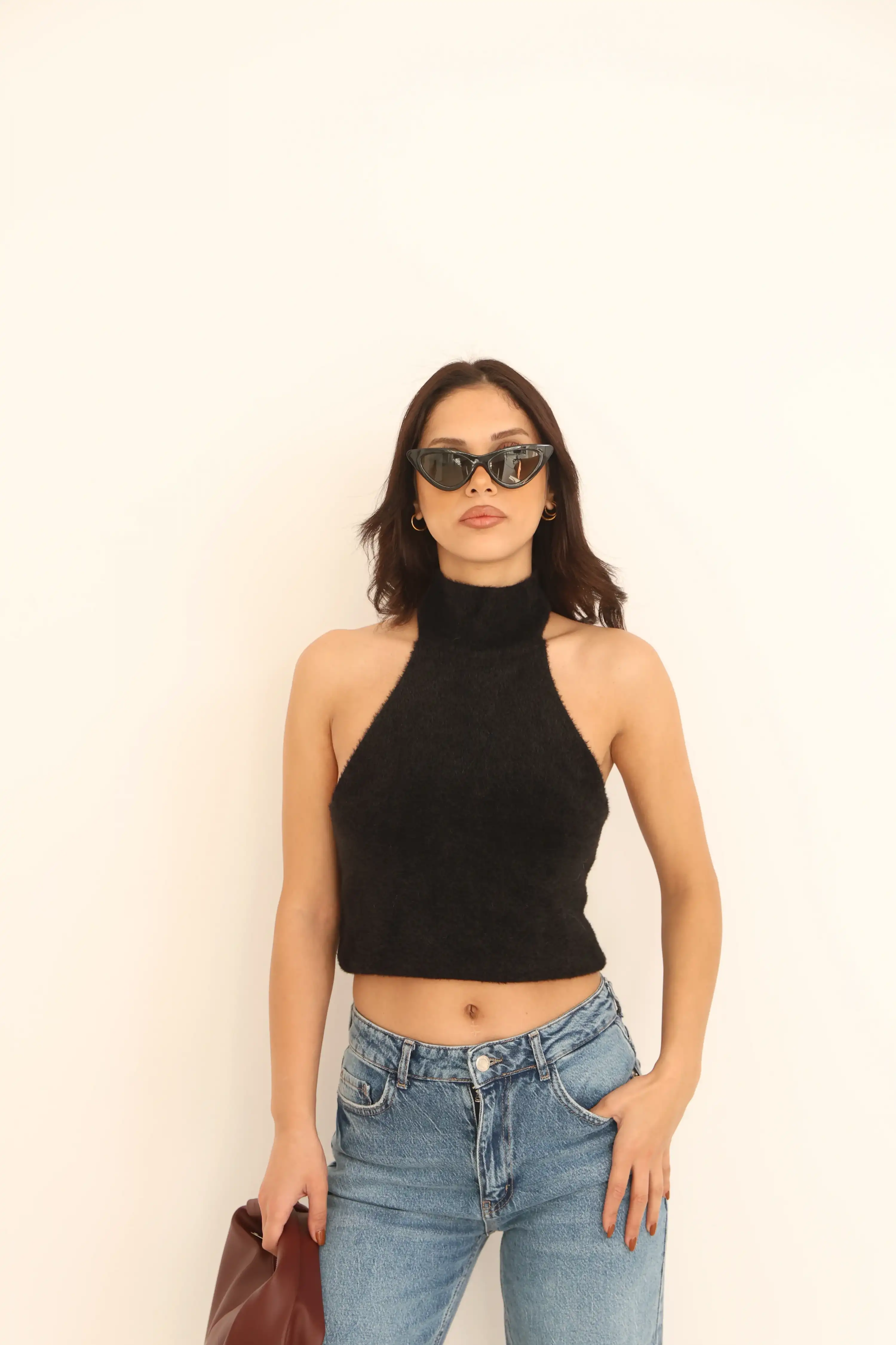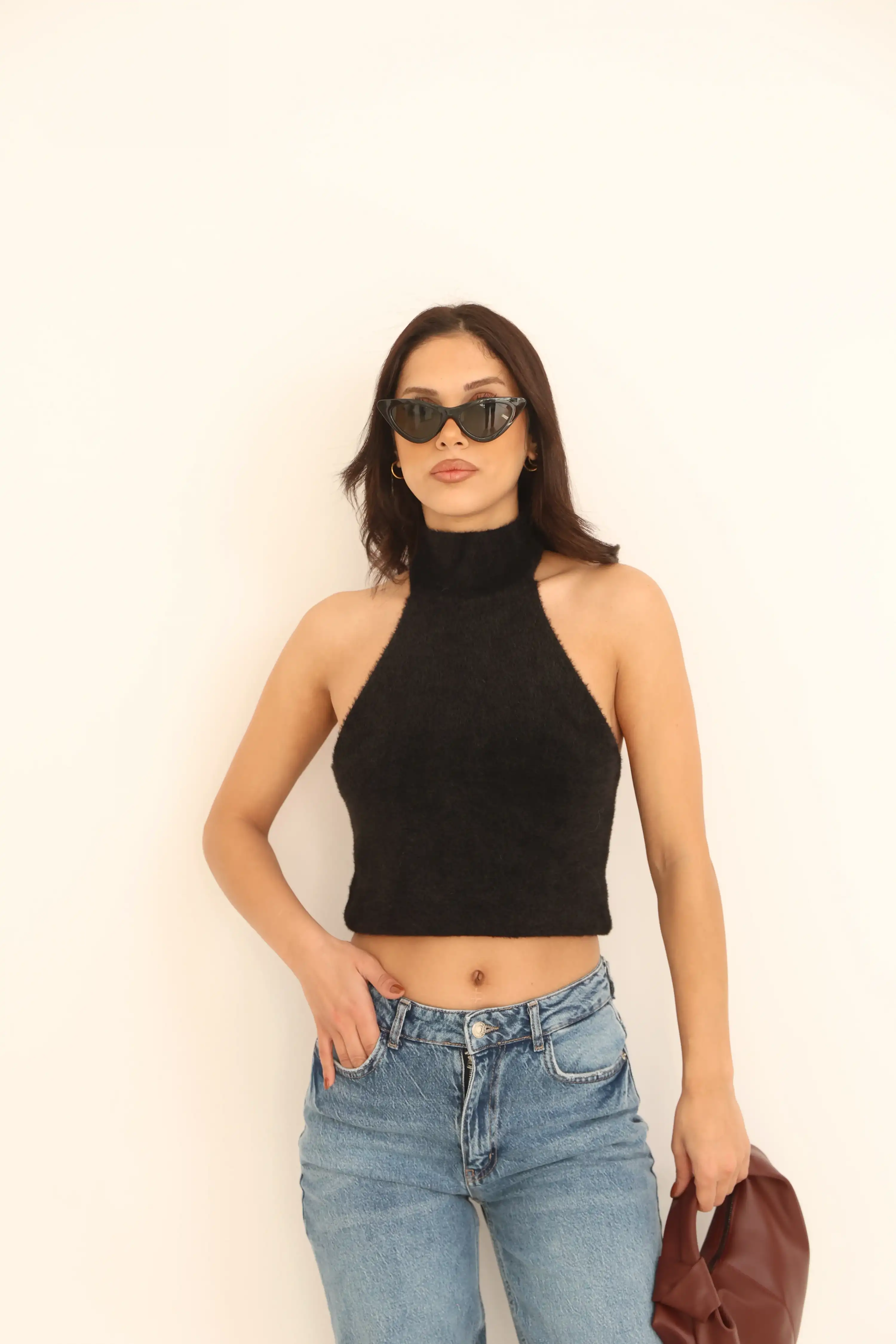 TÜYLÜ BOYUNDAN BAĞLAMALI ÖRGÜ BLUZ-SİYAH