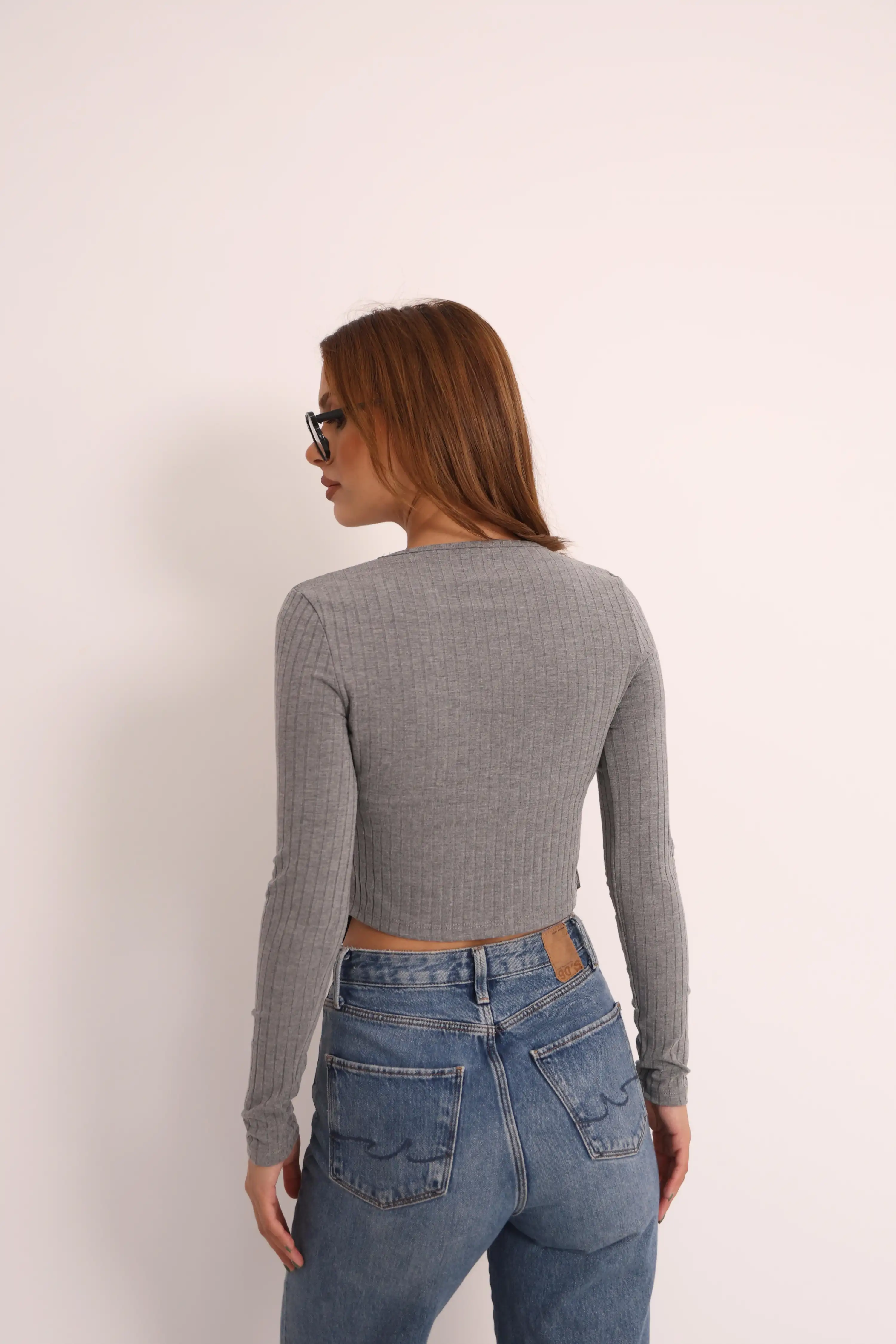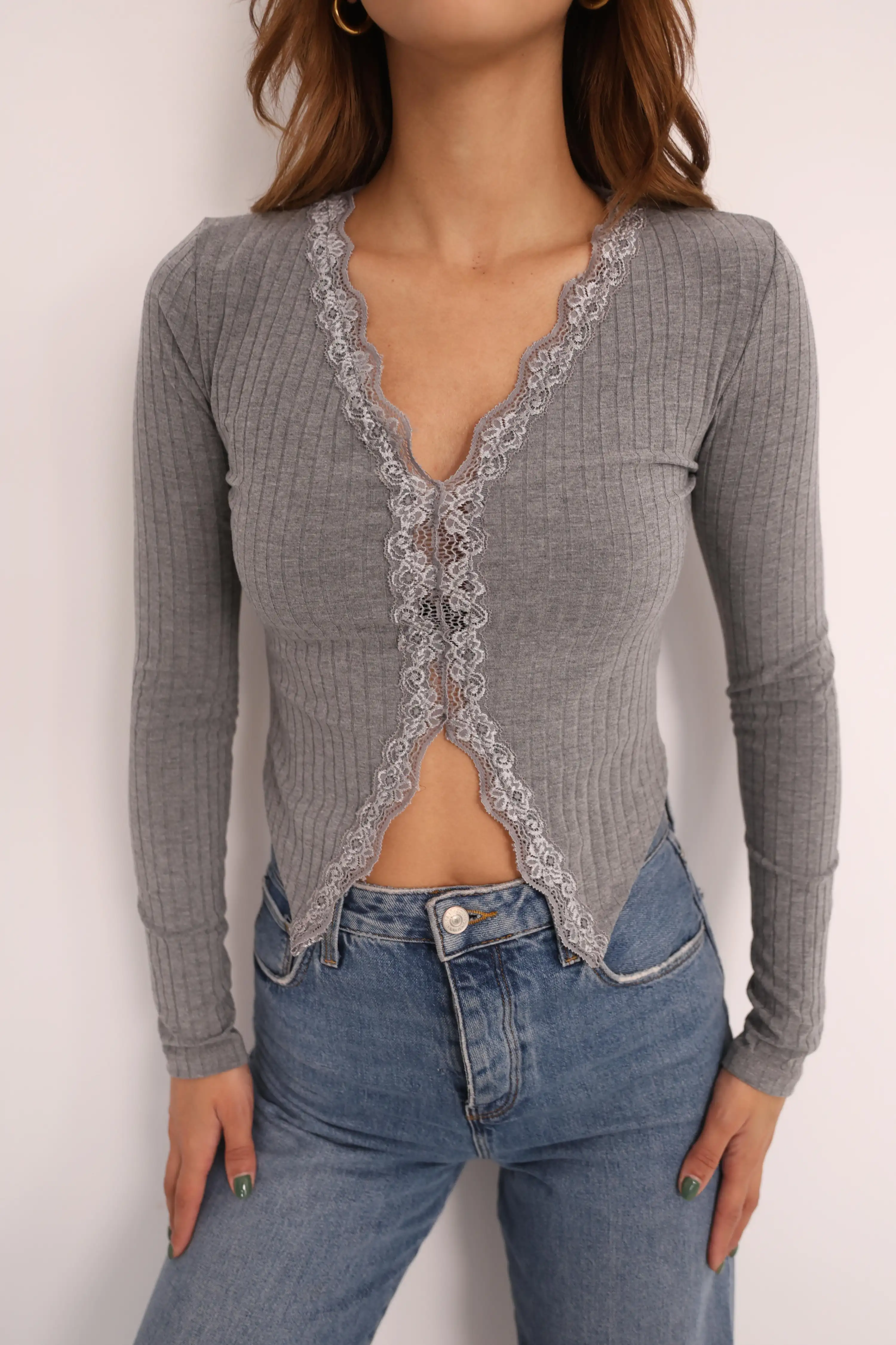 V DANTEL DETAYLI PENYE BLUZ-GRİ
