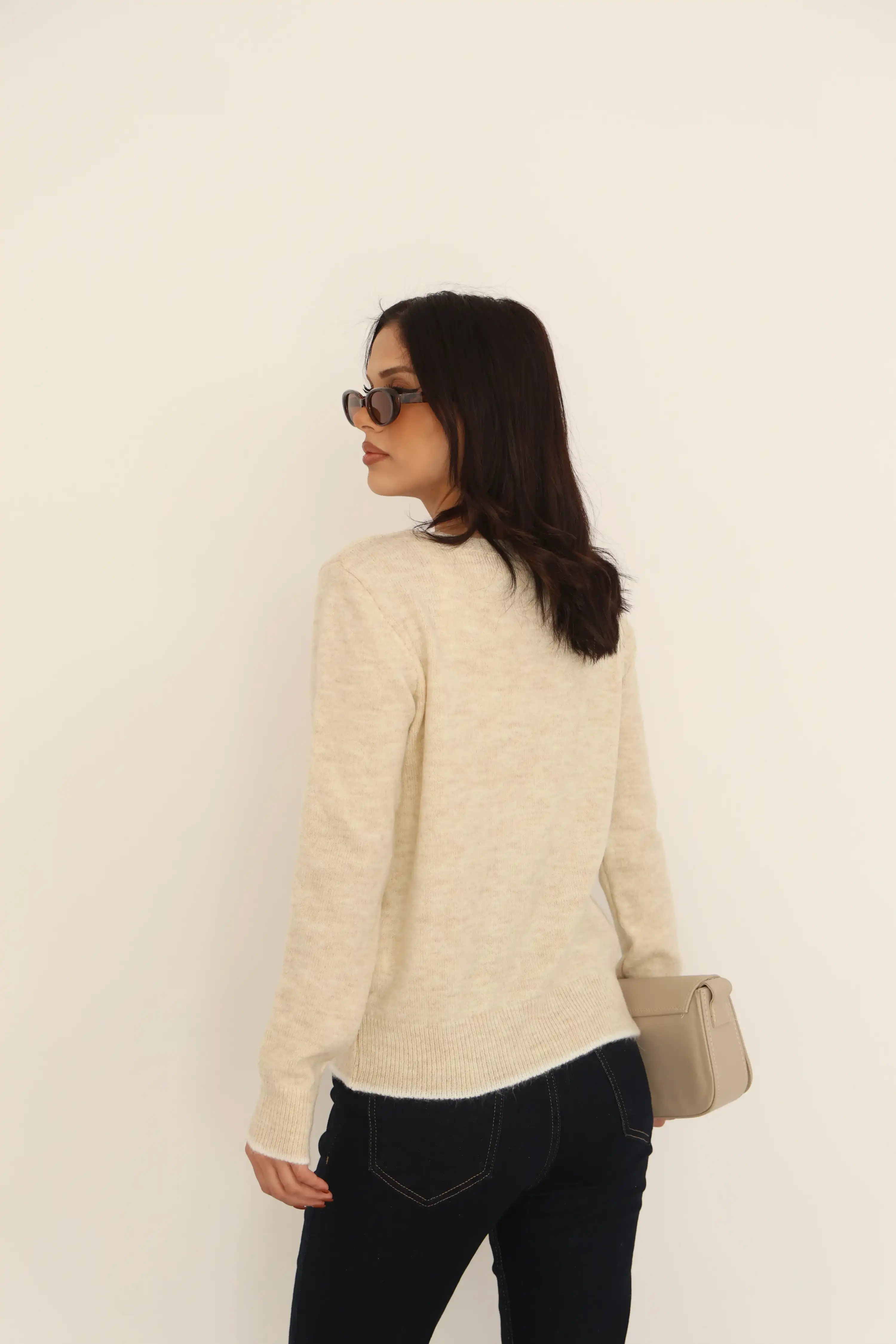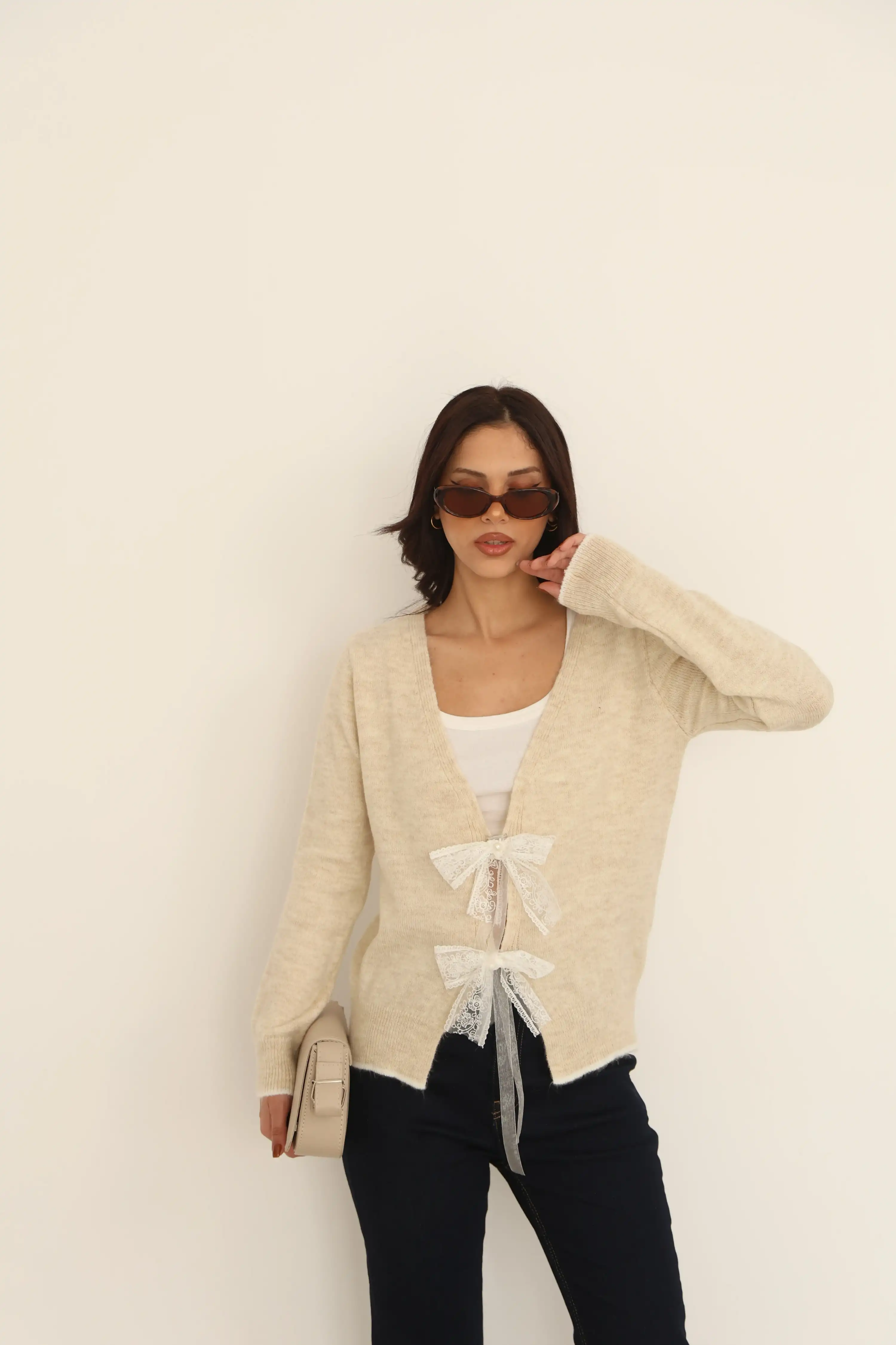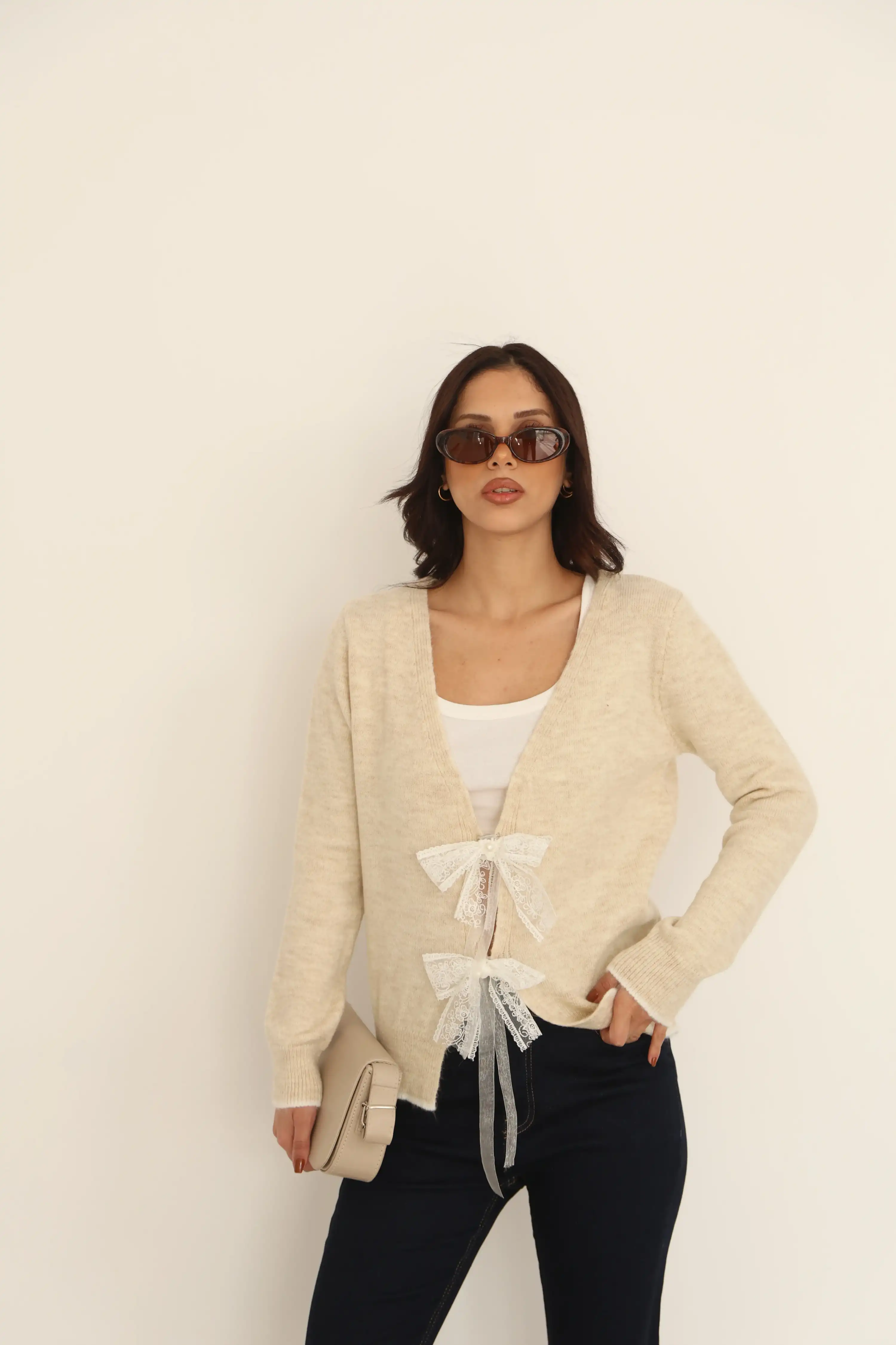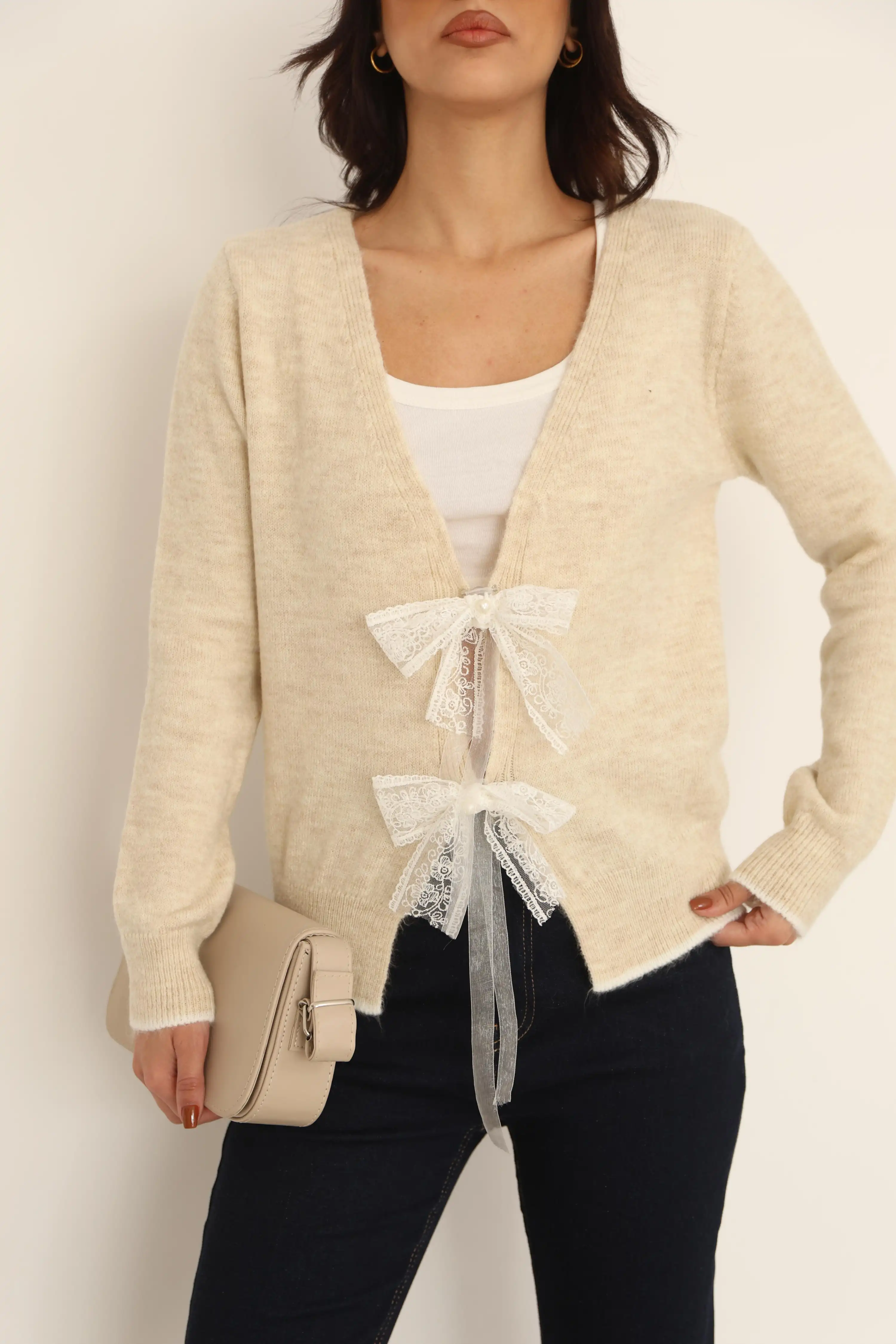 V YAKA KURDELE DETAYLI TRİKO HIRKA-BEJ