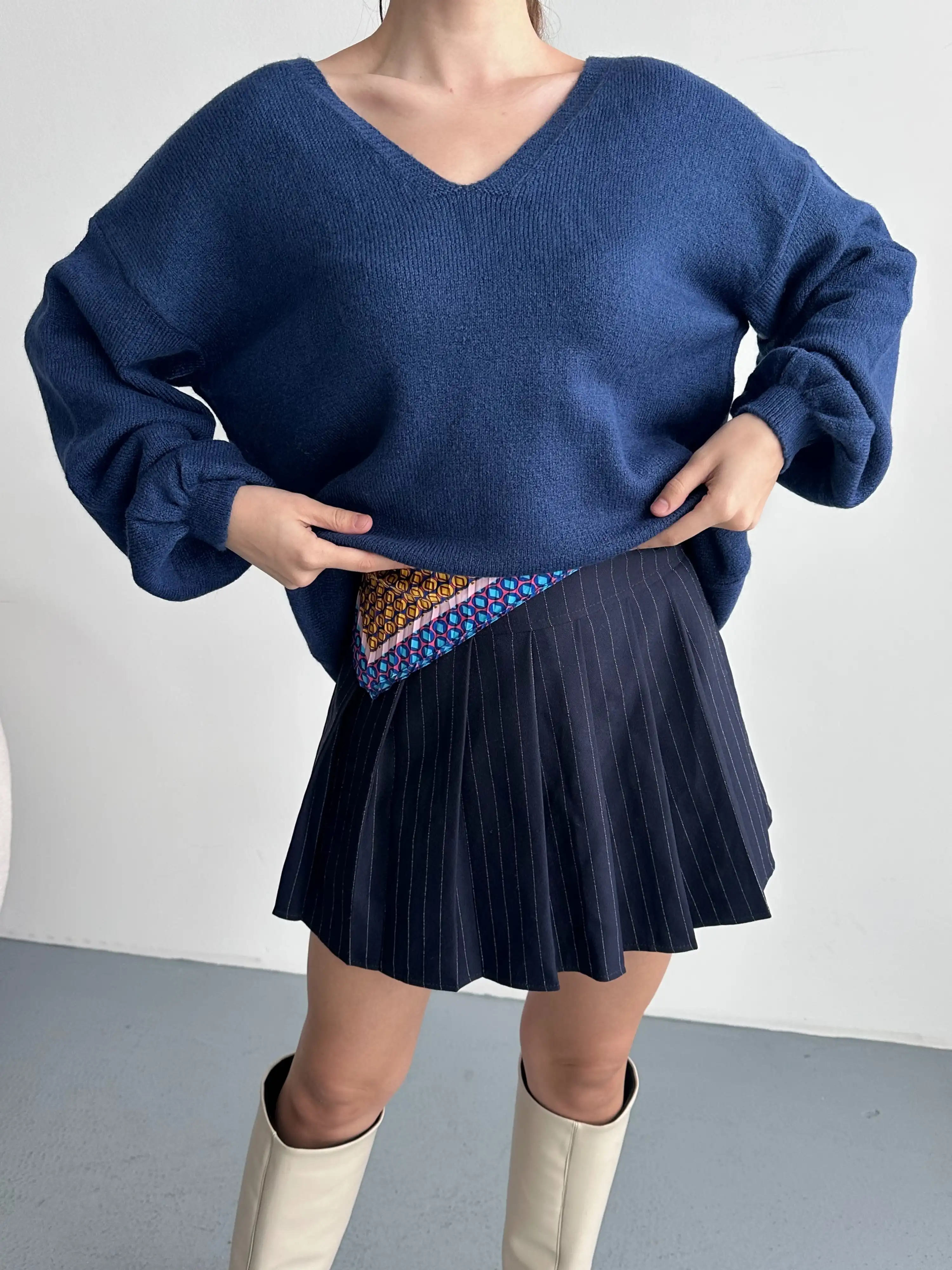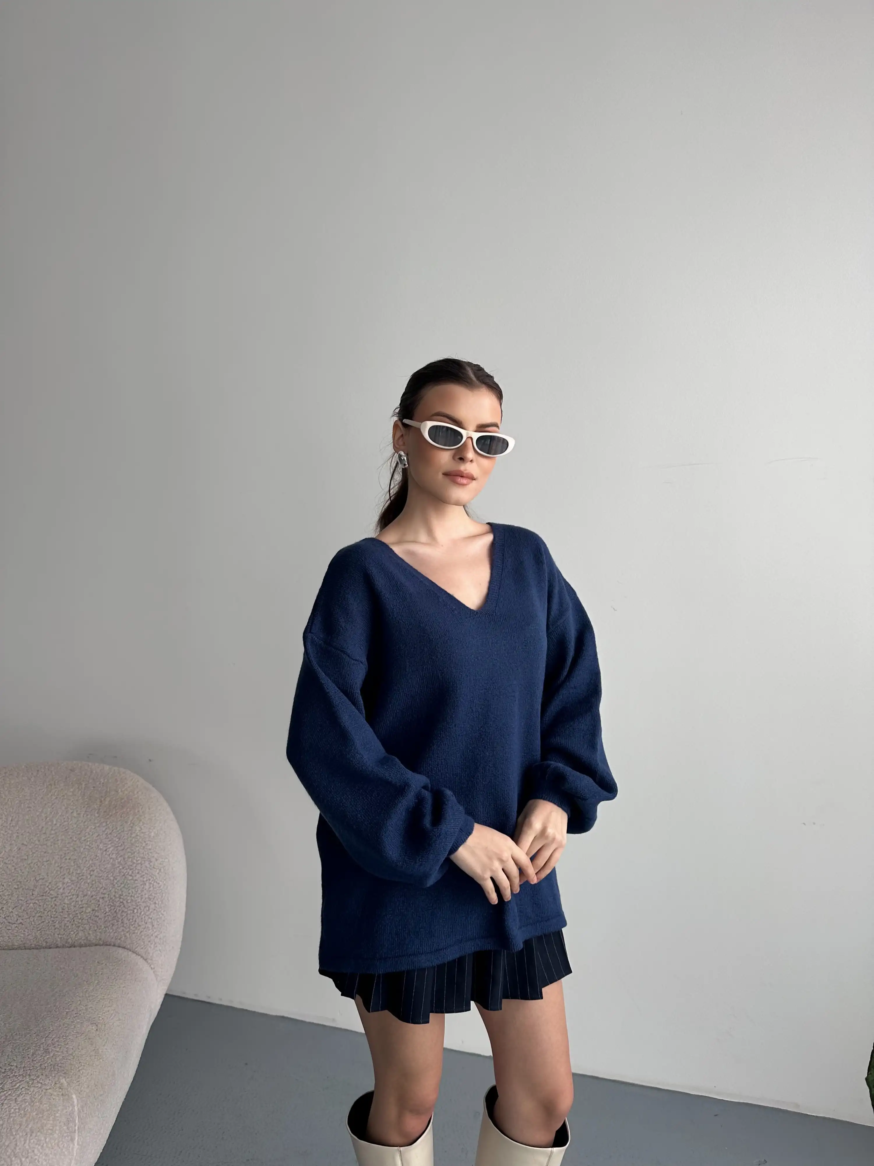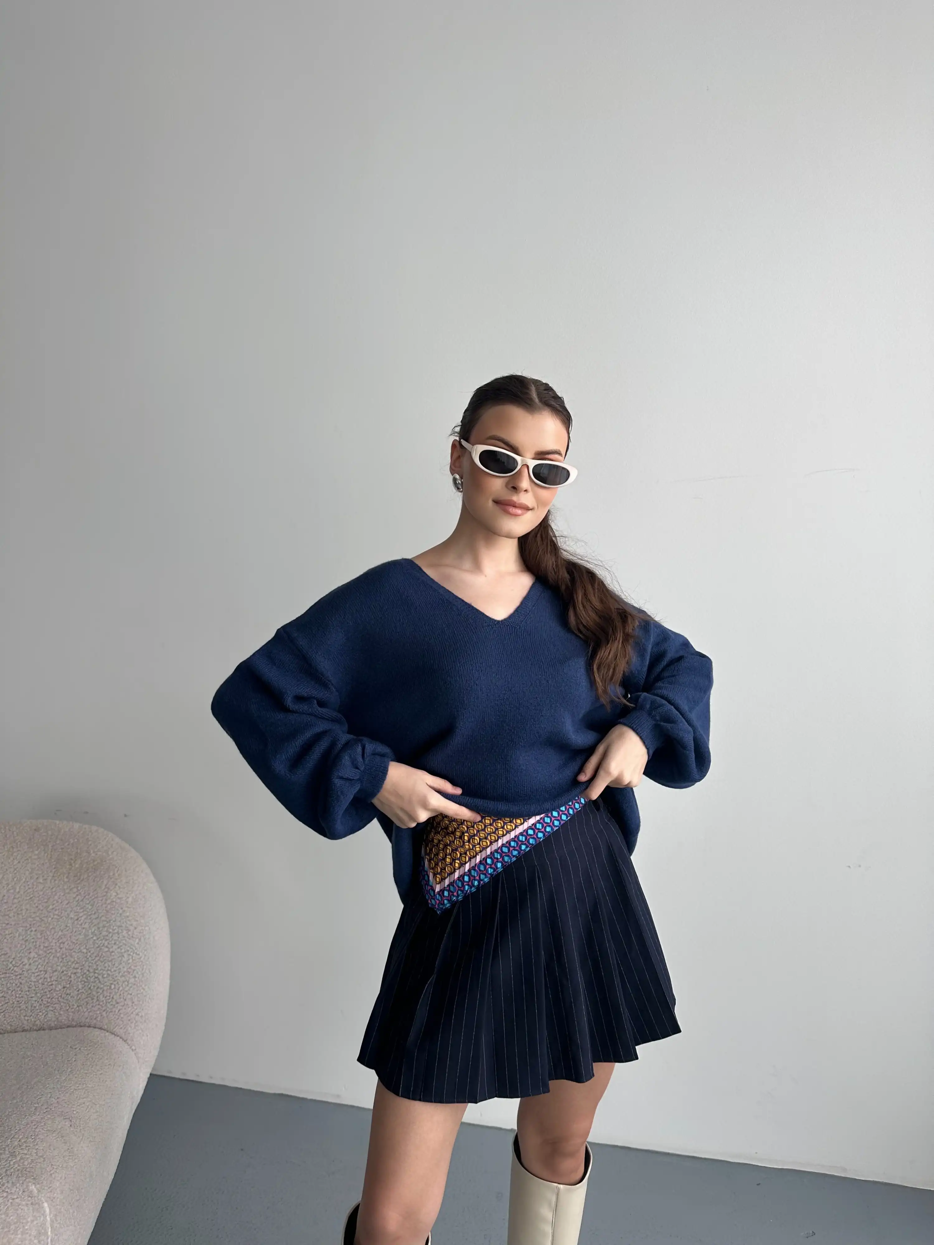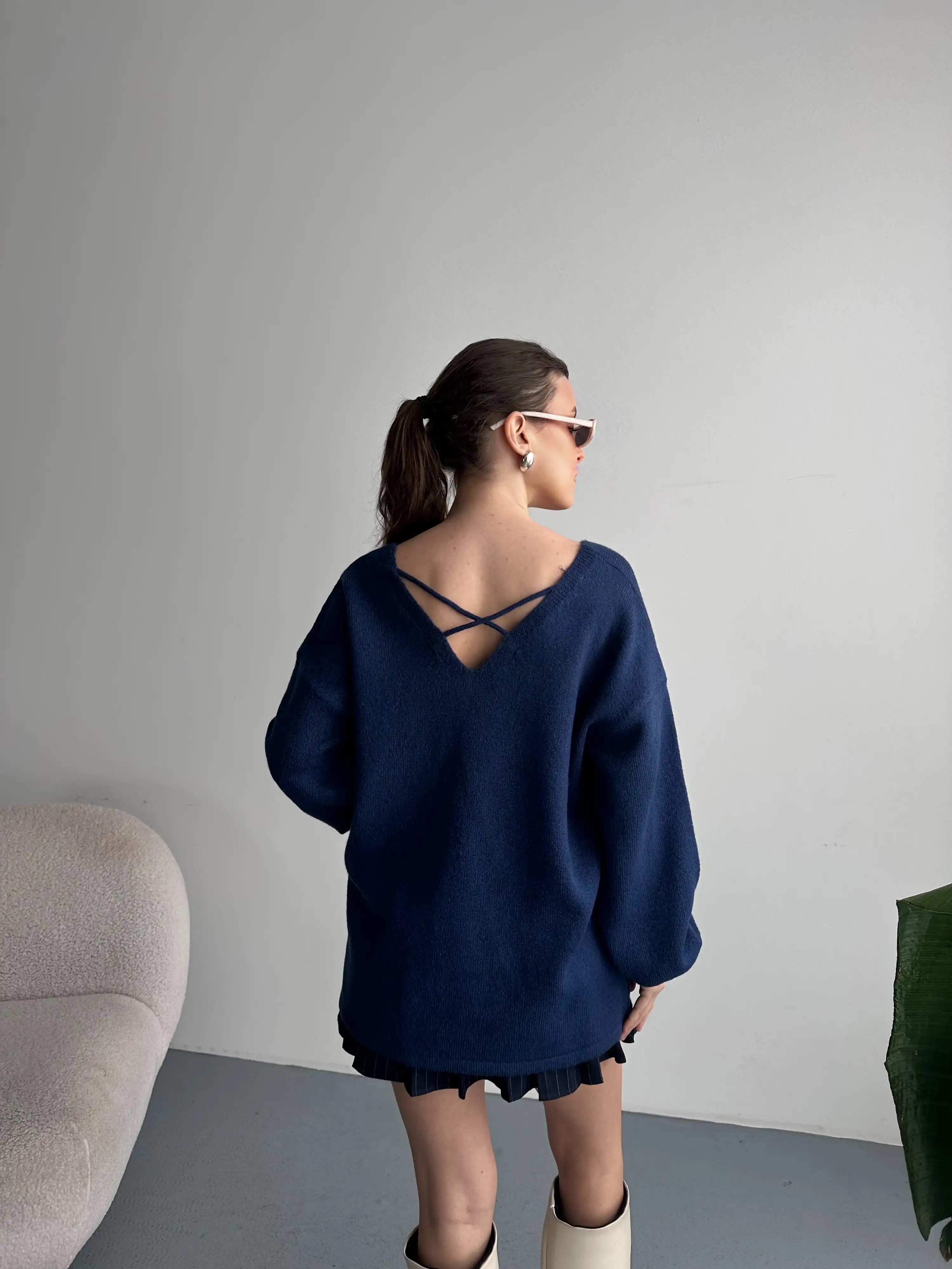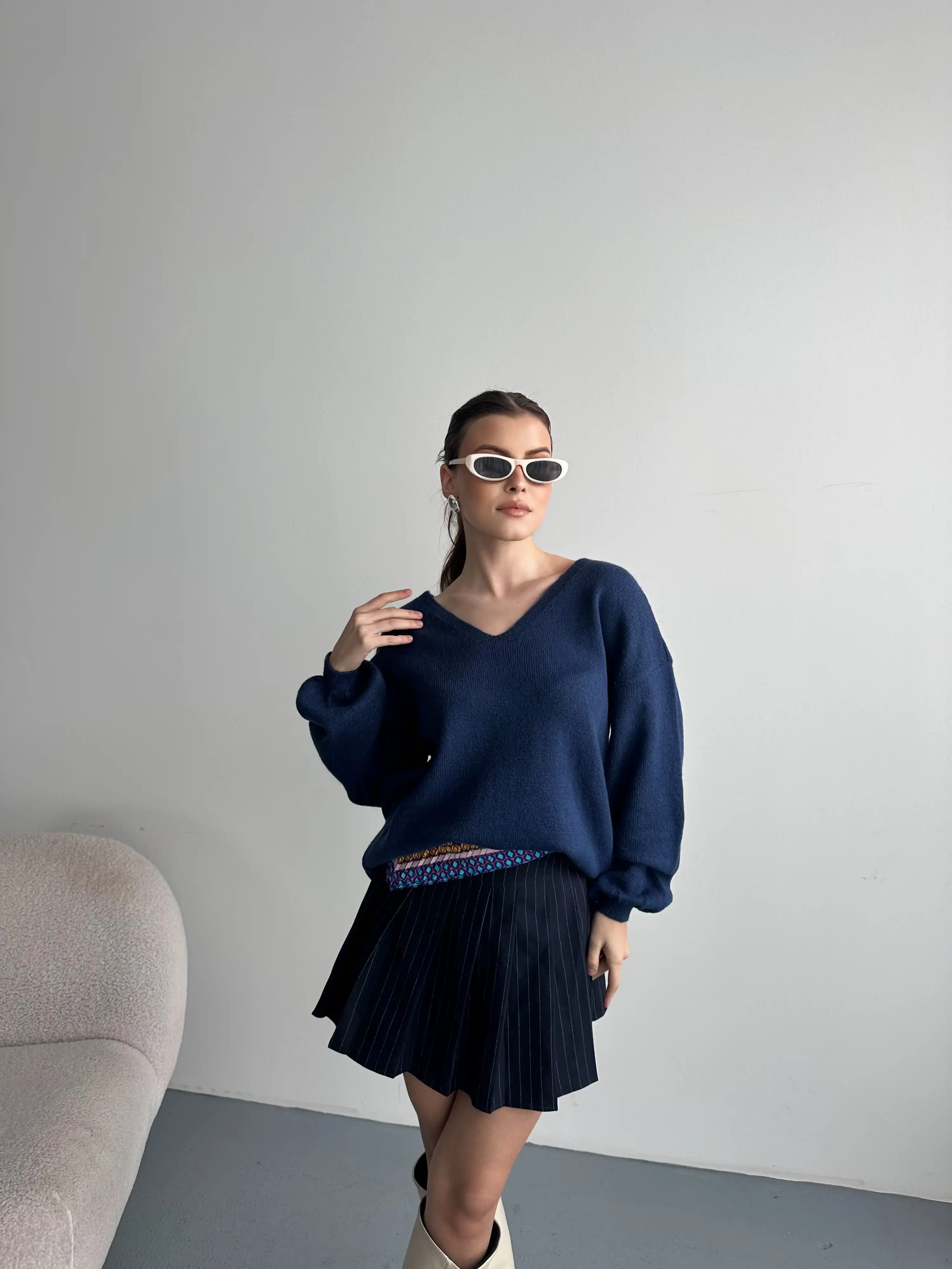 V YAKA YUMUŞAK DOKULU KAZAK-LACİVERT