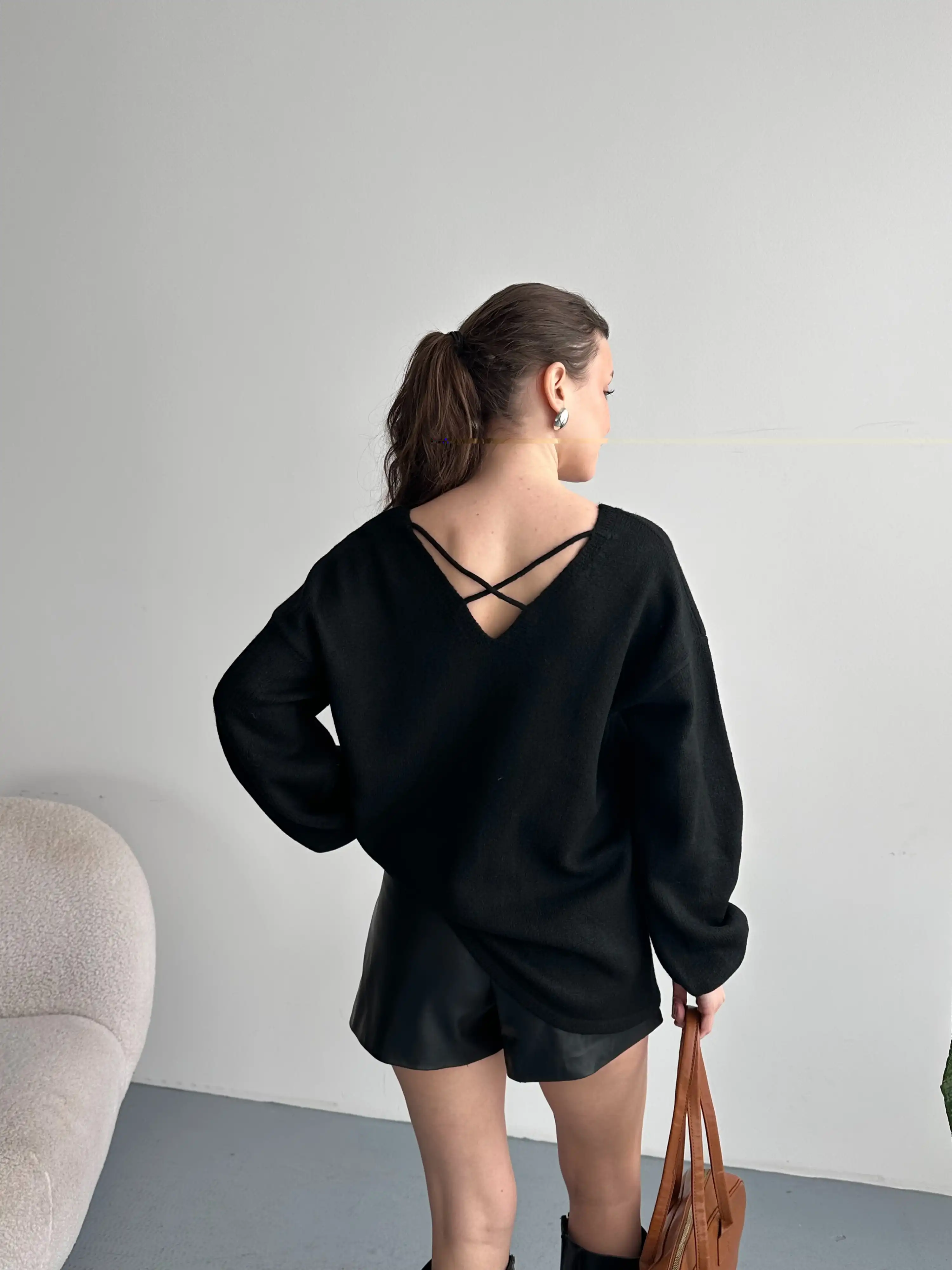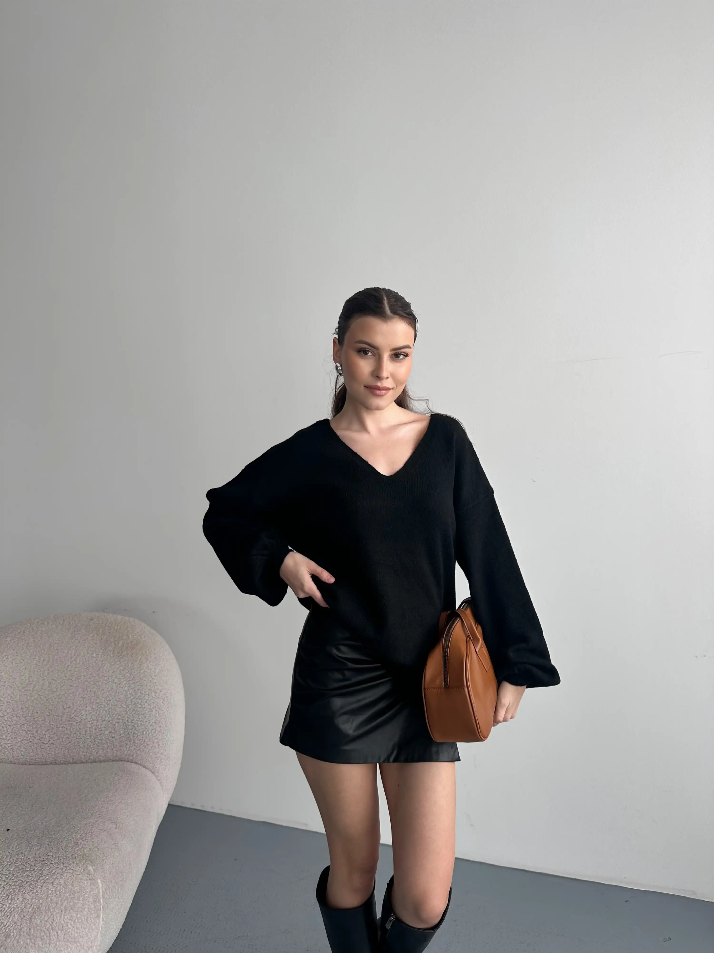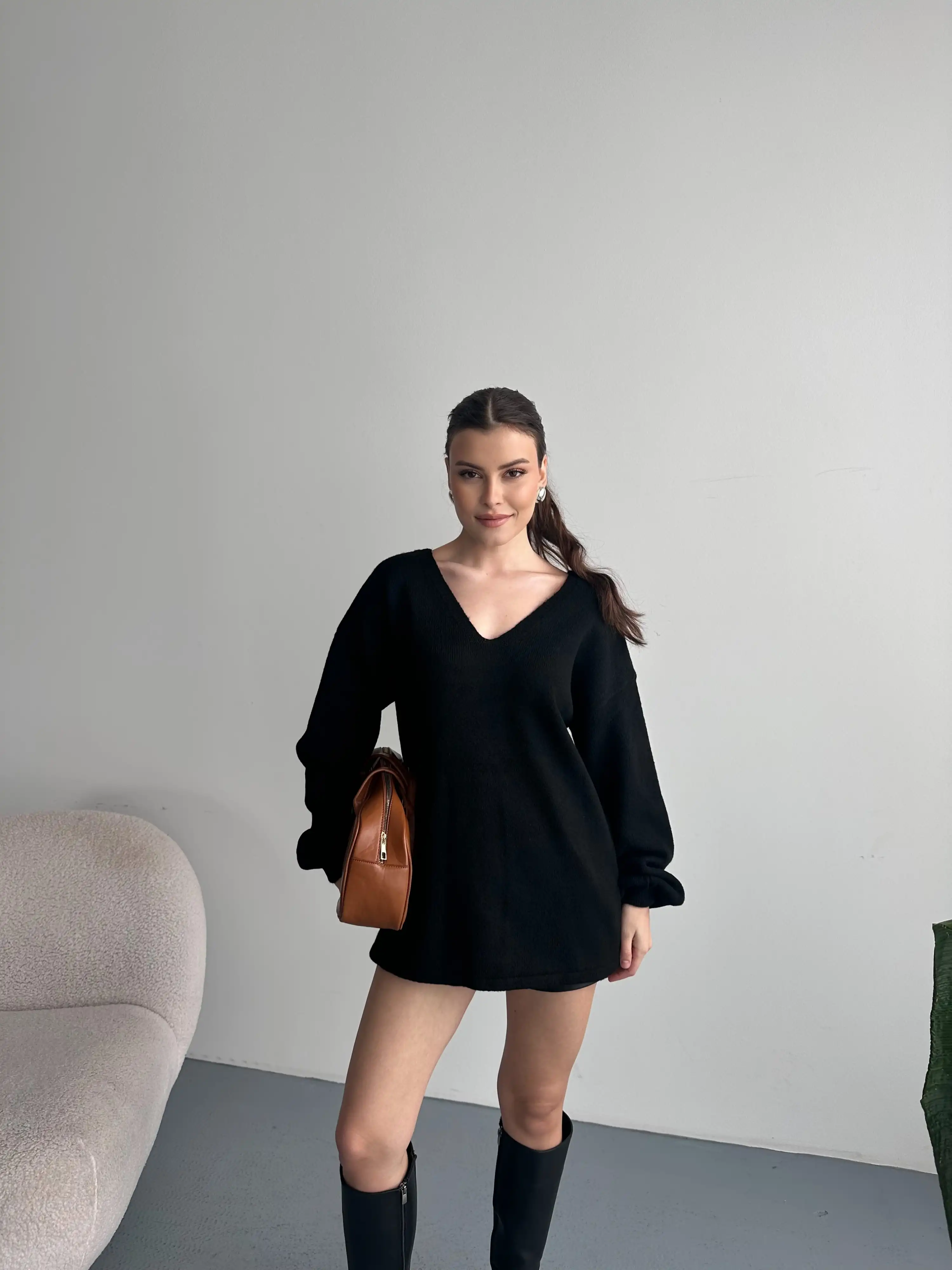 V YAKA YUMUŞAK DOKULU KAZAK-SİYAH