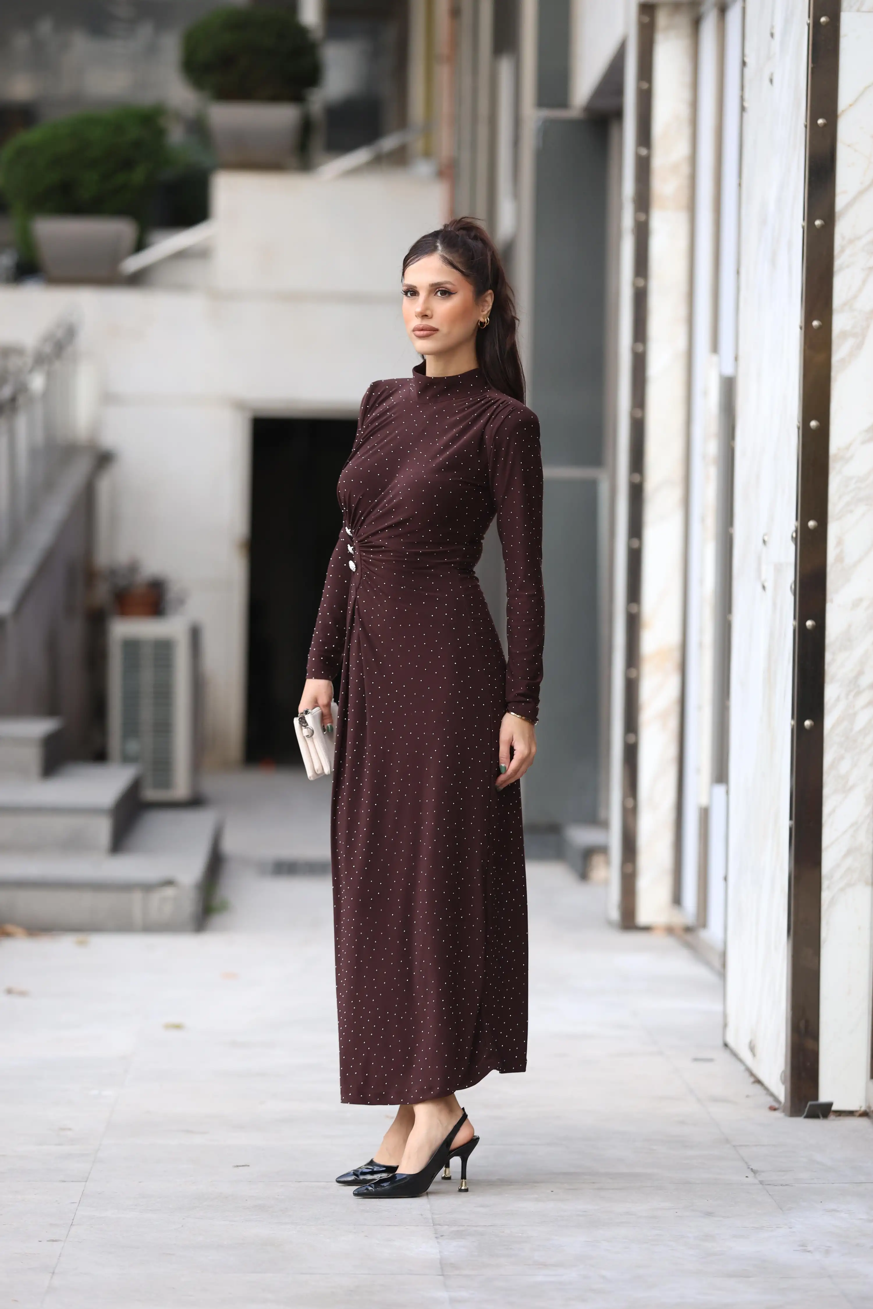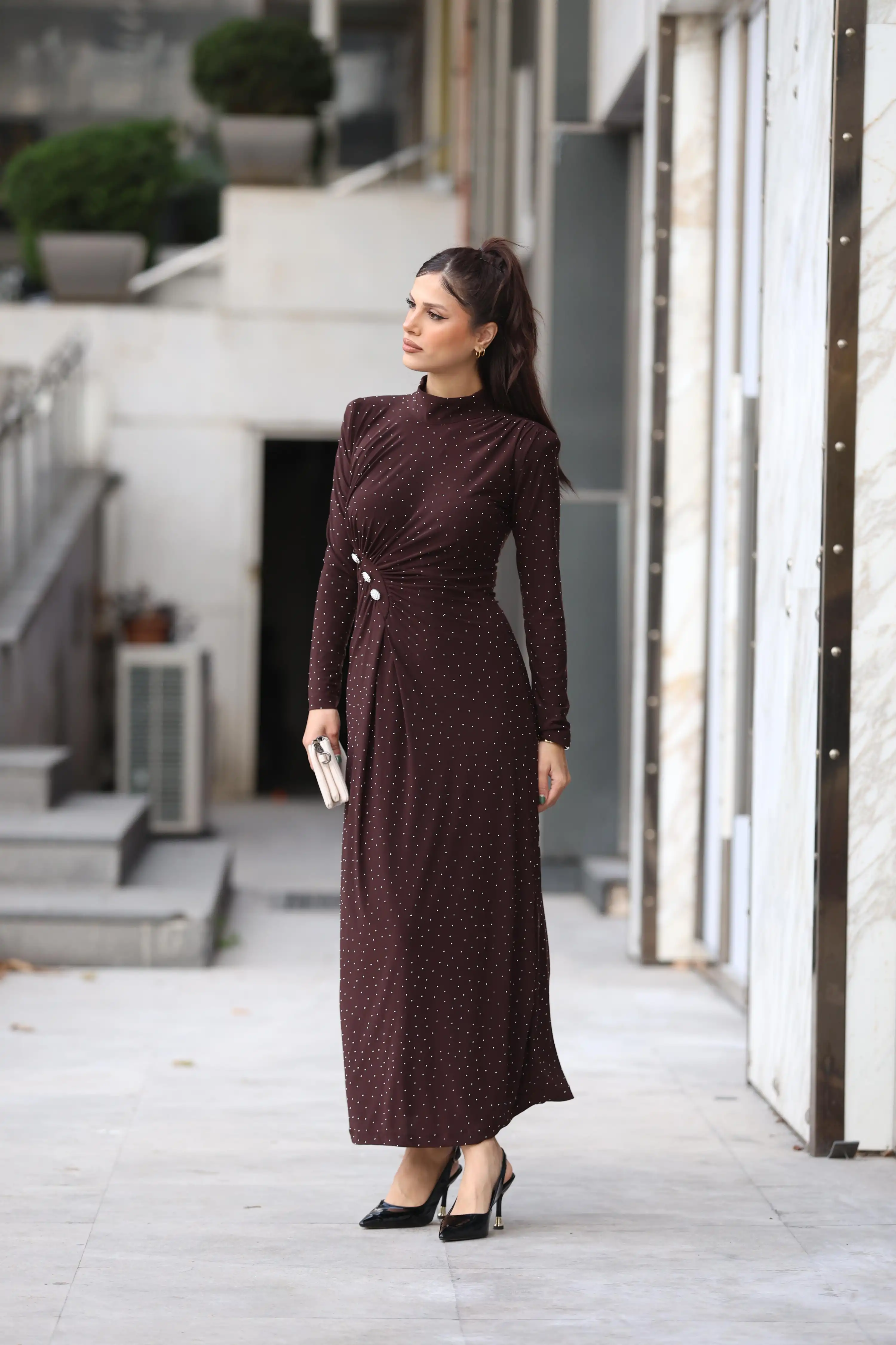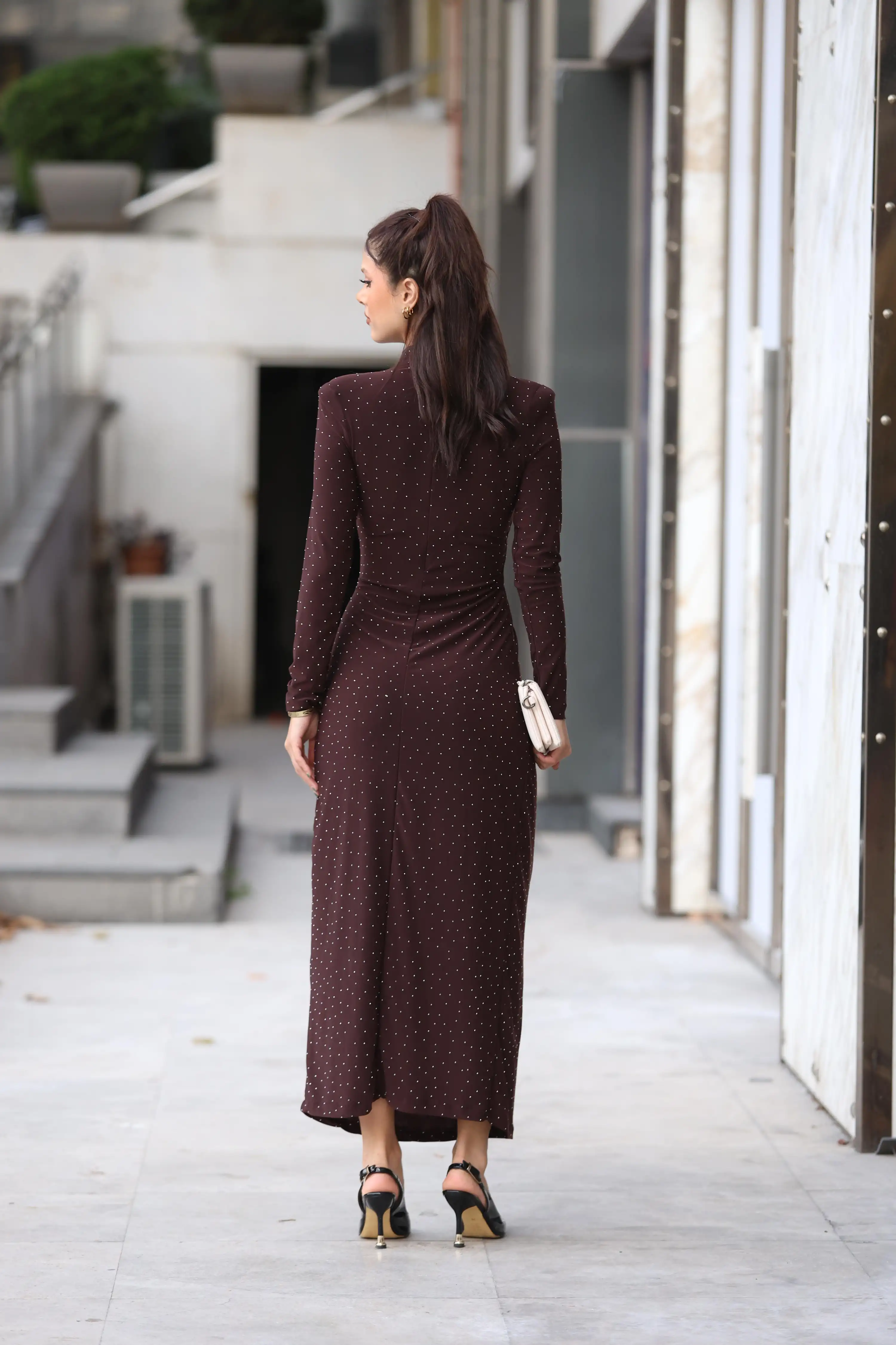 VATKALI DRAPELİ TAŞLI ELBİSE-KAHVE