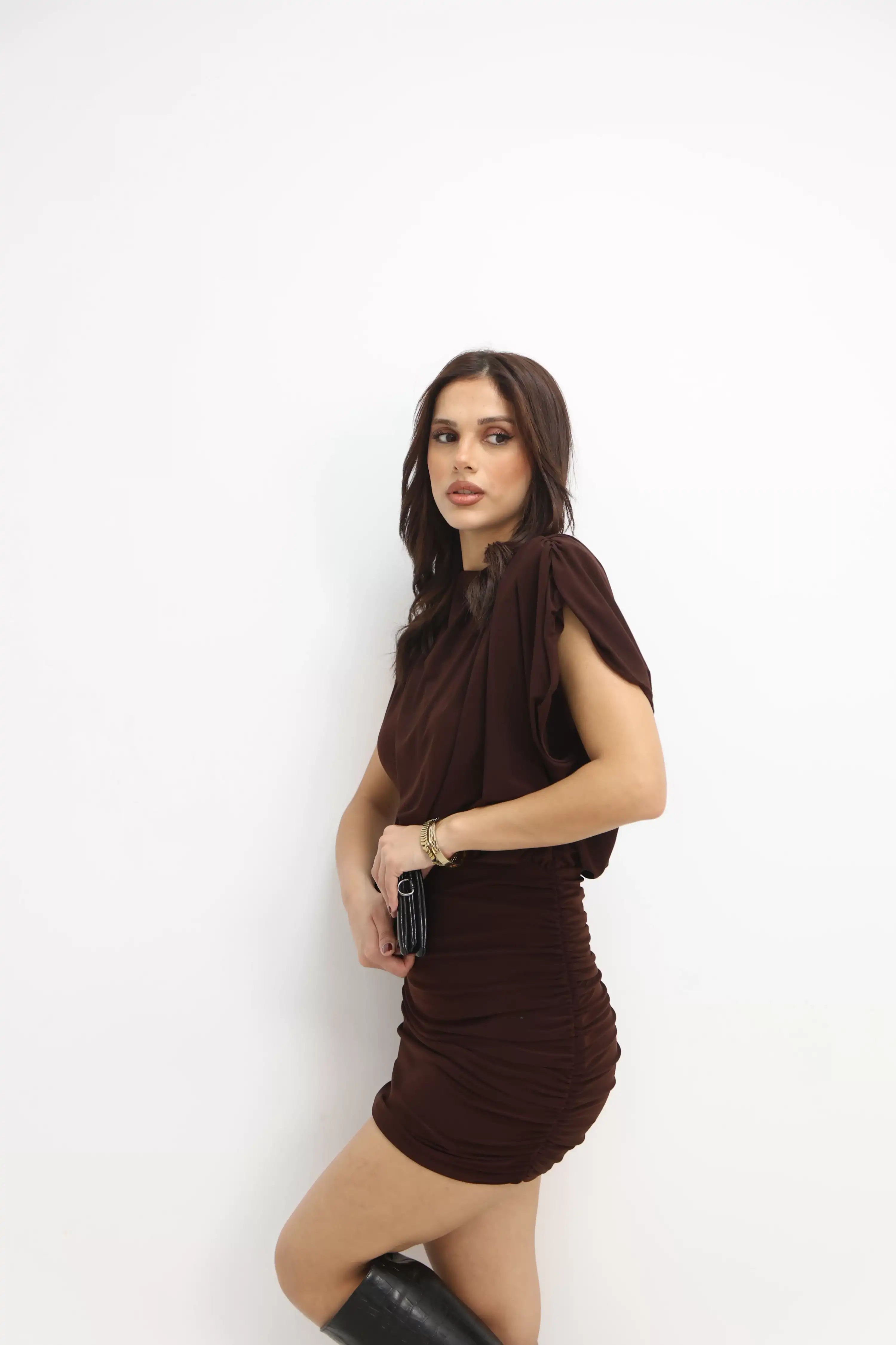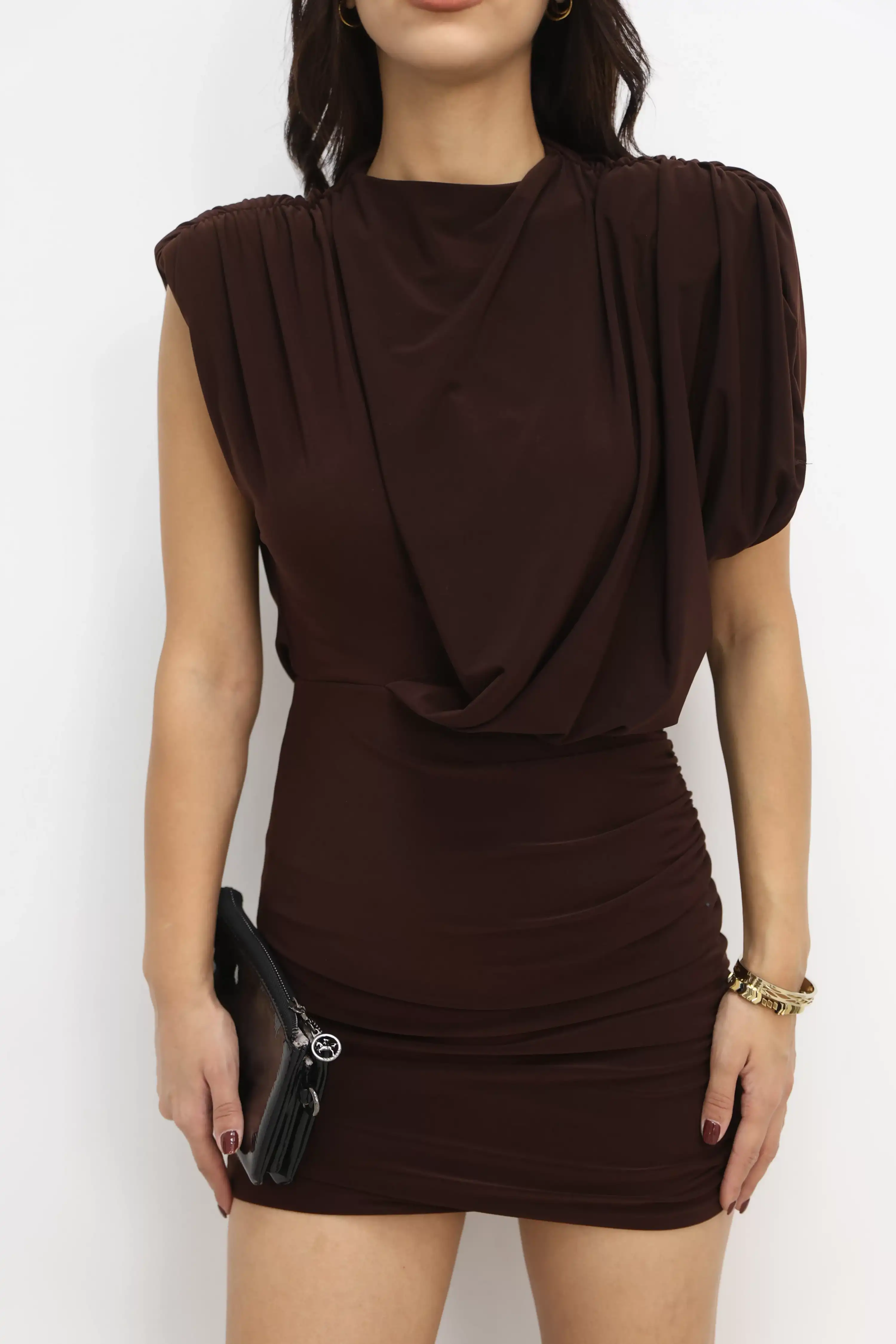 VATKALI MİNİ DRAPELİ ELBİSE-KAHVE