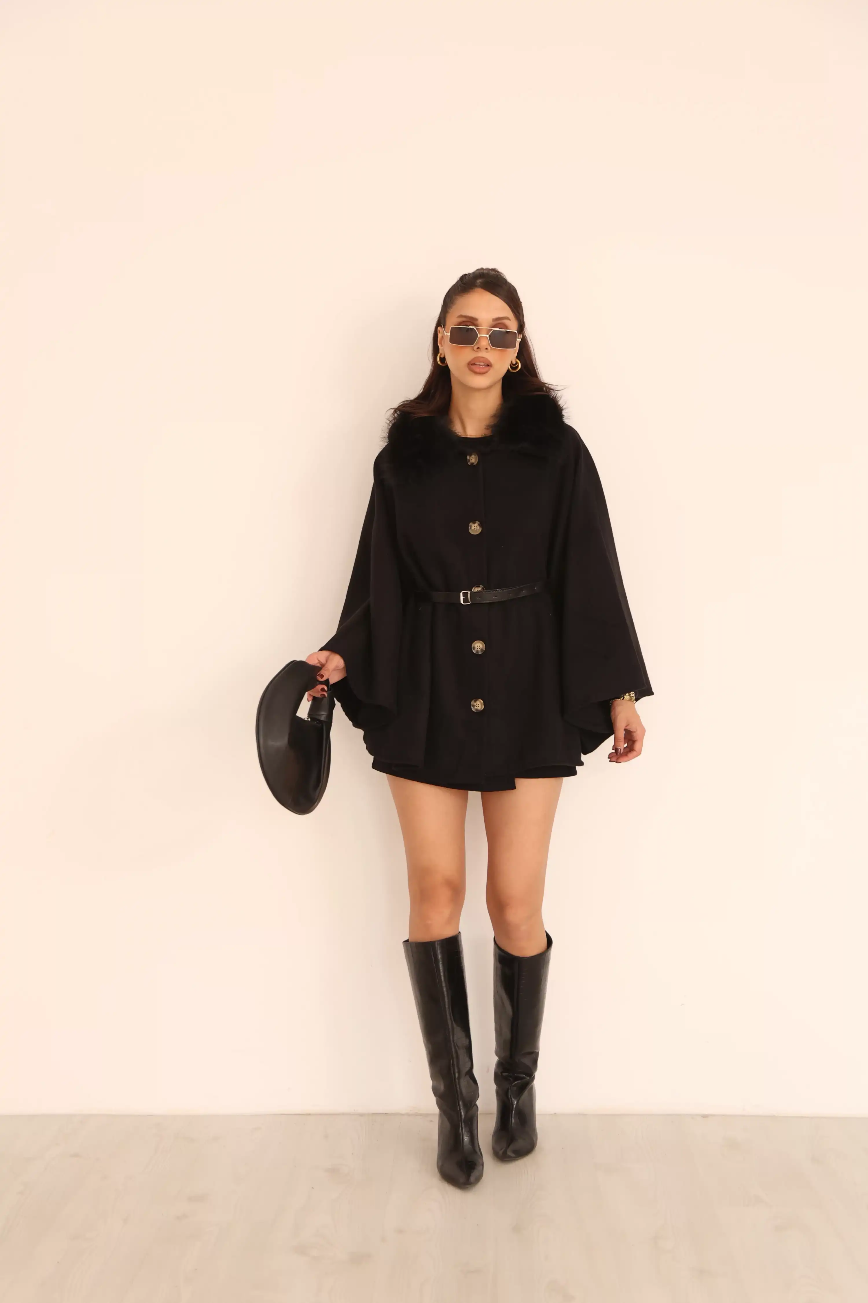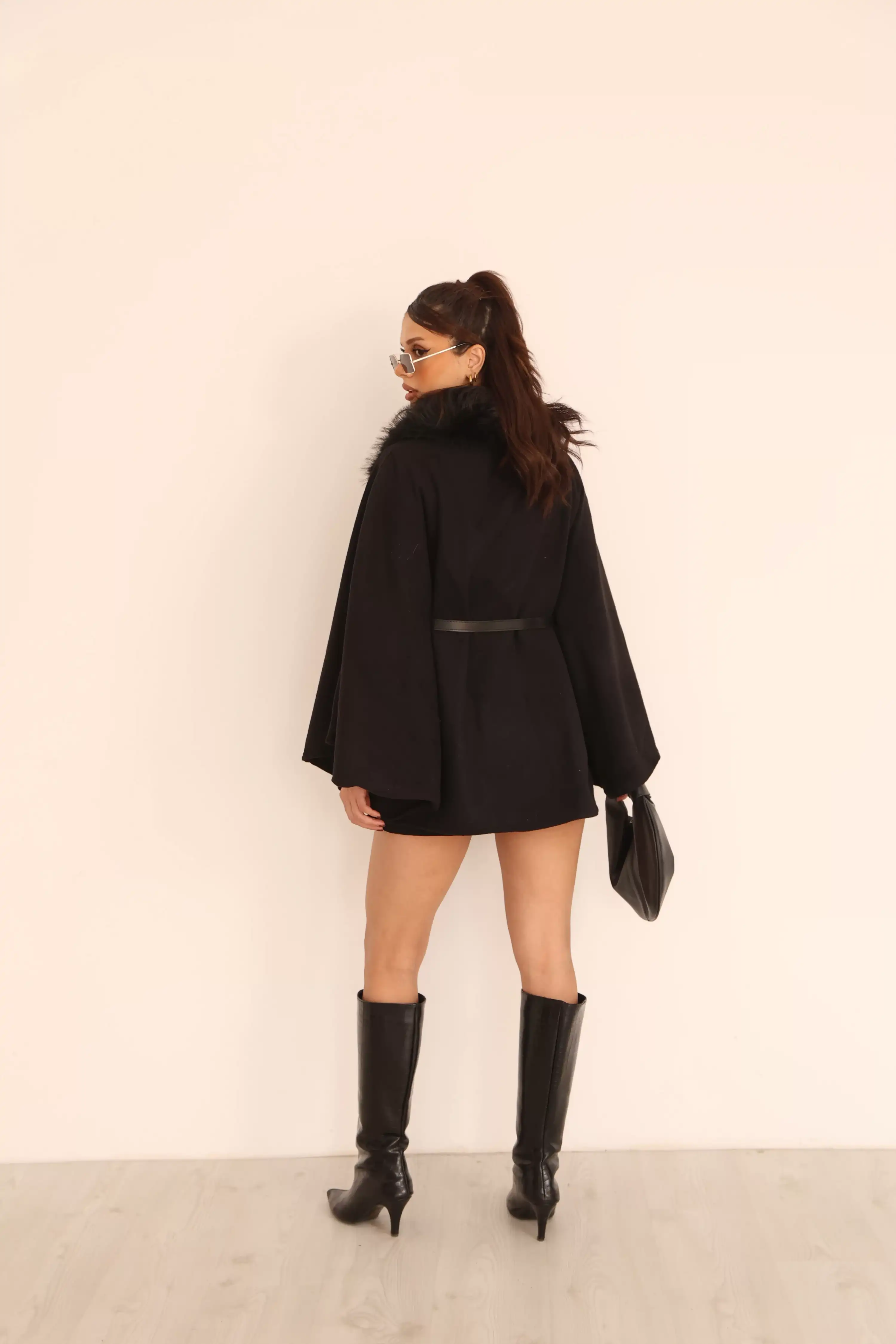 YAKA KÜRK KEMERLİ PANÇO-SİYAH