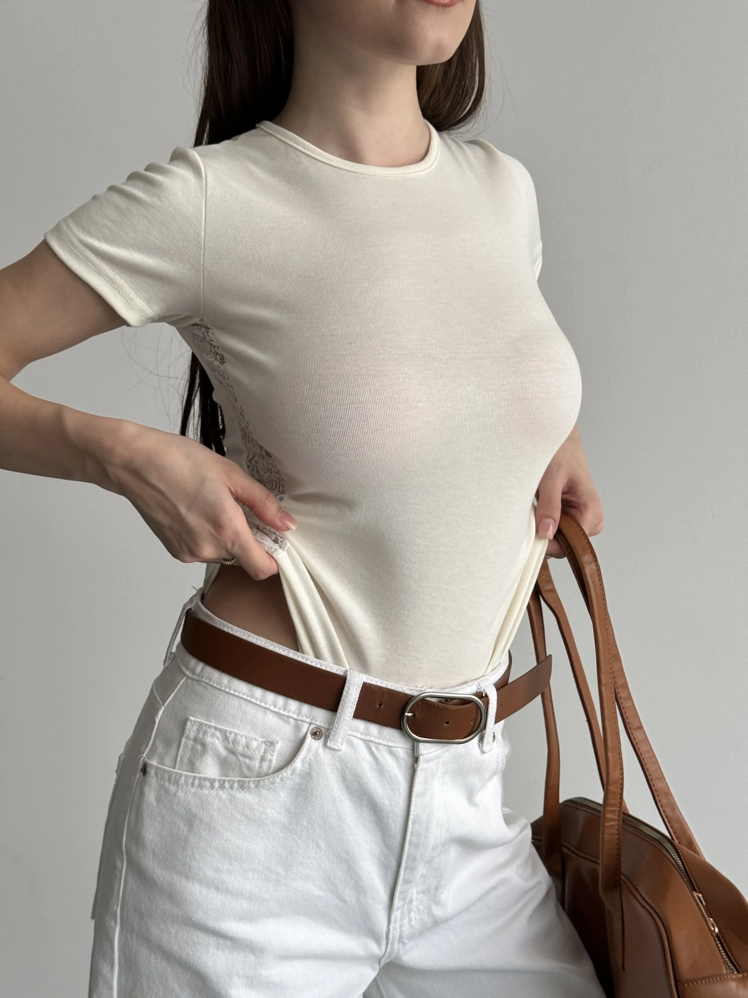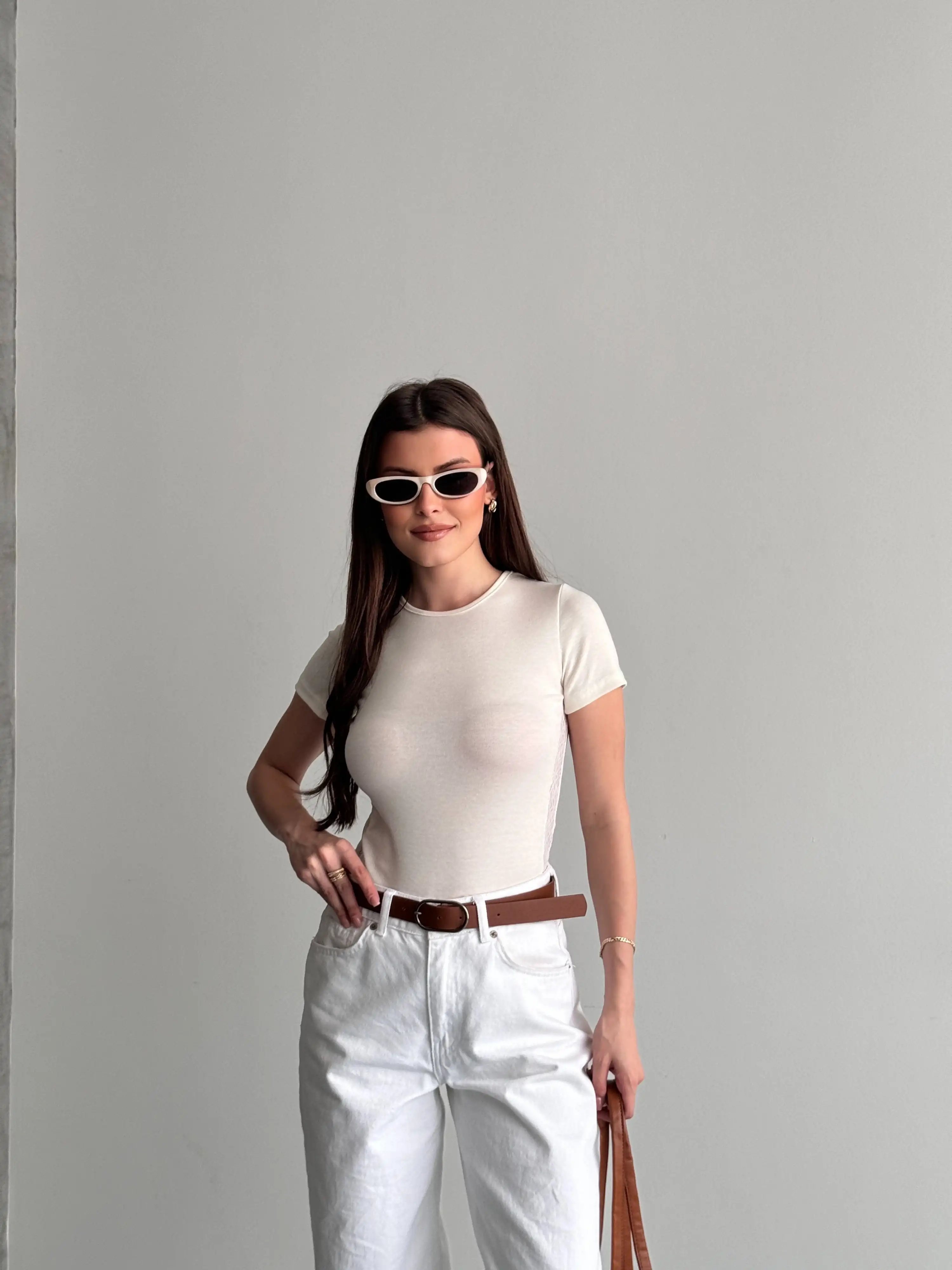 YANDAN DANTEL GEÇİŞLİ KISA KOLLU BODYSUİT-KREM