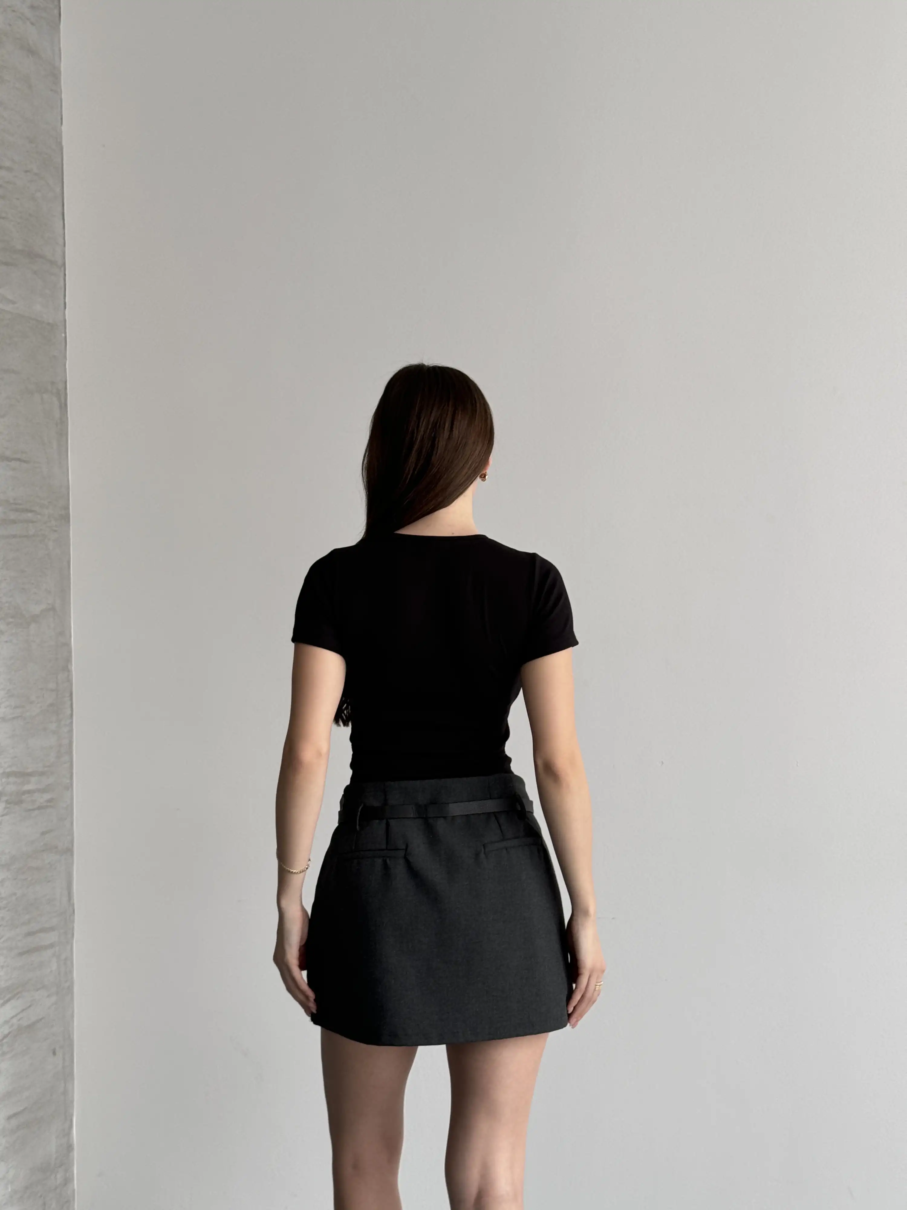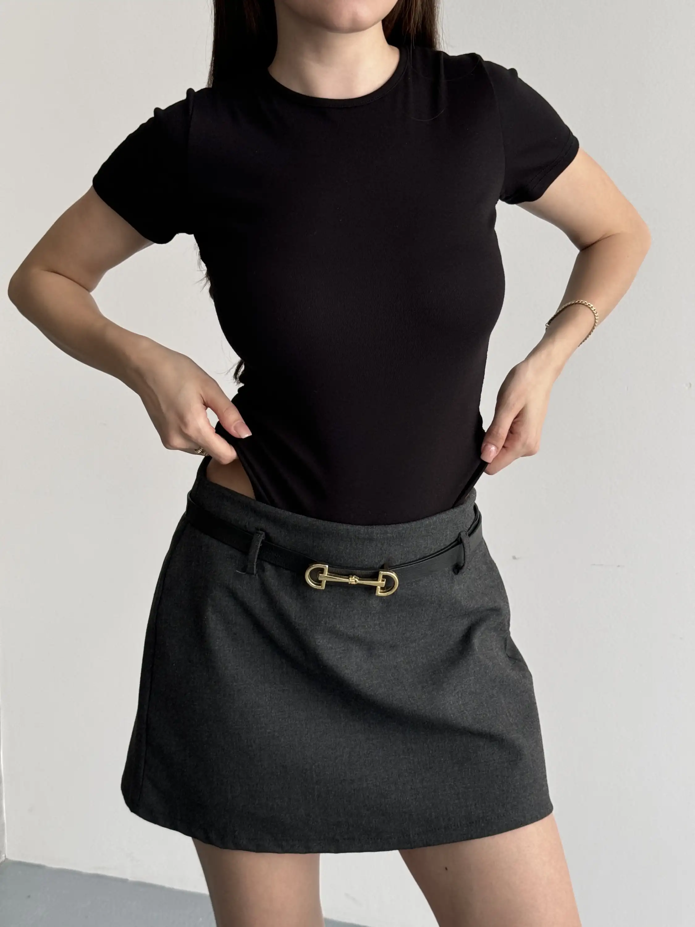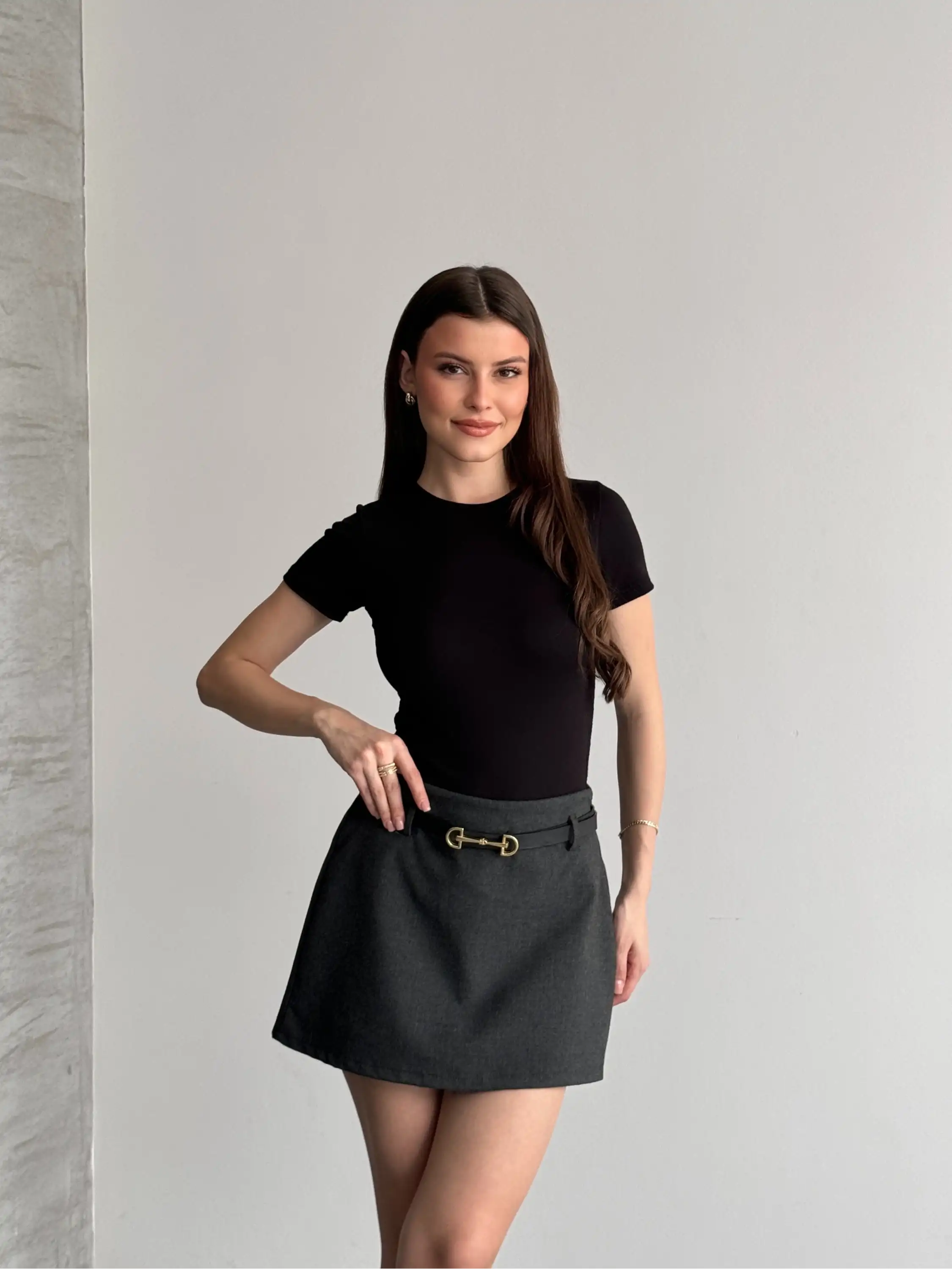 BEL GARNİLİ PİLELİ ŞORT ETEK-GRİ
