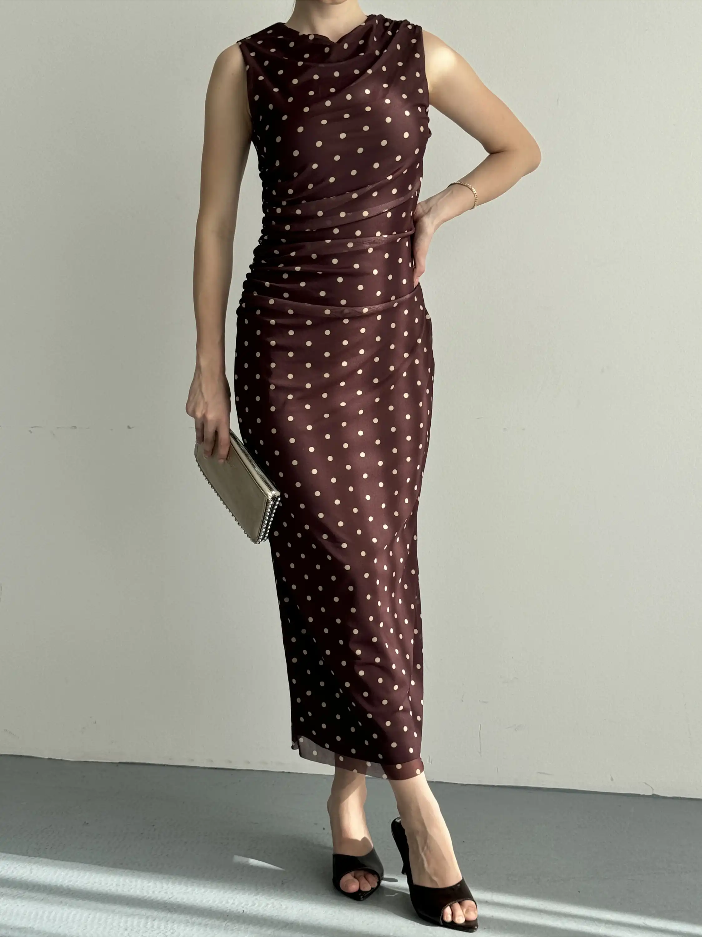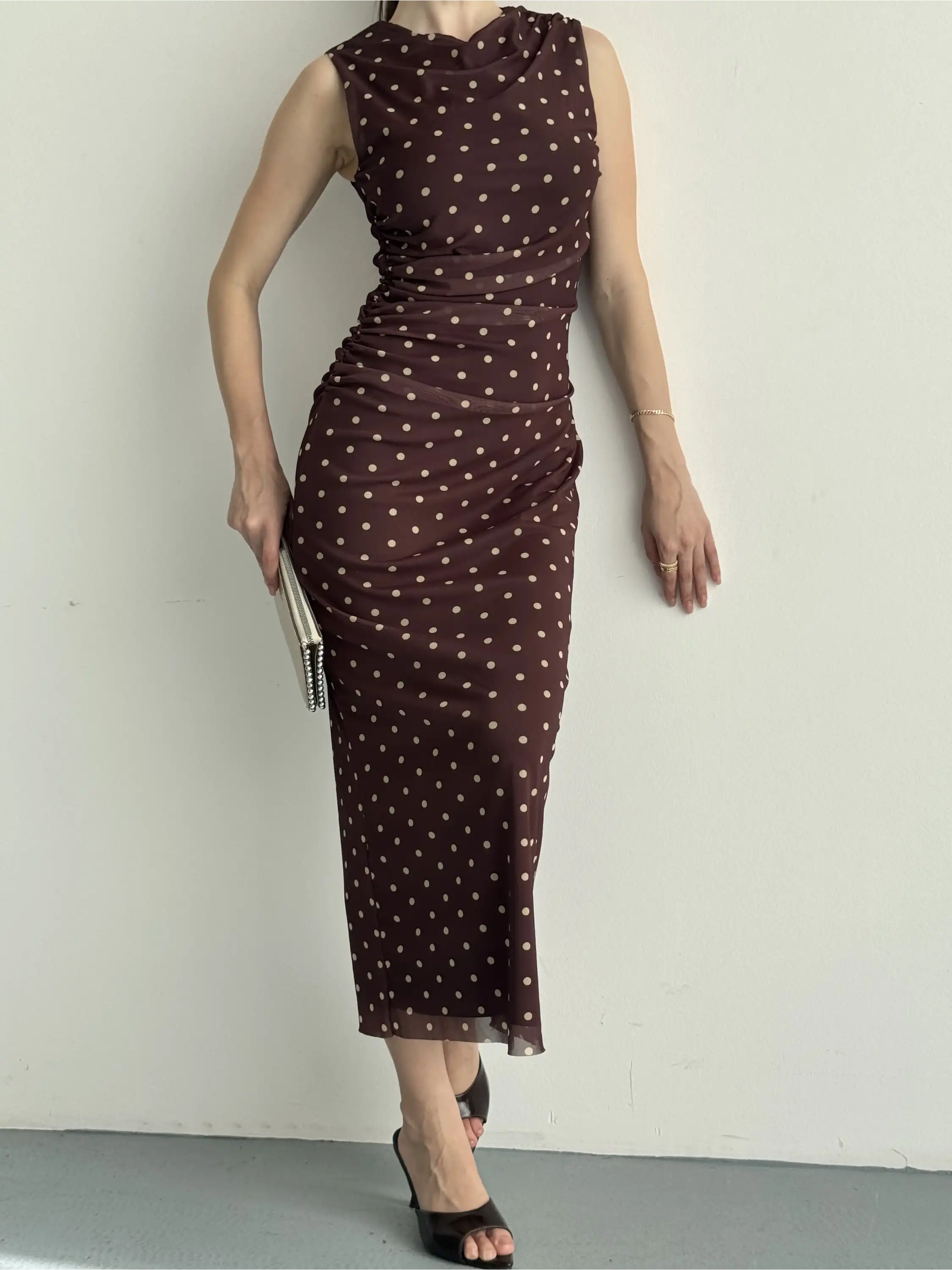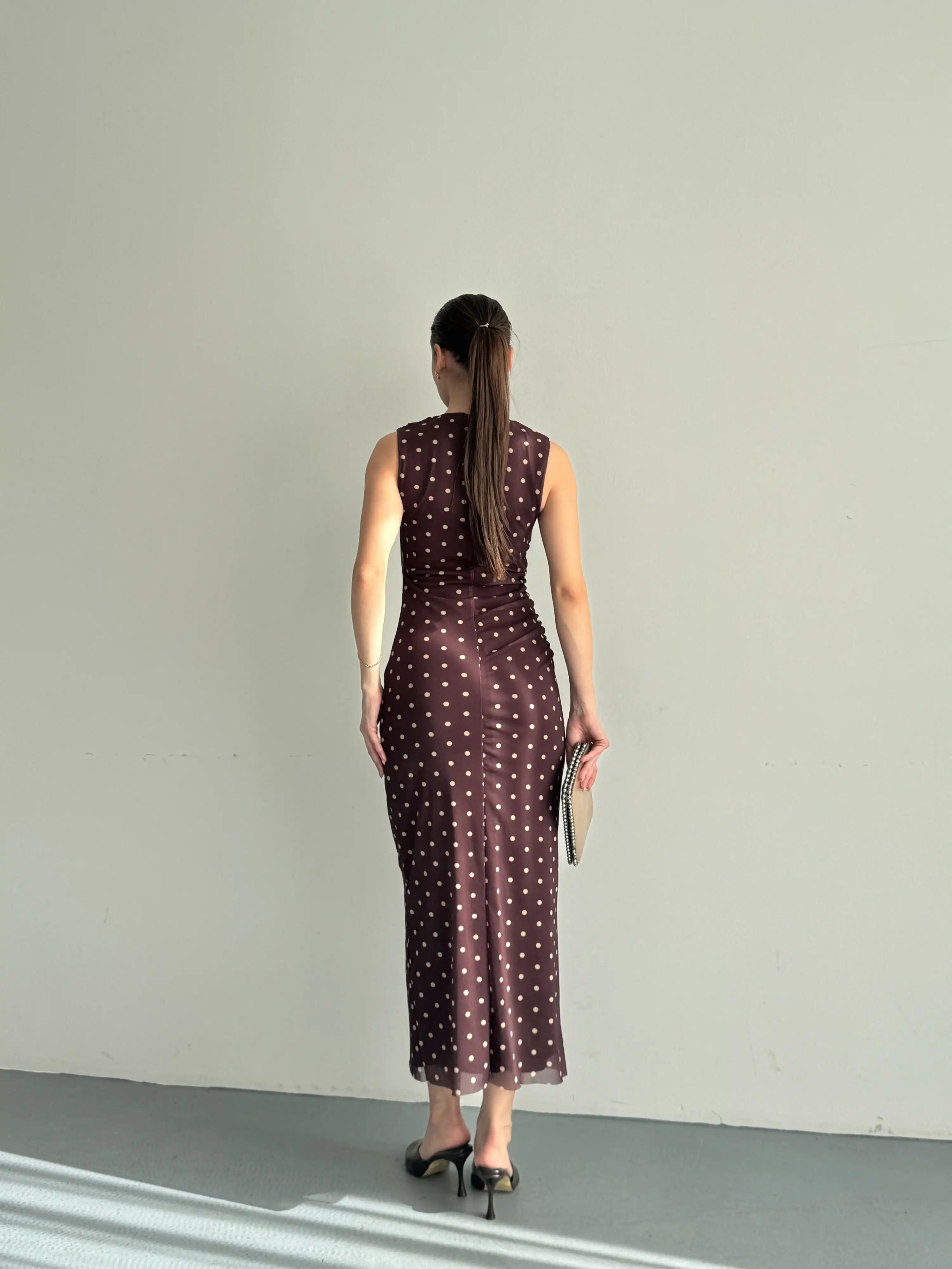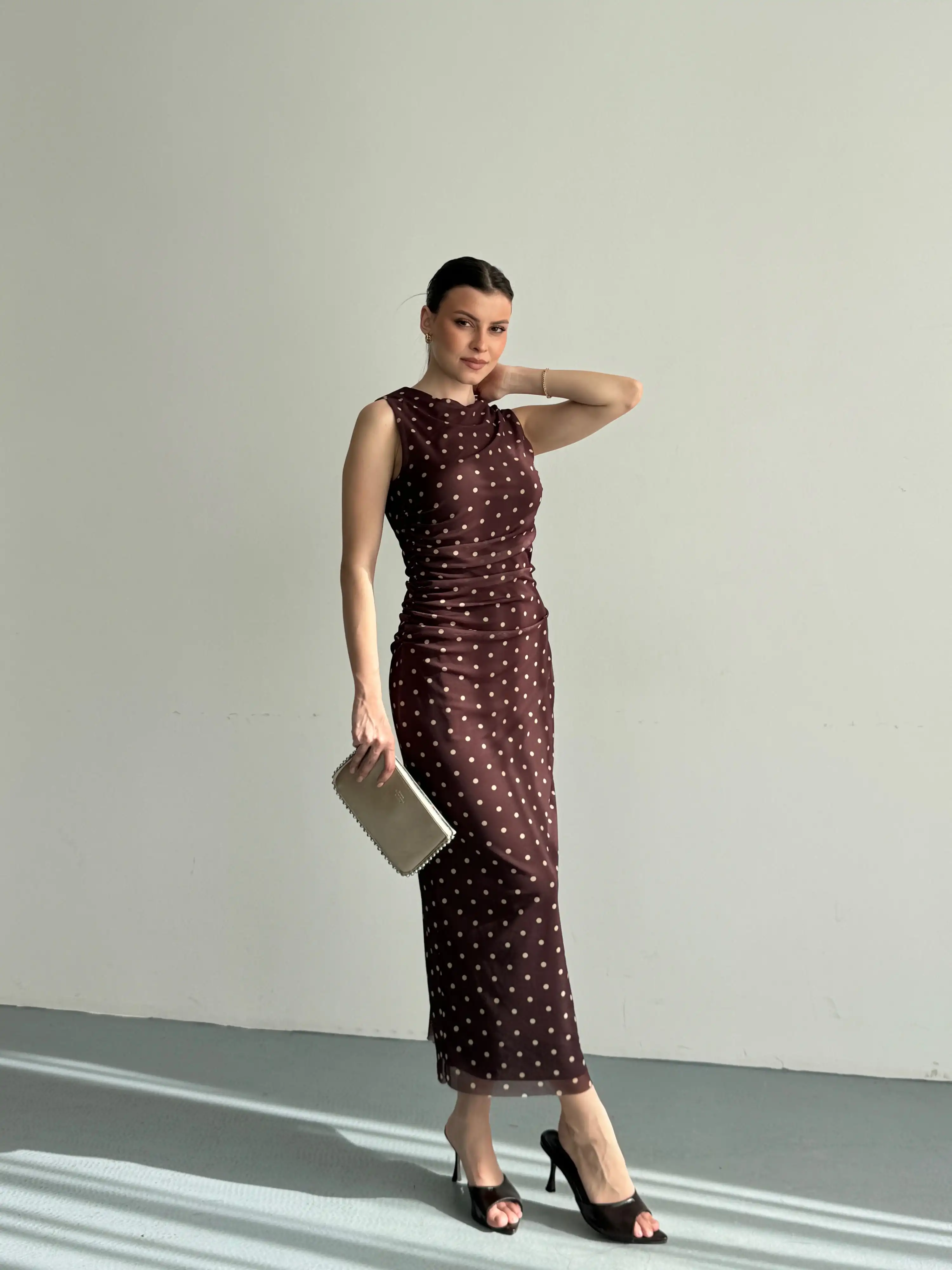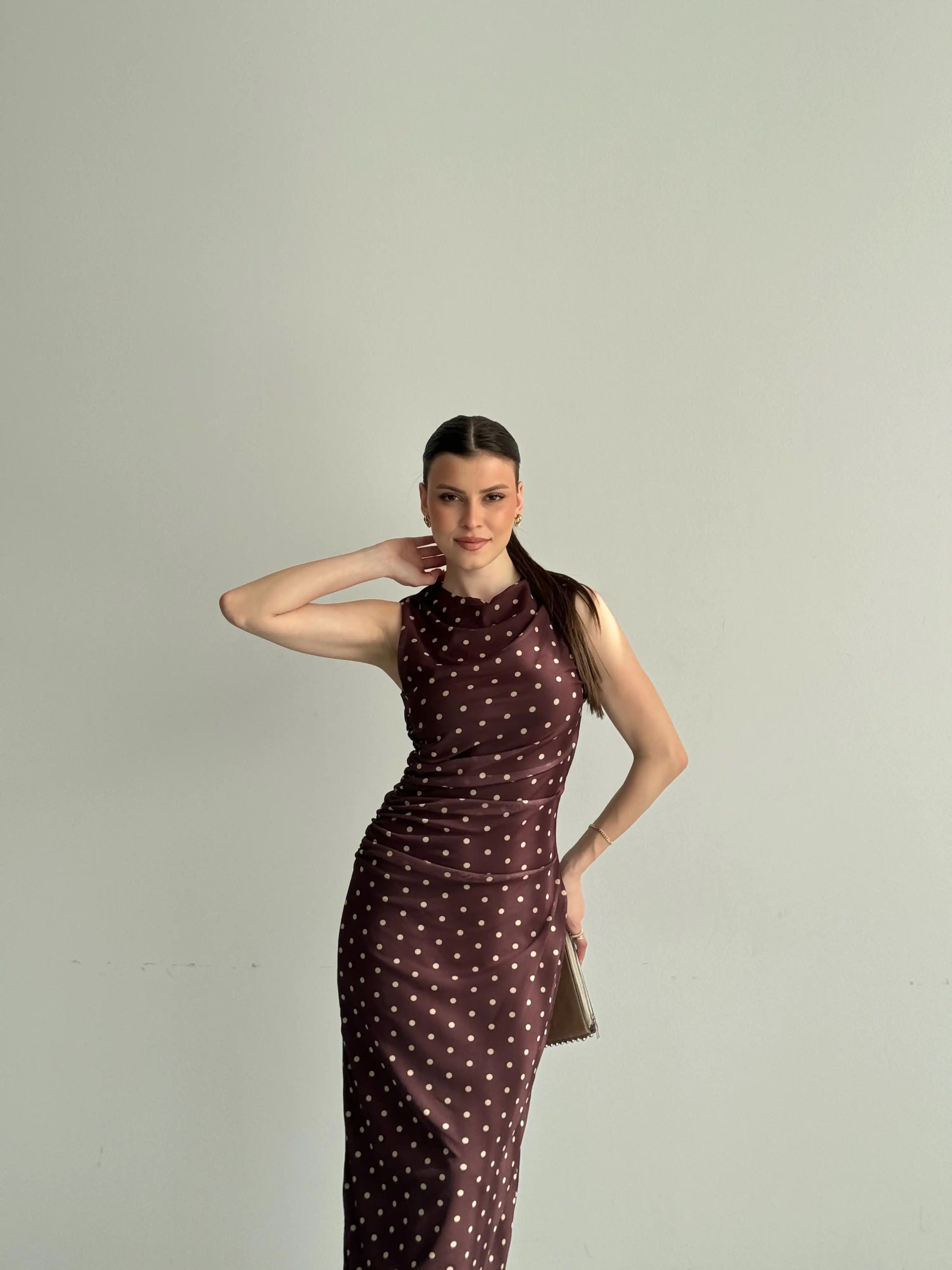 YANDAN DRAPELİ SIFIR KOL PUANTİYELİ ELBİSE-KAHVE
