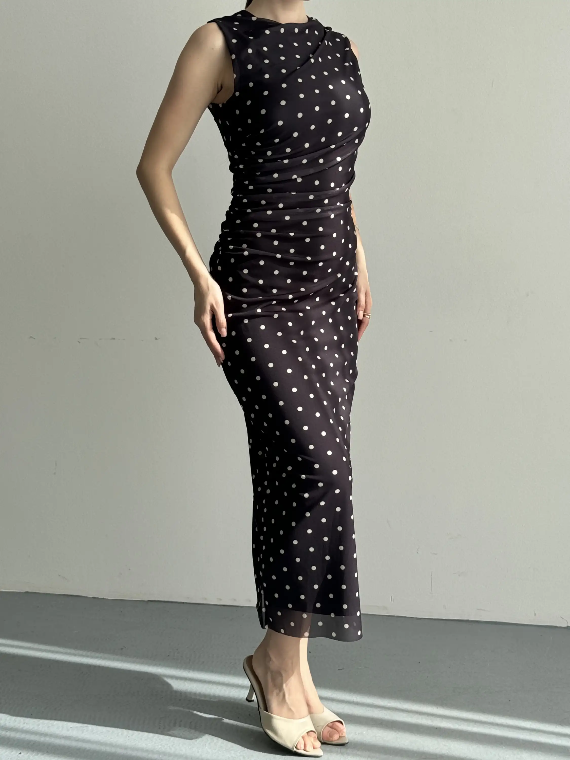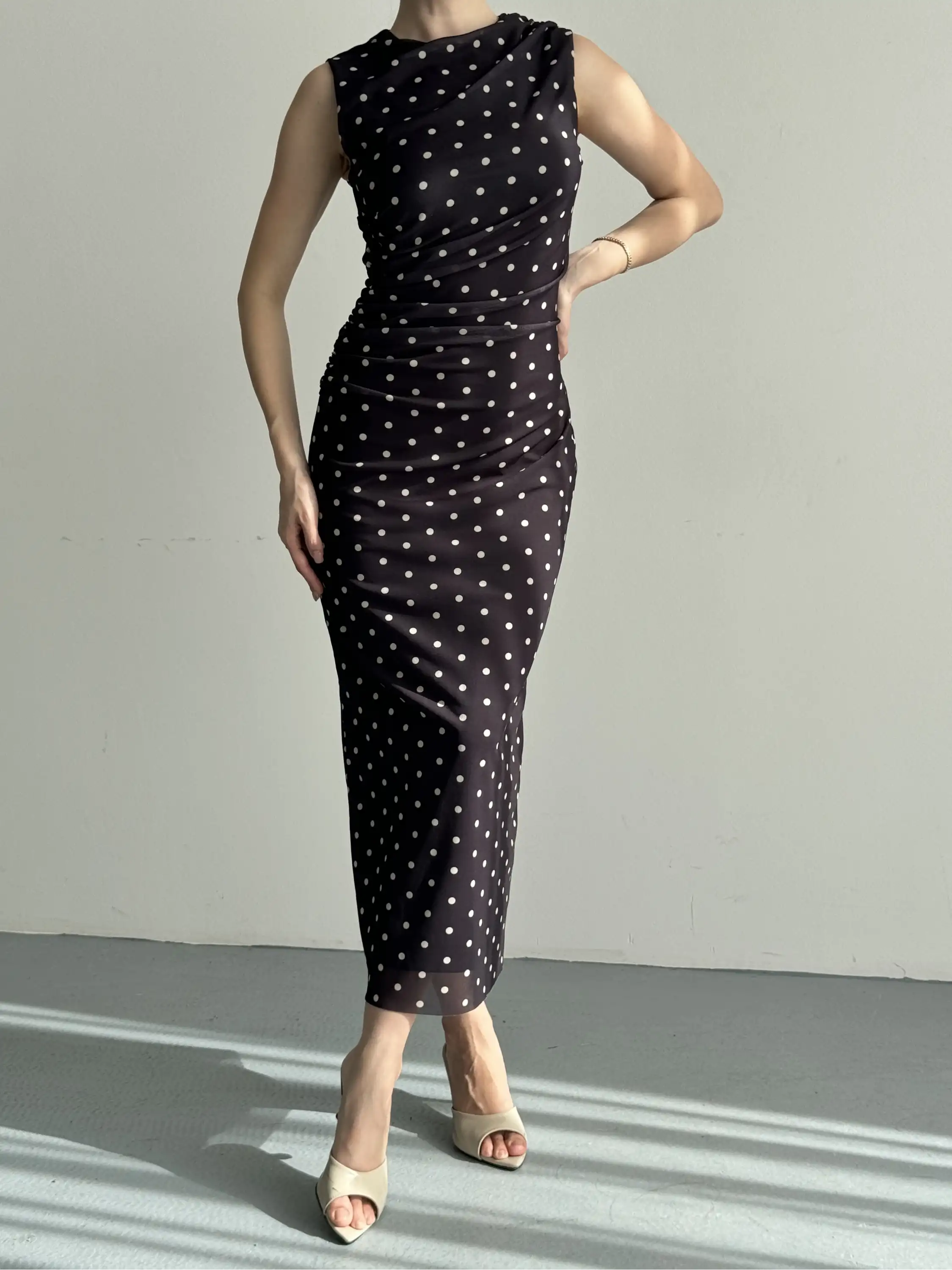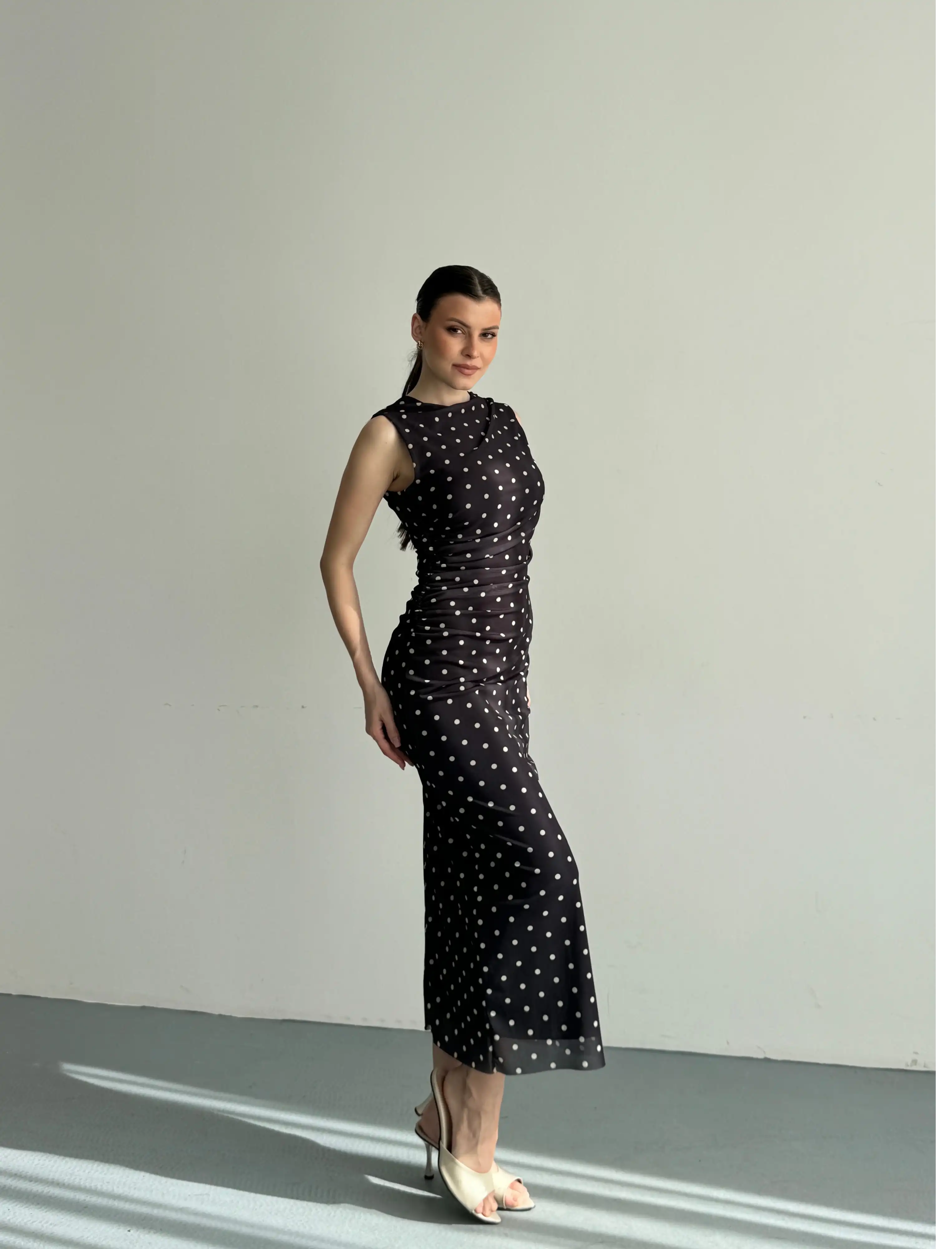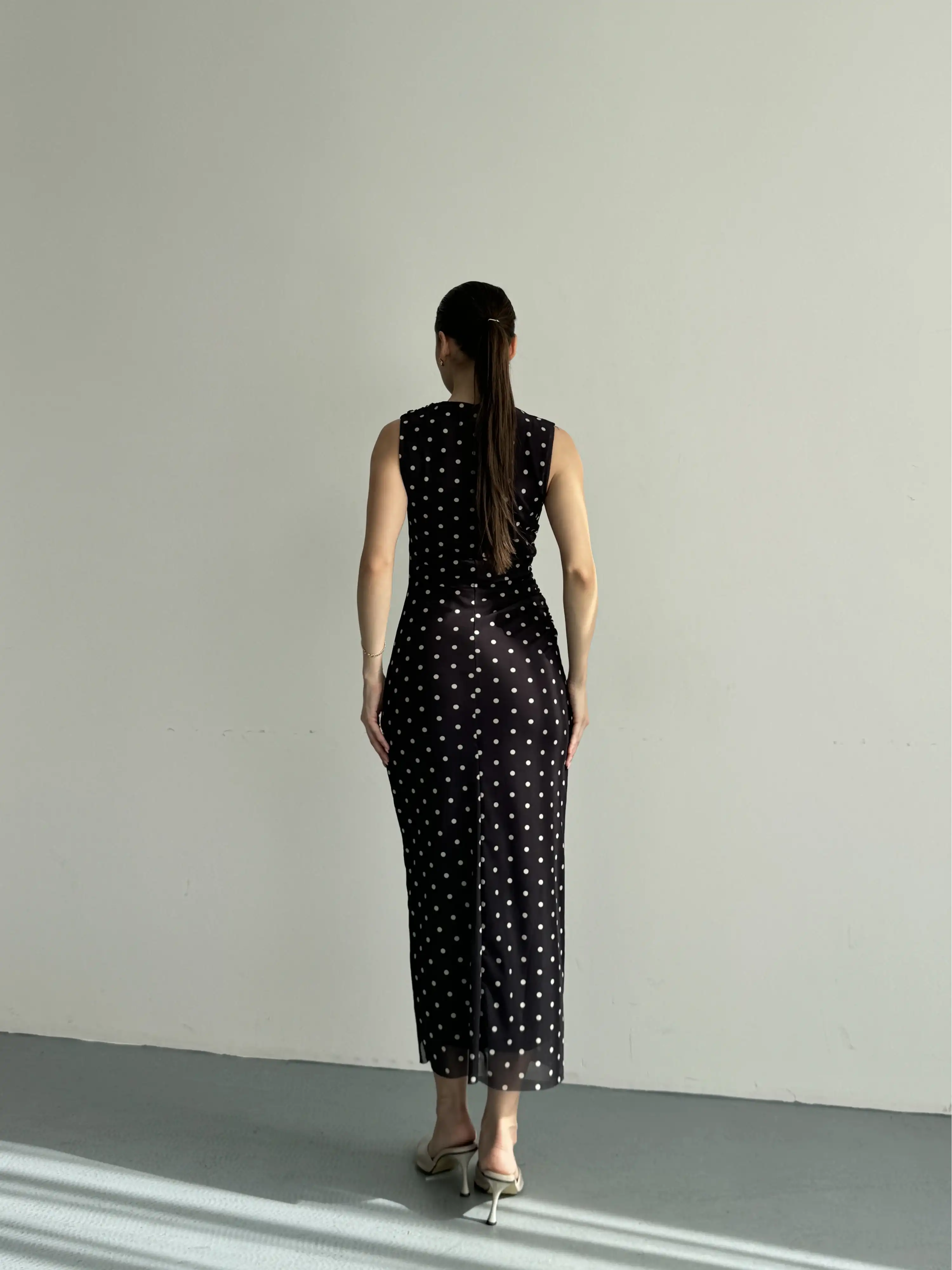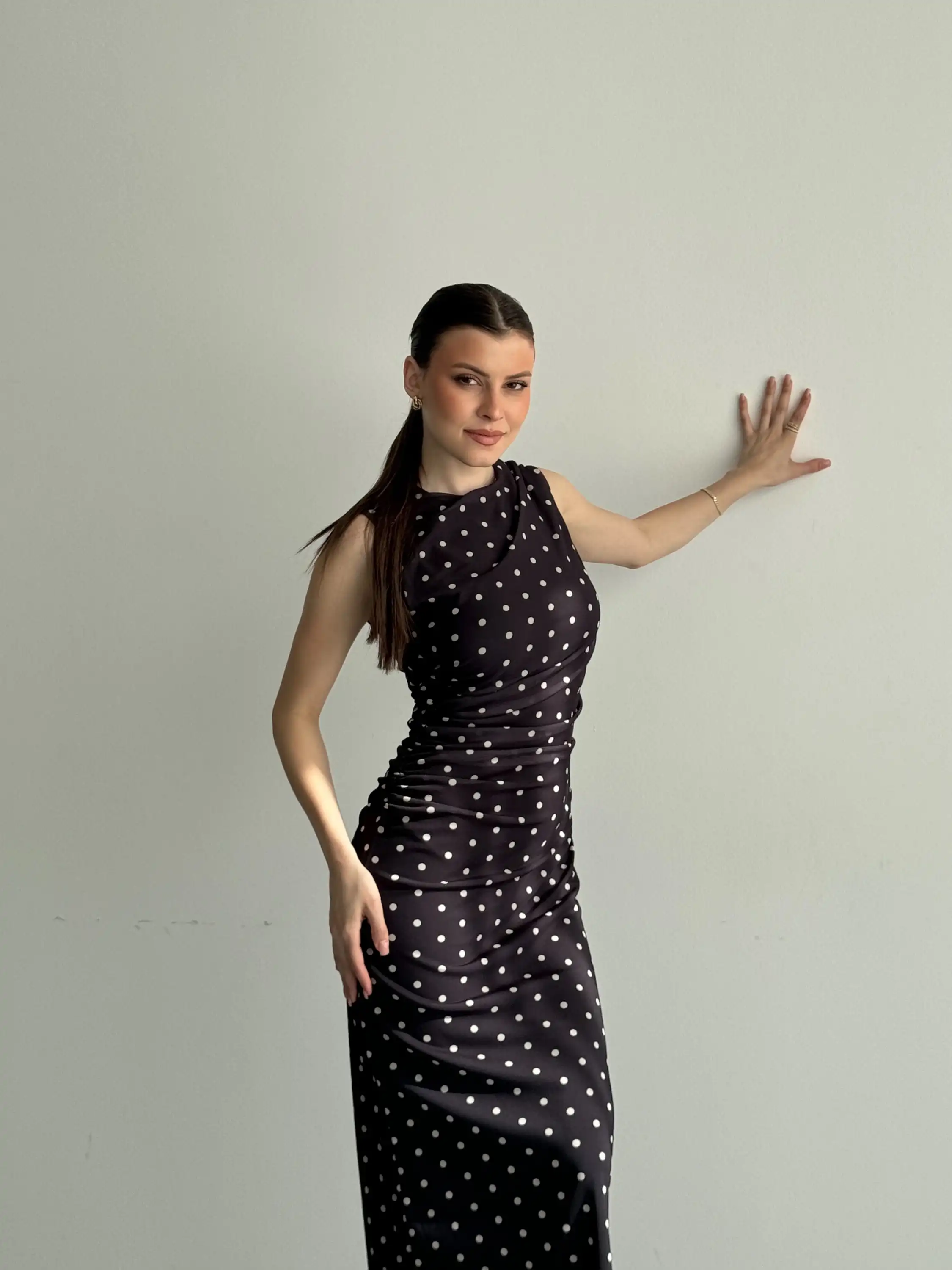 YANDAN DRAPELİ SIFIR KOL PUANTİYELİ ELBİSE-SİYAH