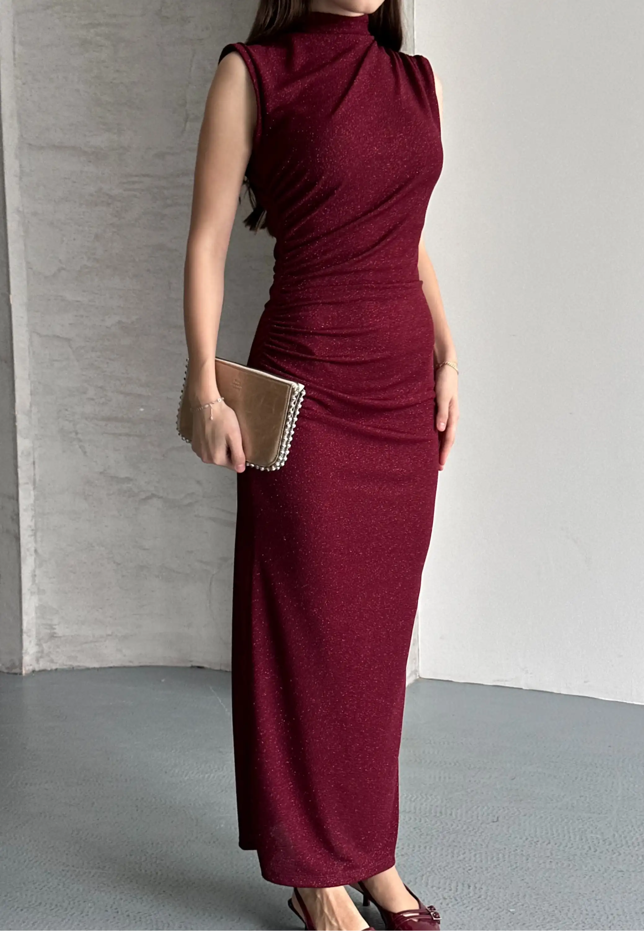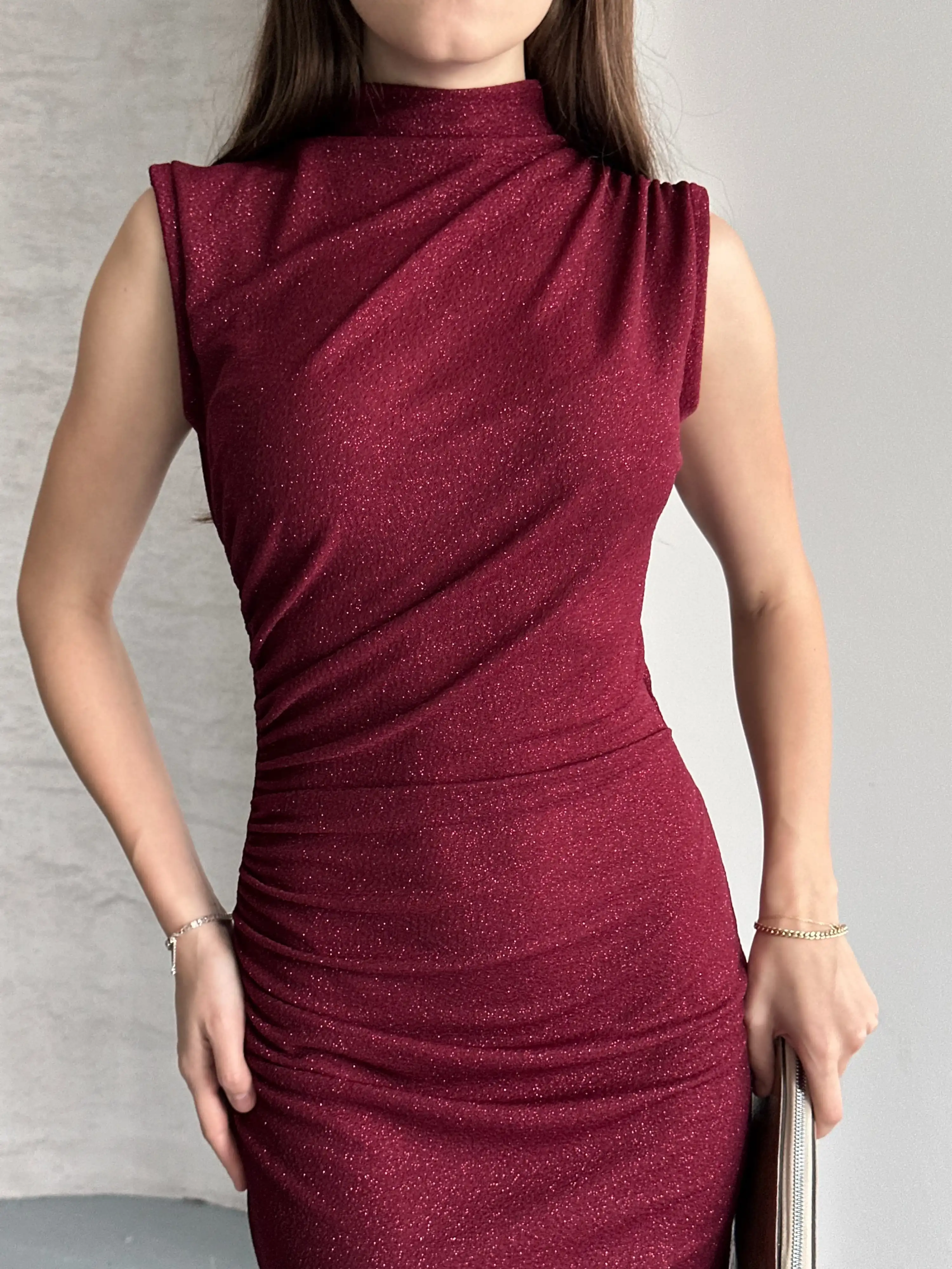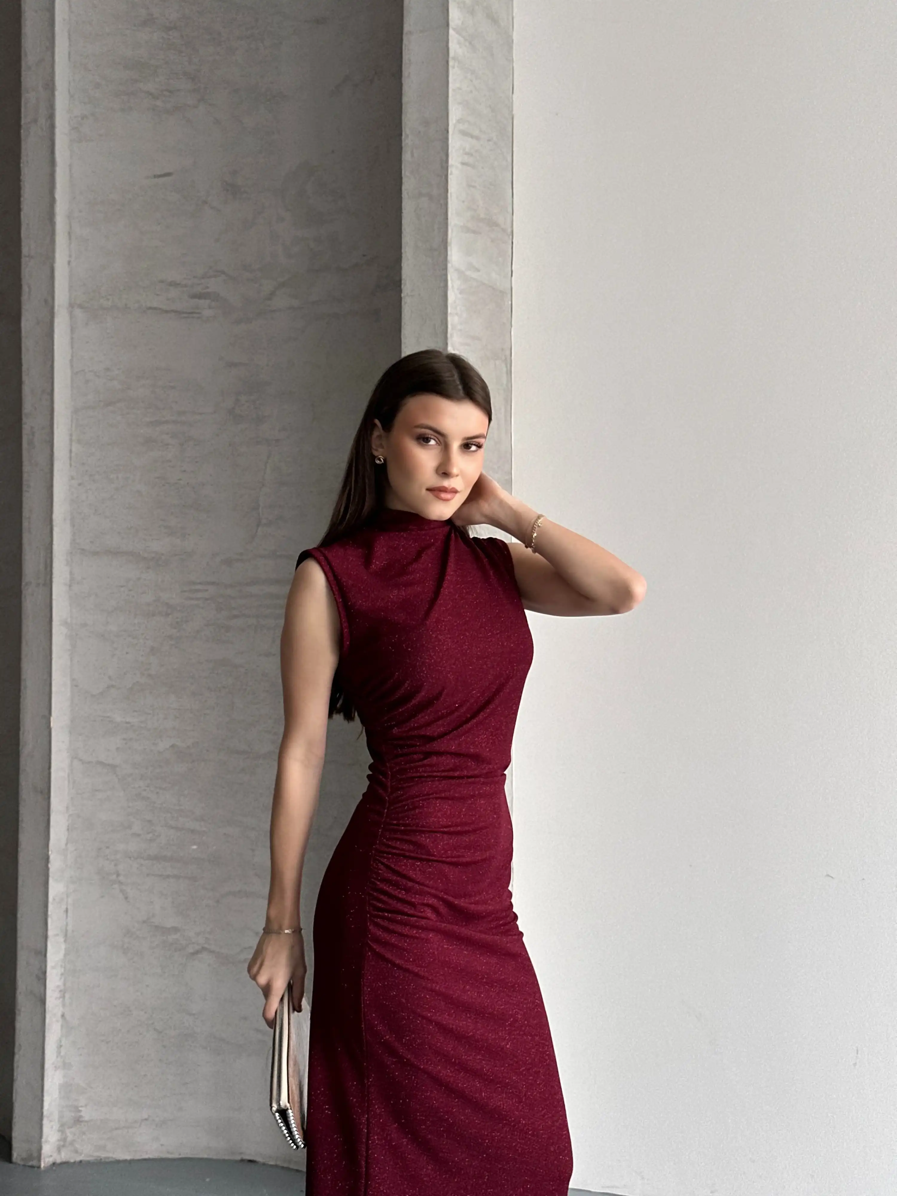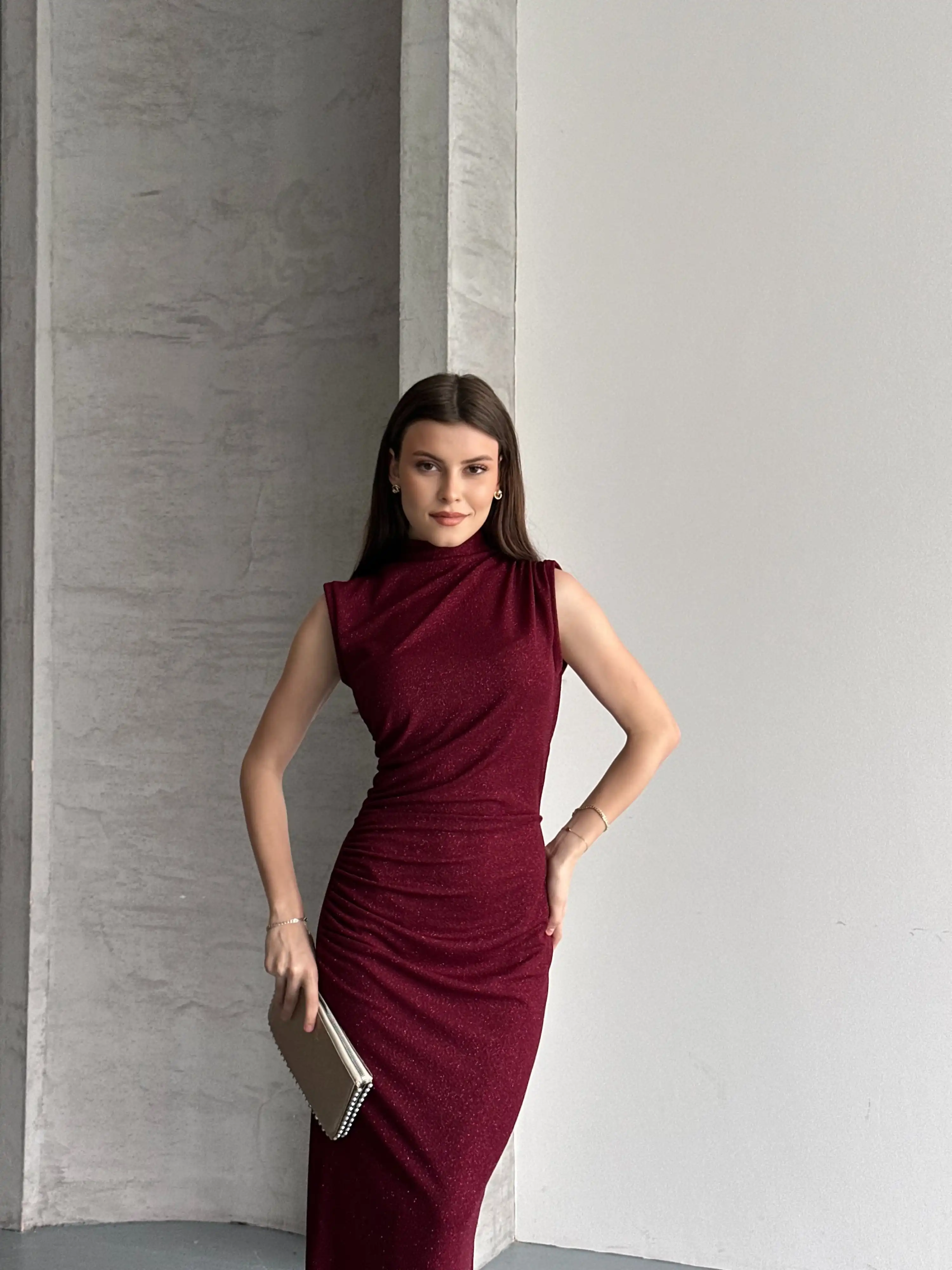 YANDAN YIRTMAÇLI SİMLİ ELBİSE-BORDO