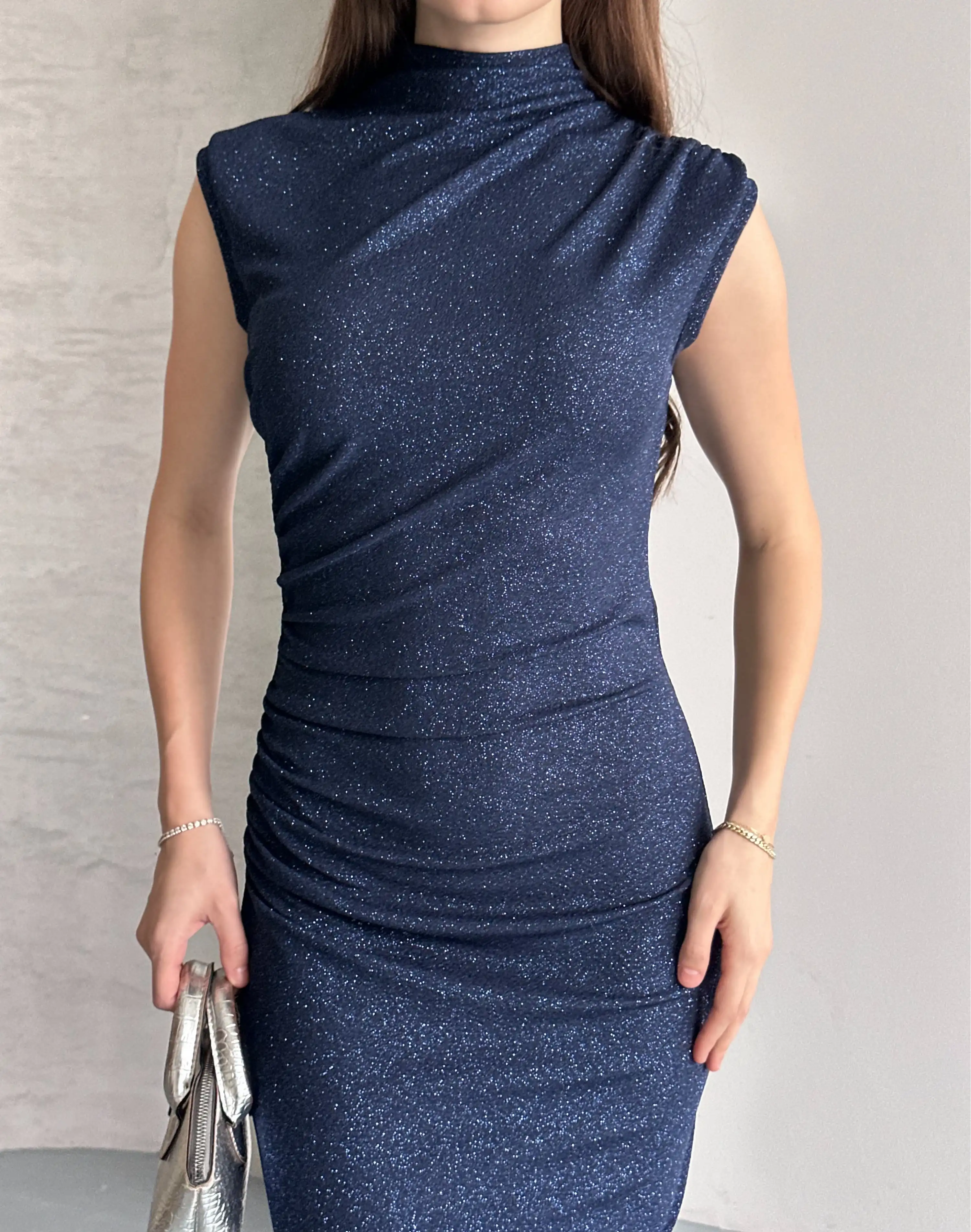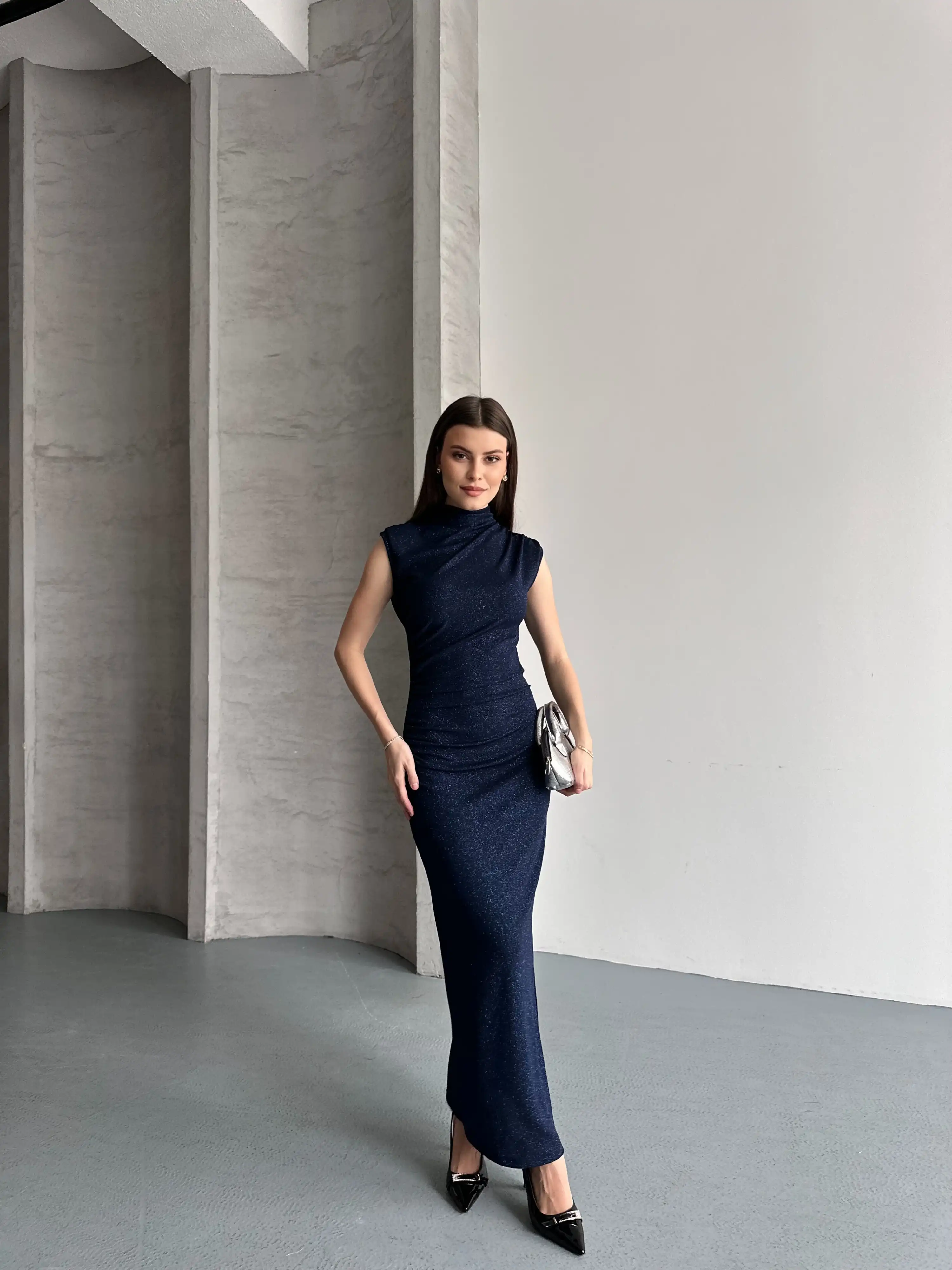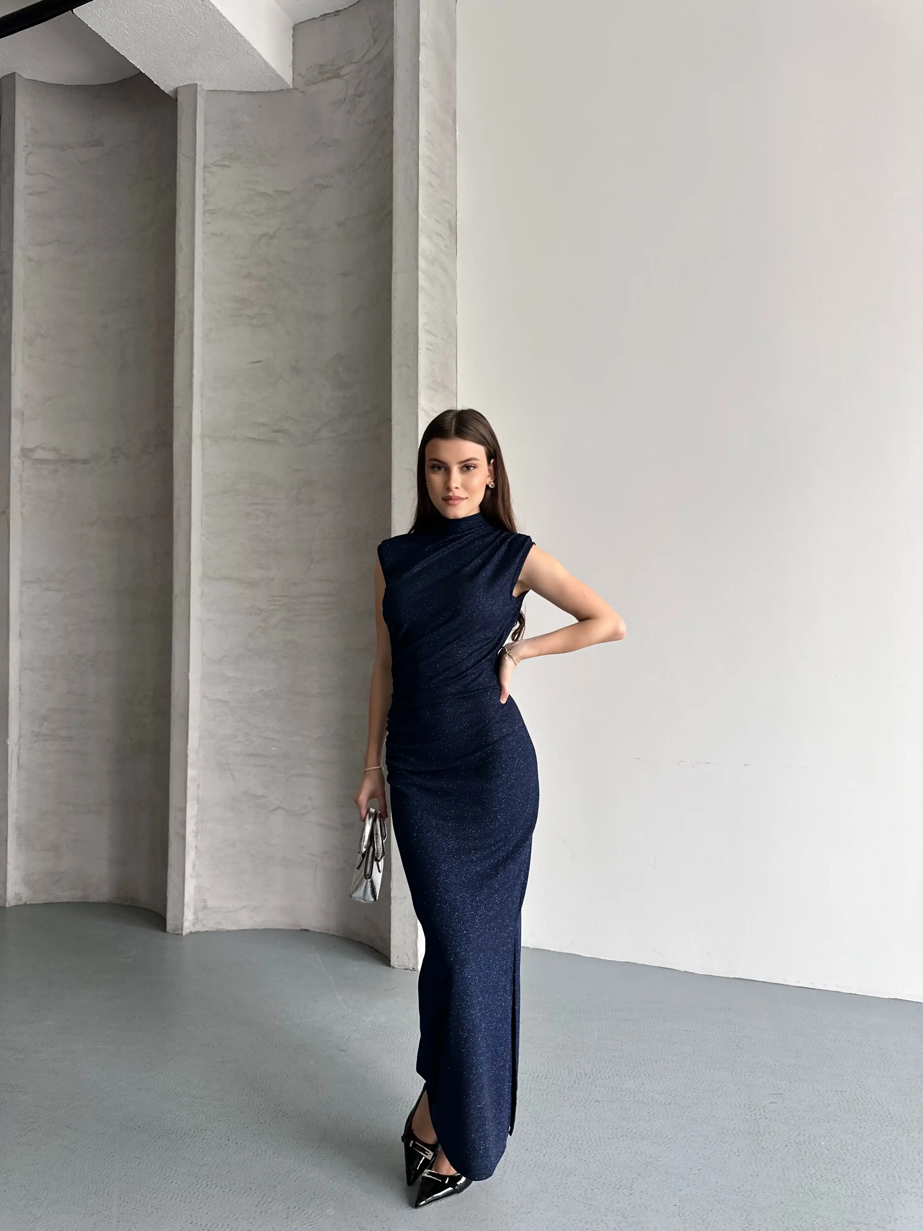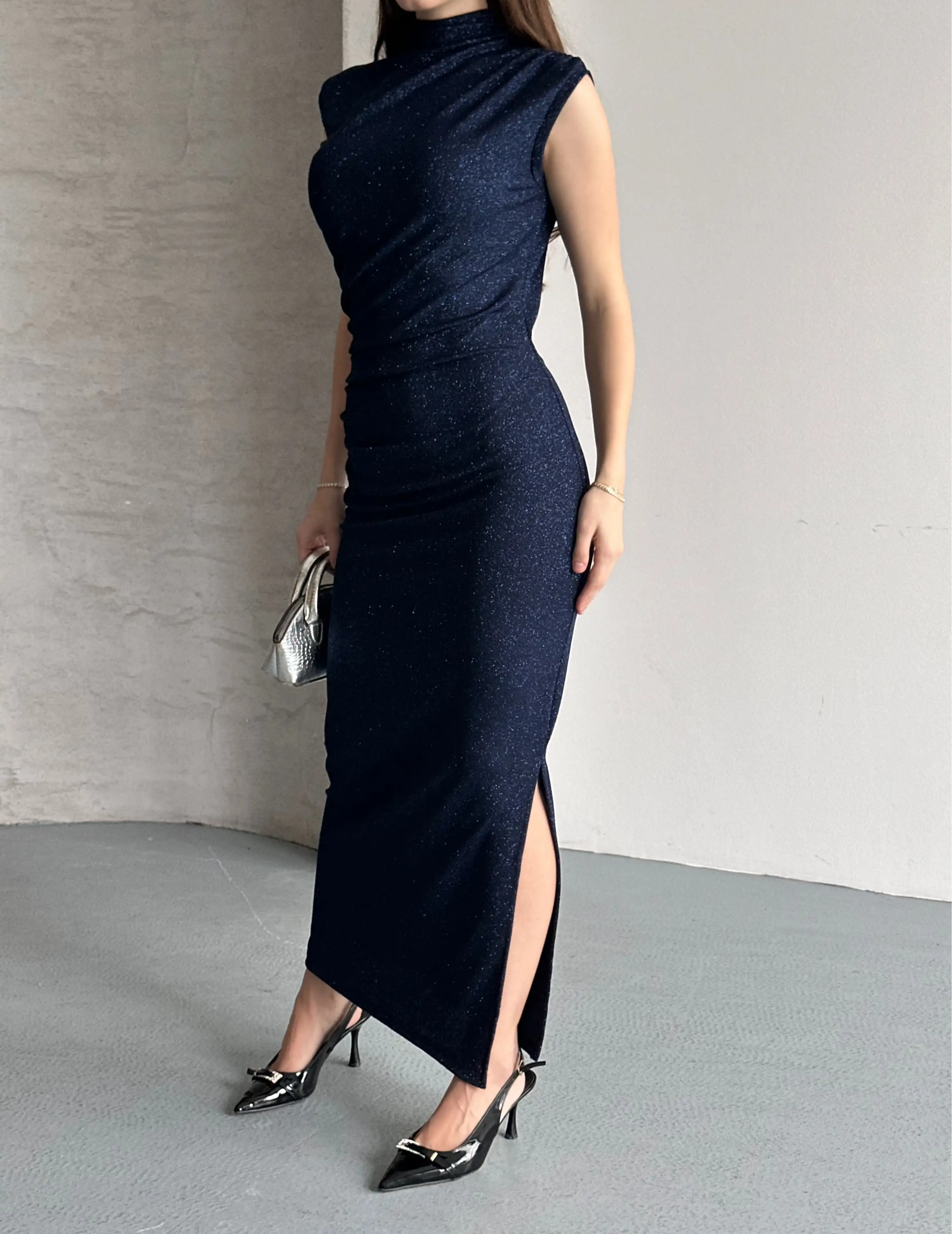 YANDAN YIRTMAÇLI SİMLİ ELBİSE-LACİVERT