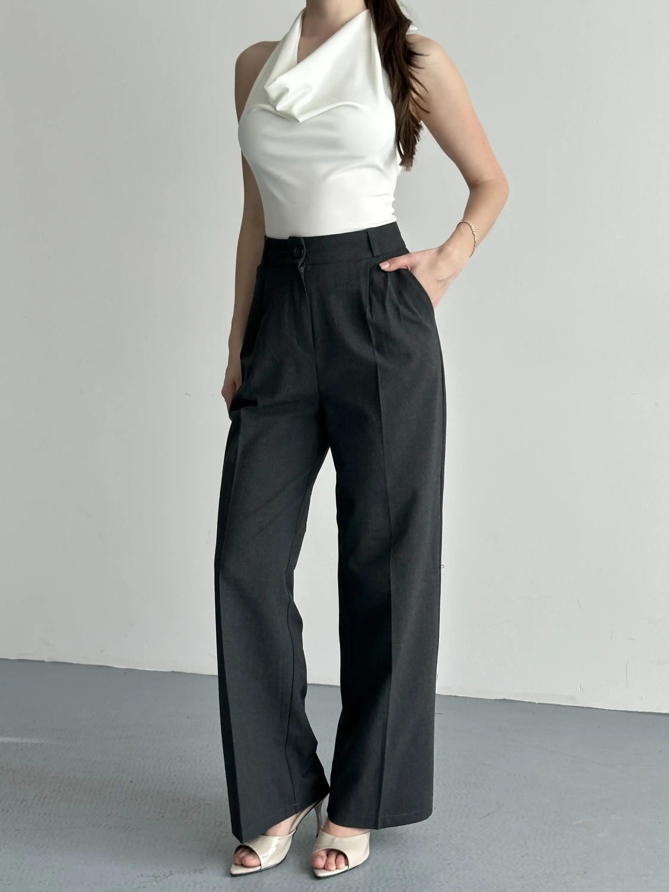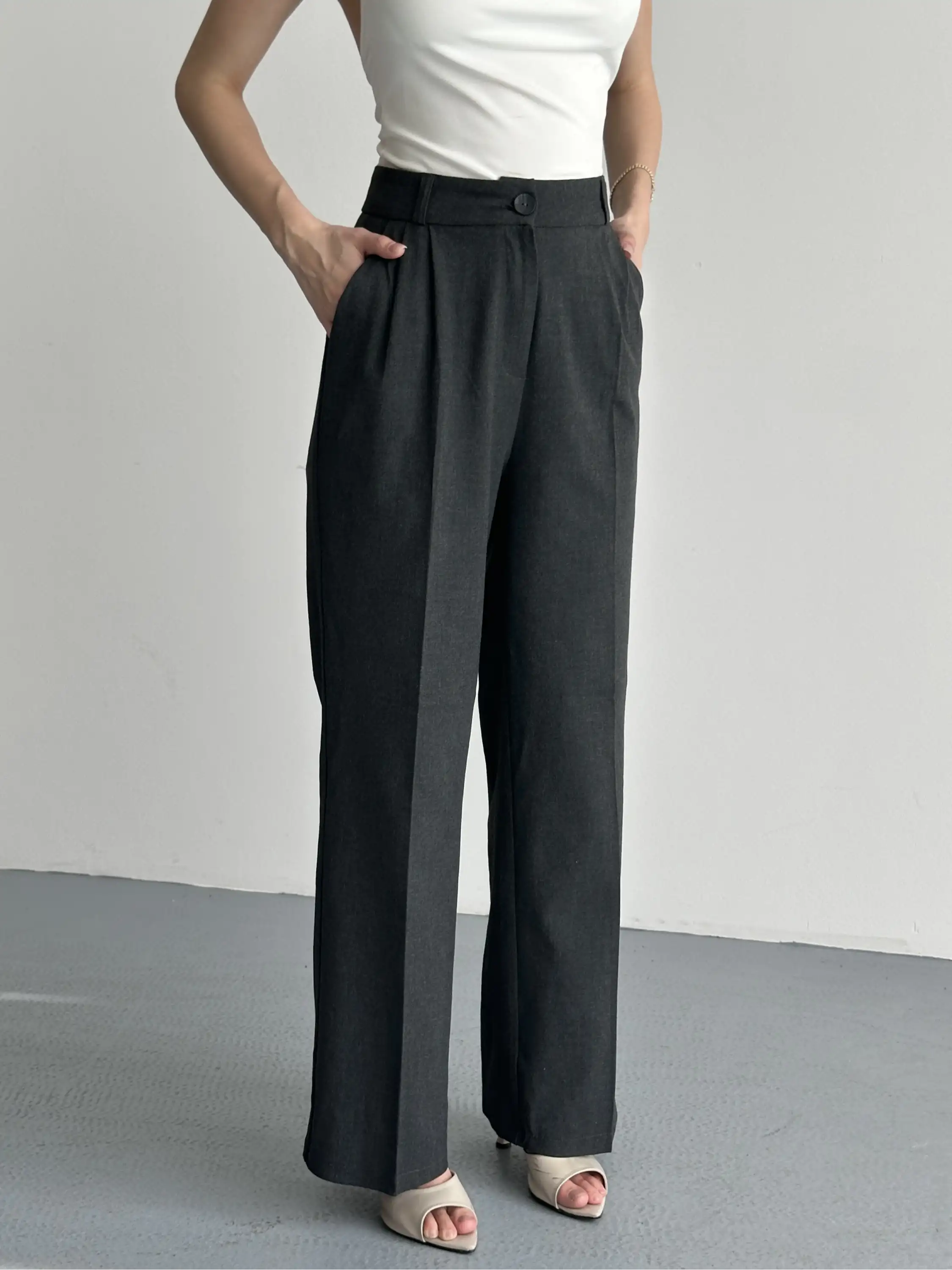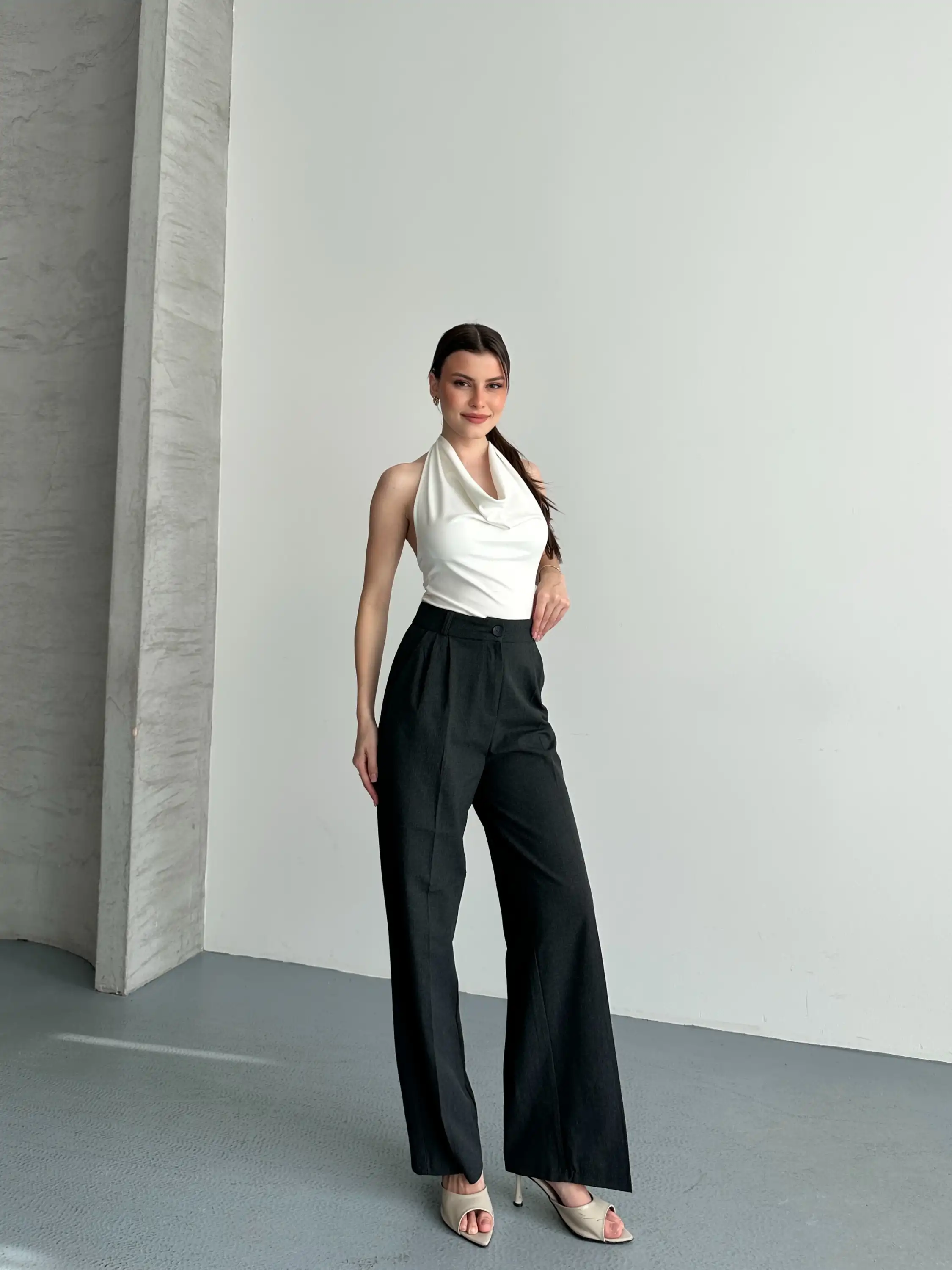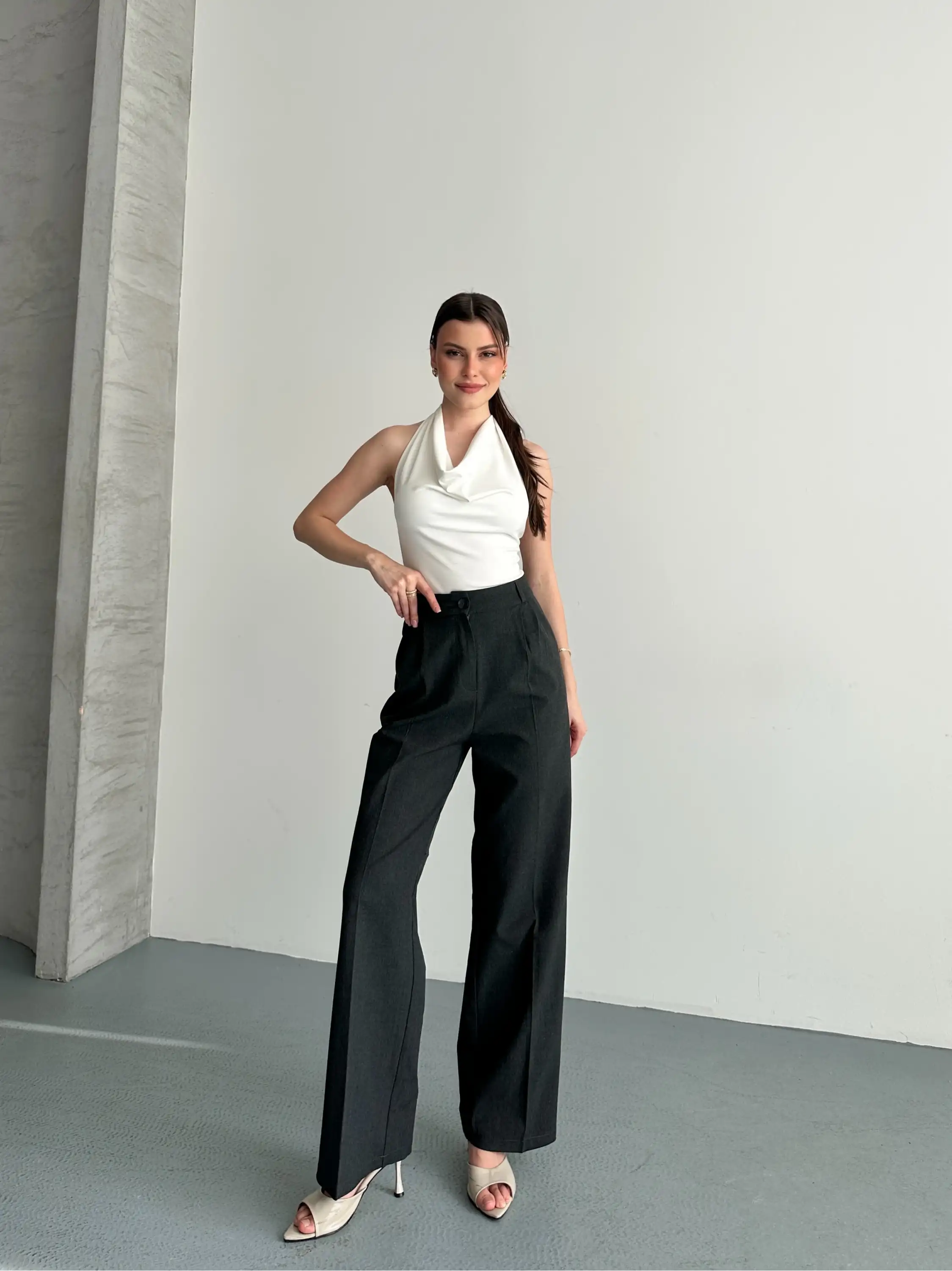 YÜKSEK BEL KETEN PALAZZO PANTOLON-ANTRASİT
